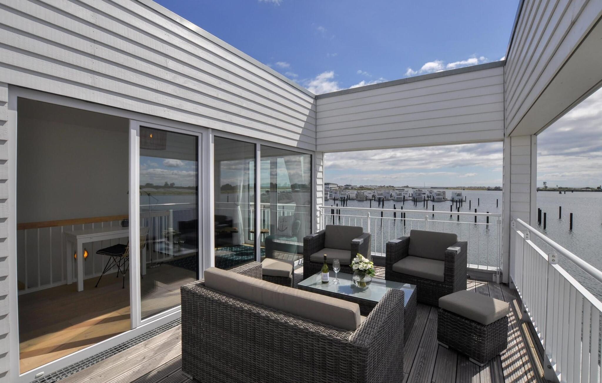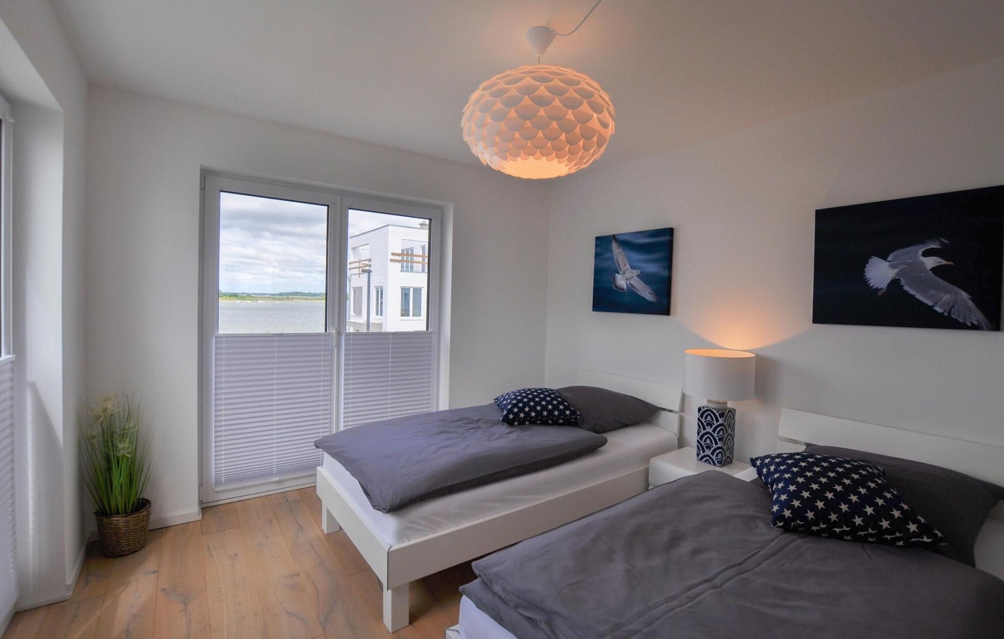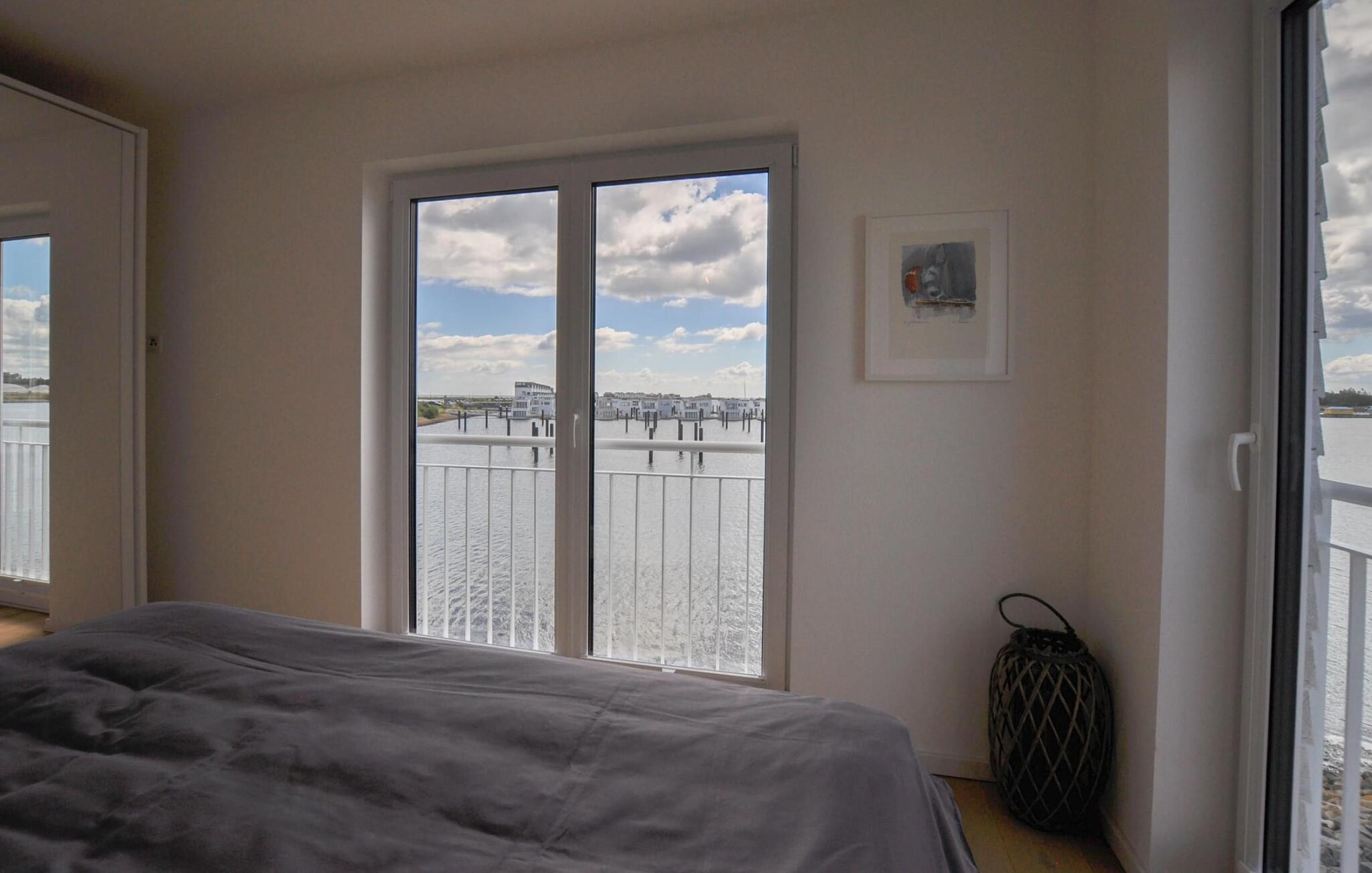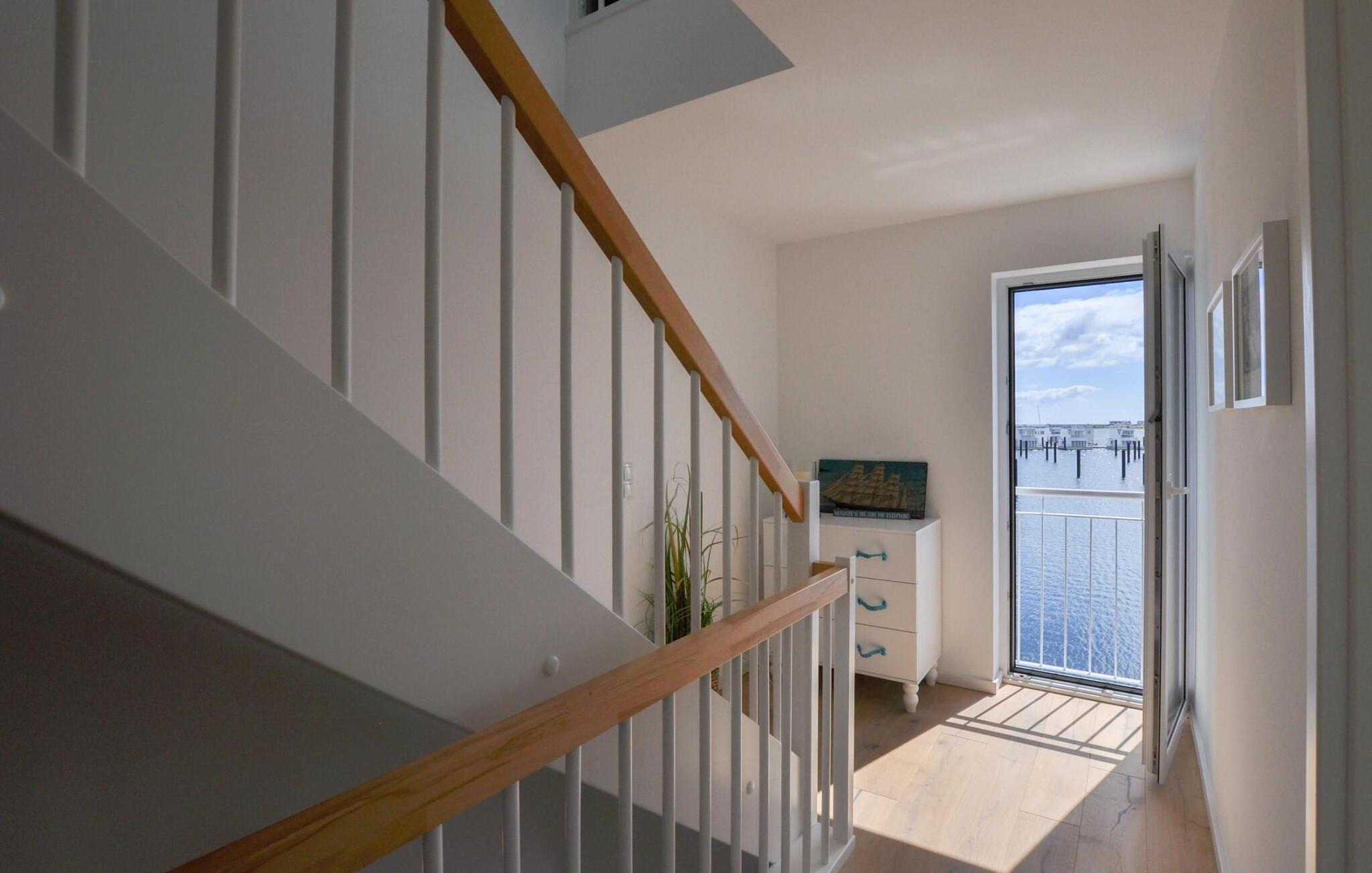 Im ersten Obergeschoss verheißen ein Doppelschlafzimmer mit Blick auf die Marina des Resorts und ein Schlafzimmer mit zwei Einzelbetten und Blick auf die Schlei entspannte Ruhe und angenehme Träume. Das Vollbad mit Whirlwanne und Dusche trägt seinen wohltuenden Anteil dazu bei. Der Höhepunkt des Ferienhauses Nantucket wartet im zweiten Obergeschoss. Dort befinden sich für ein Rundum-Wellnessgefühl eine individuell gestaltete finnische Sauna mit Dusche, ein Studio mit Schlafmöglichkeit für zwei weitere Erwachsene und die beeindruckende Dachterrasse. Von einem Holzrahmen behaglich umgeben, mit weitem Blick auf Hafen, Schlei und Ostsee, lassen sich in komfortablen Loungemöbeln nachhaltige Momente zu jeder Tageszeit erleben und genießen.