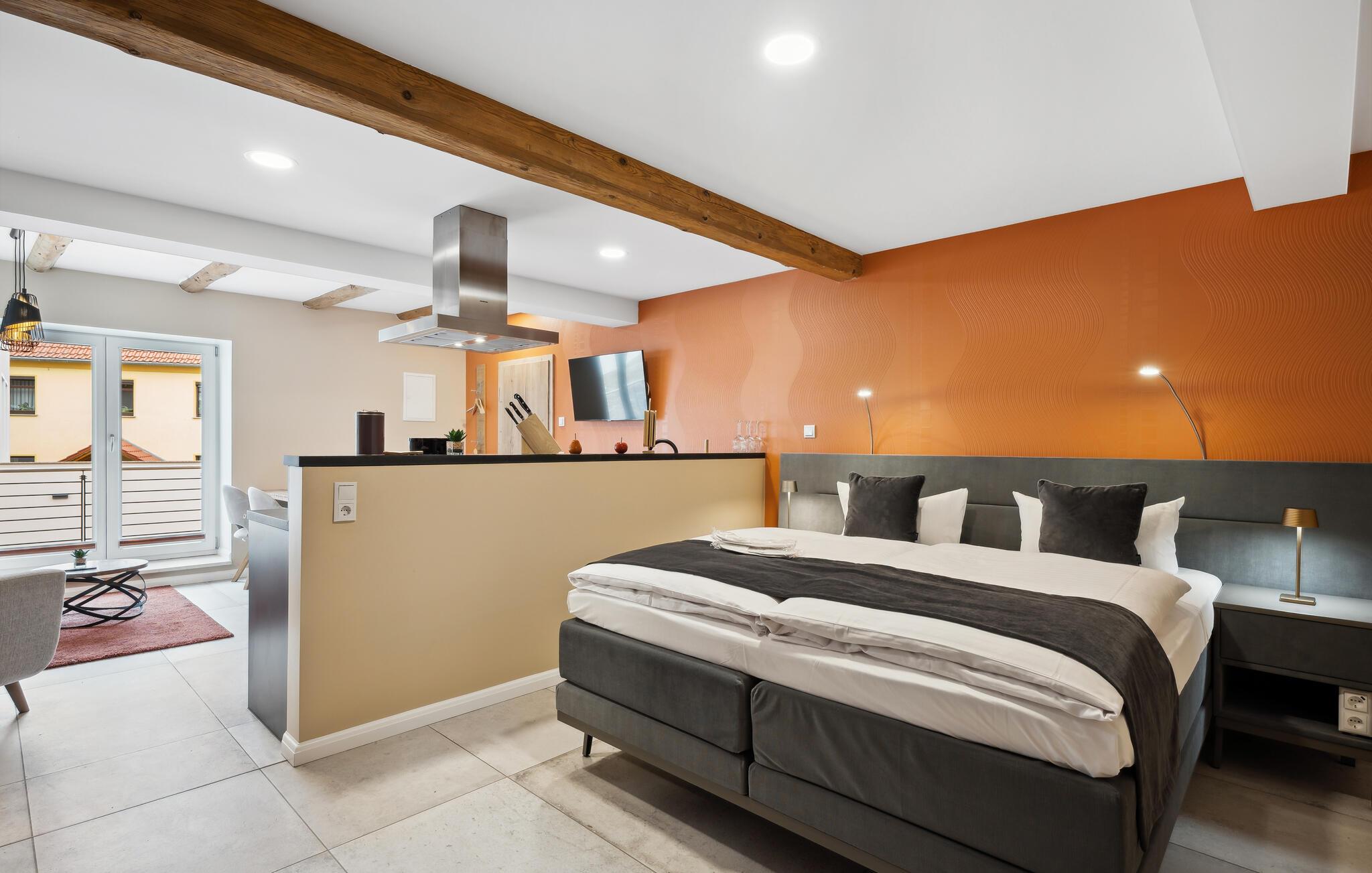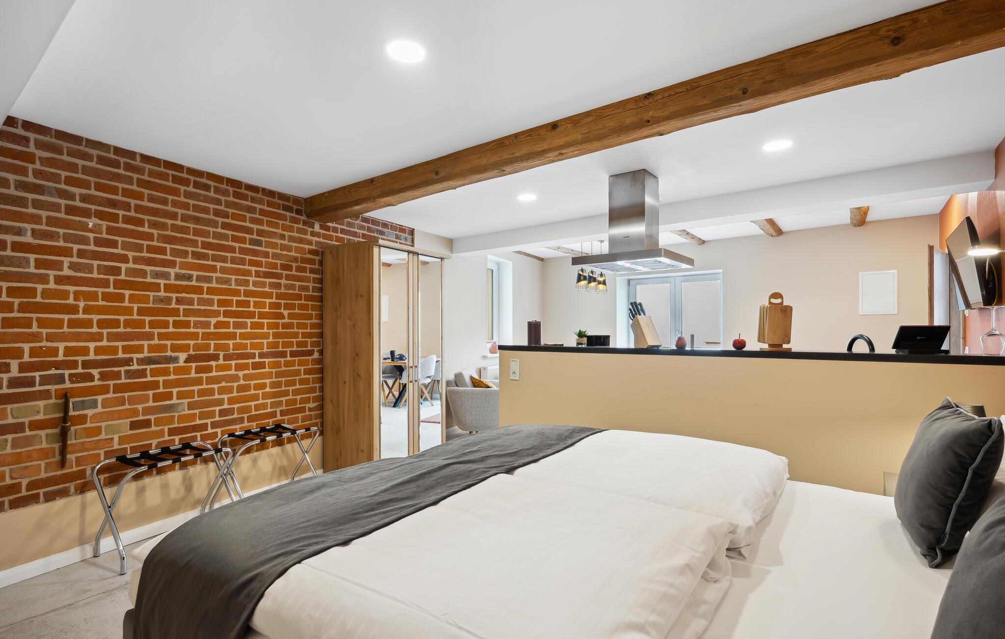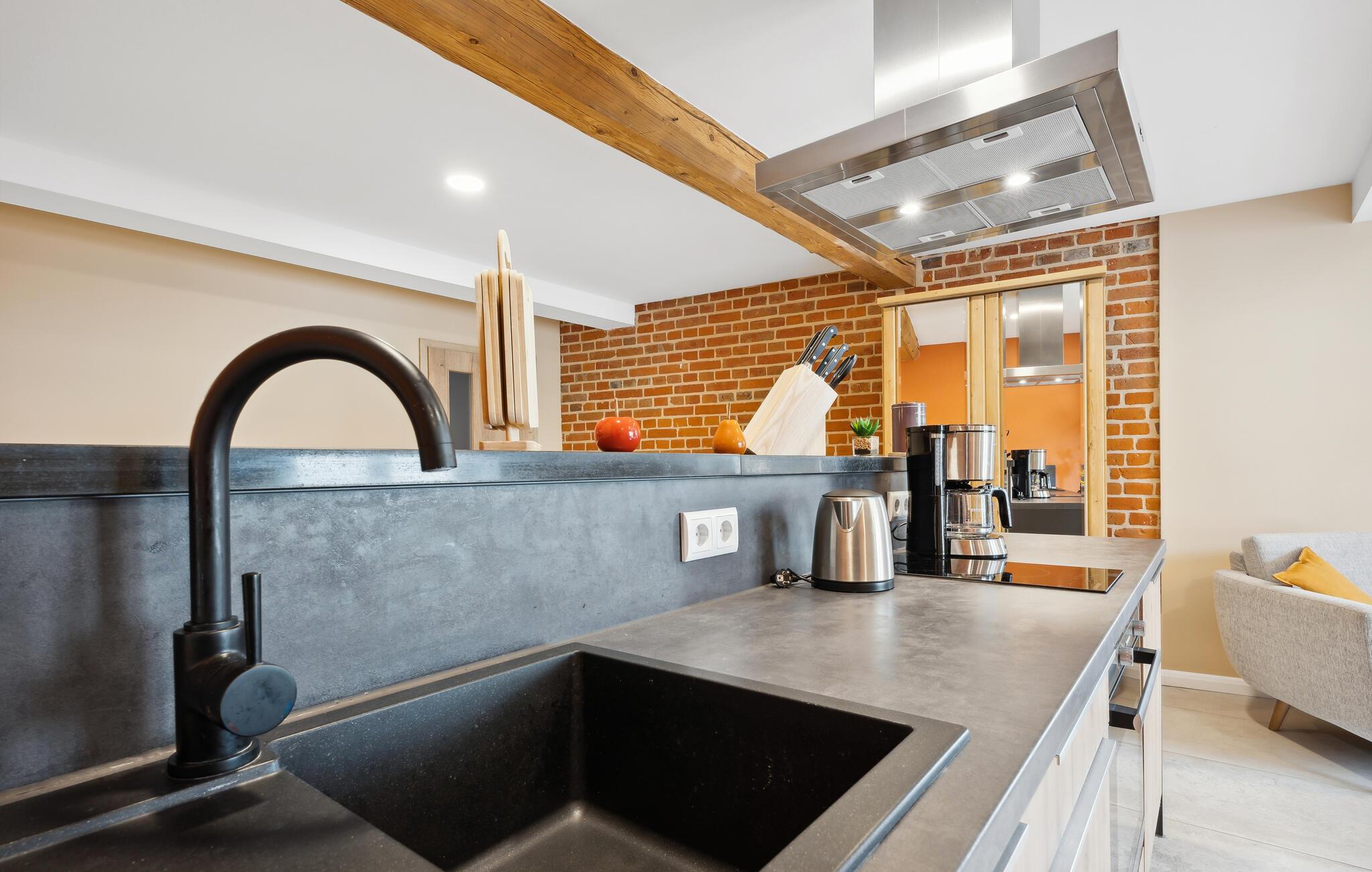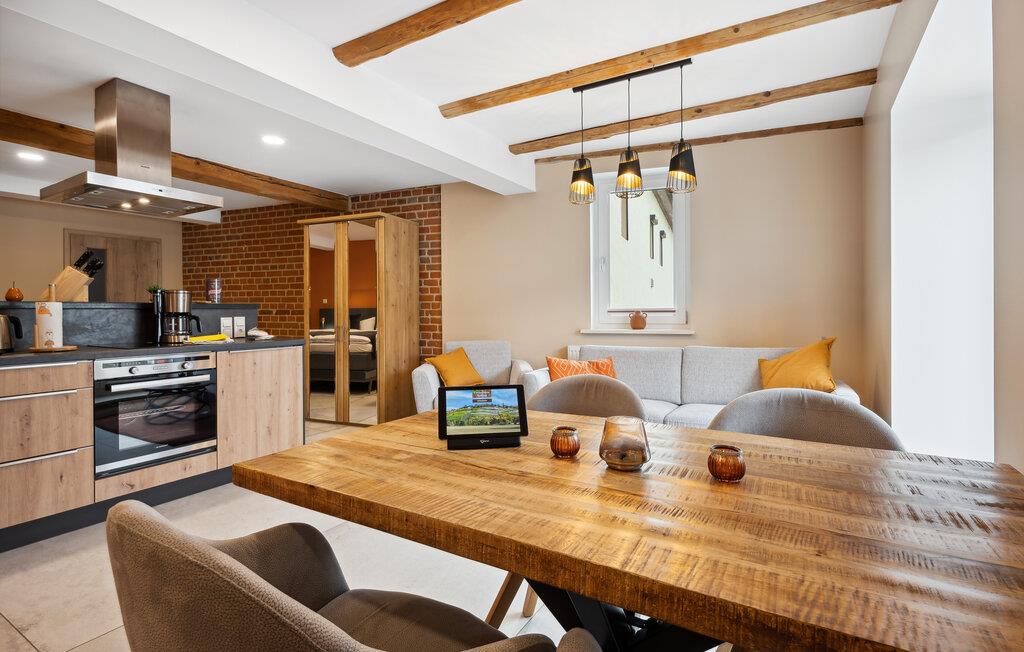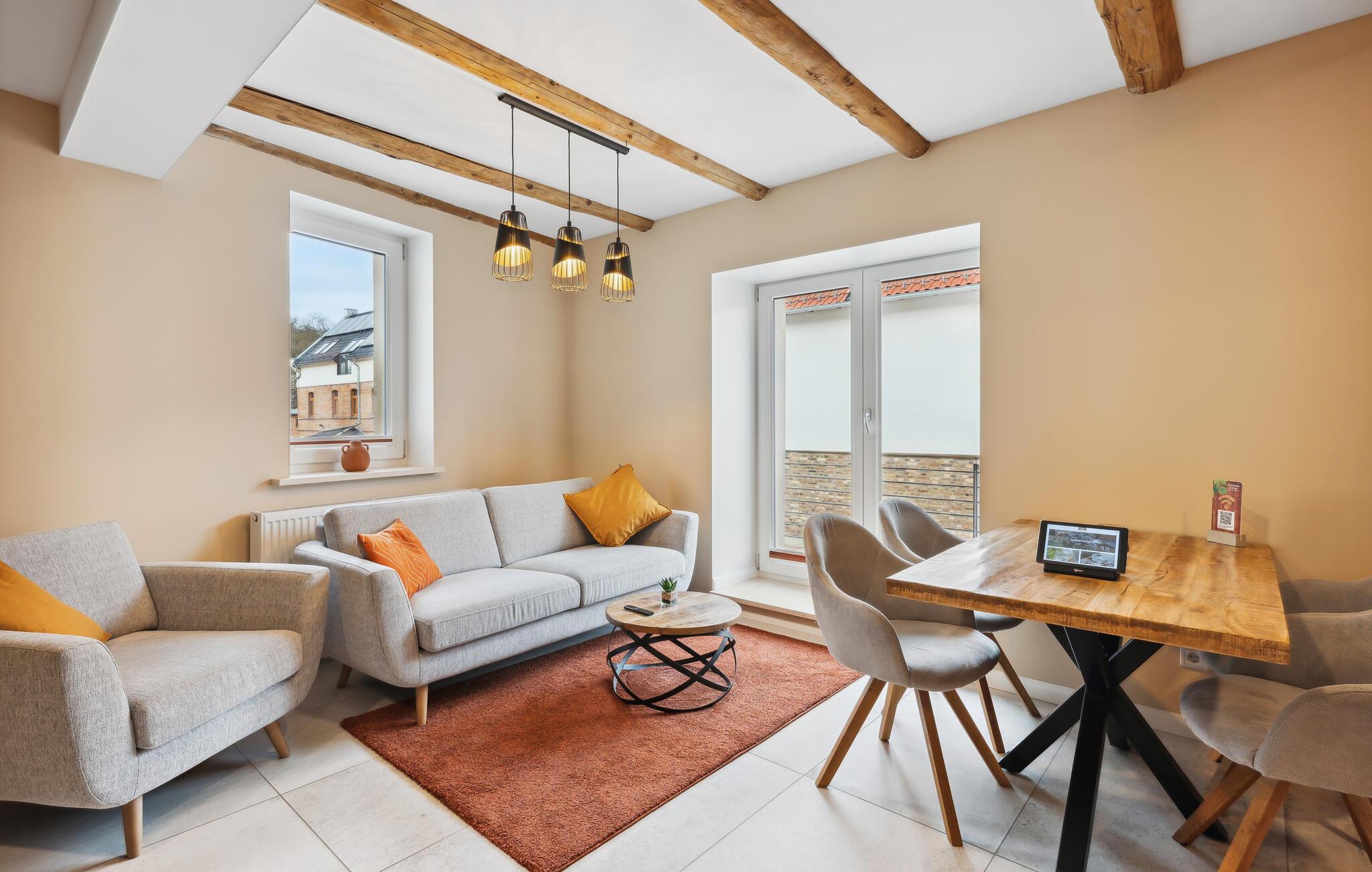 Willkommen in dieser Wohnung, die Sie nahe zahlreichen Aktivitätsmöglichkeiten in naturnaher Lage empfängt. Einladende Räume mit geschmackvoller Einrichtung und aparten Deckenbalken bilden eine angenehme Basis für eine erholsame Auszeit zu zweit, in der auch Erkundungen der Umgebung nicht zu kurz kommen. Stärken Sie sich mit einem leckeren Frühstück und schmieden Sie Pläne für den Urlaubstag, der vor Ihnen liegt.