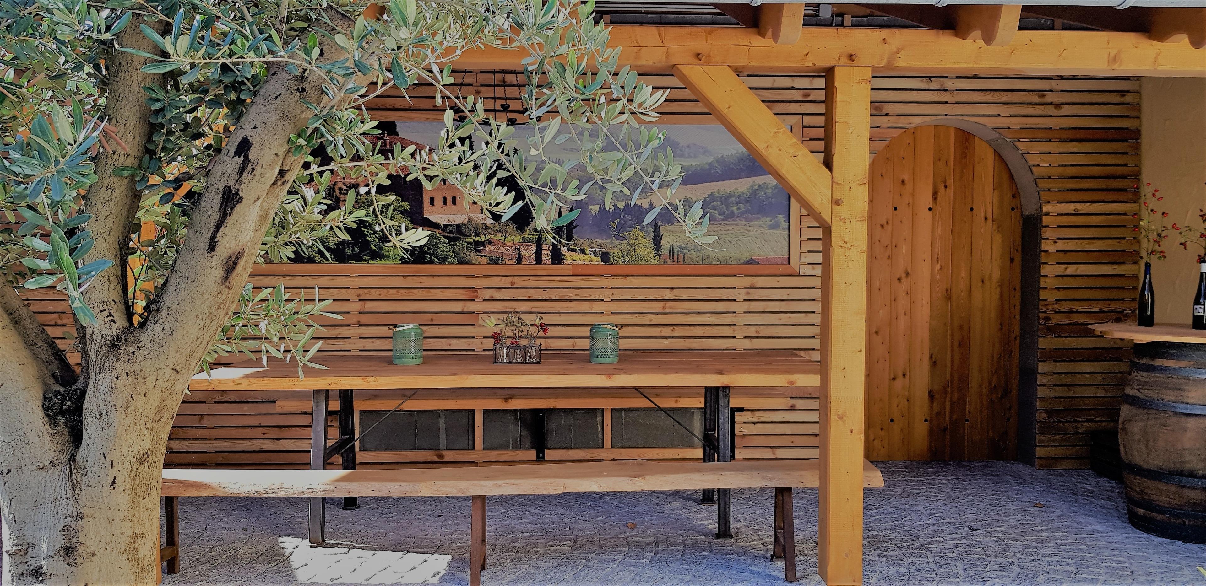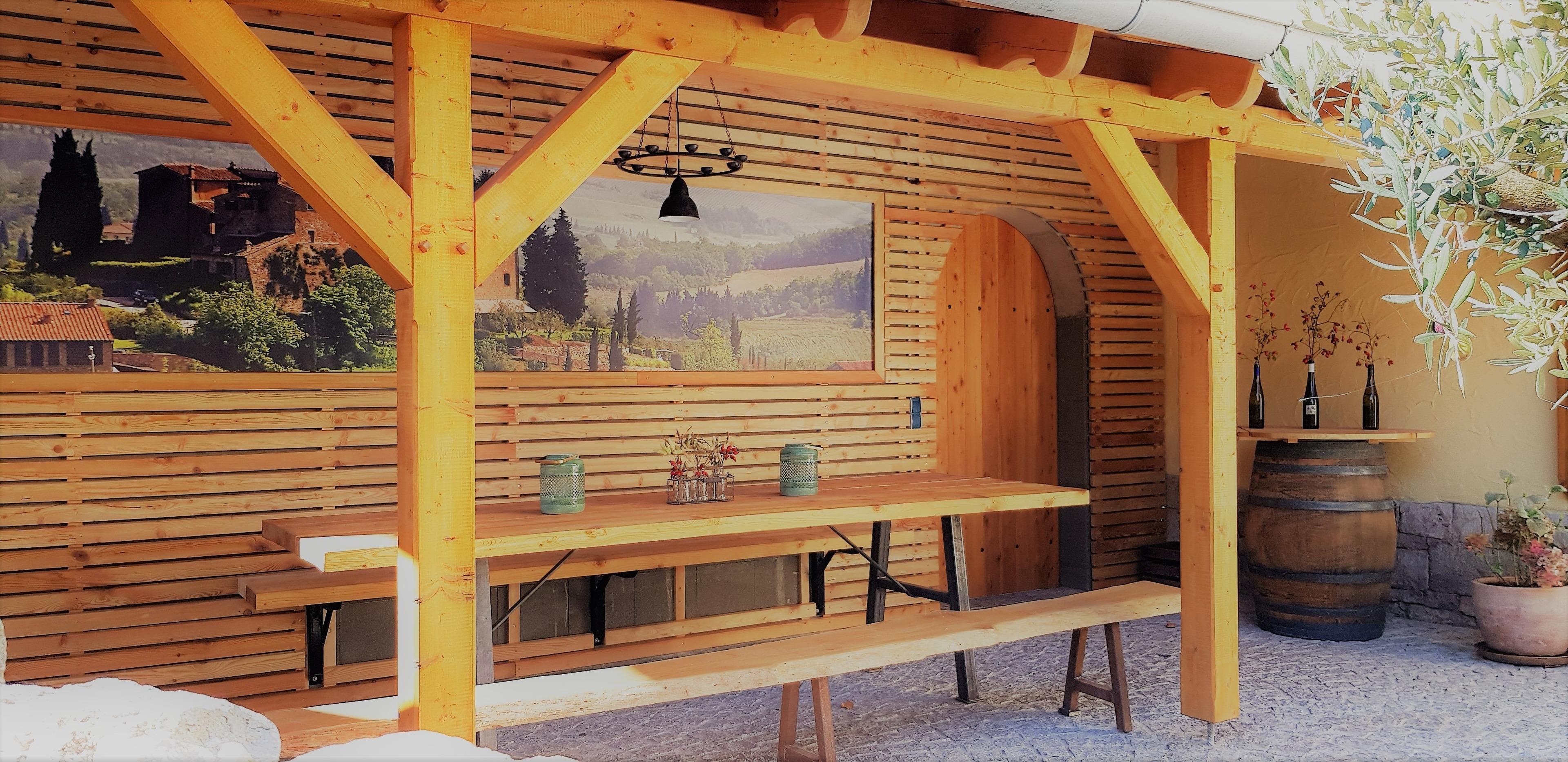Im Außenbereich / Hof befindet sich eine große Sitzecke im toskanischen Stil, hier kannst du ein Frühstück oder am Abend ein Glas Wein genießen.