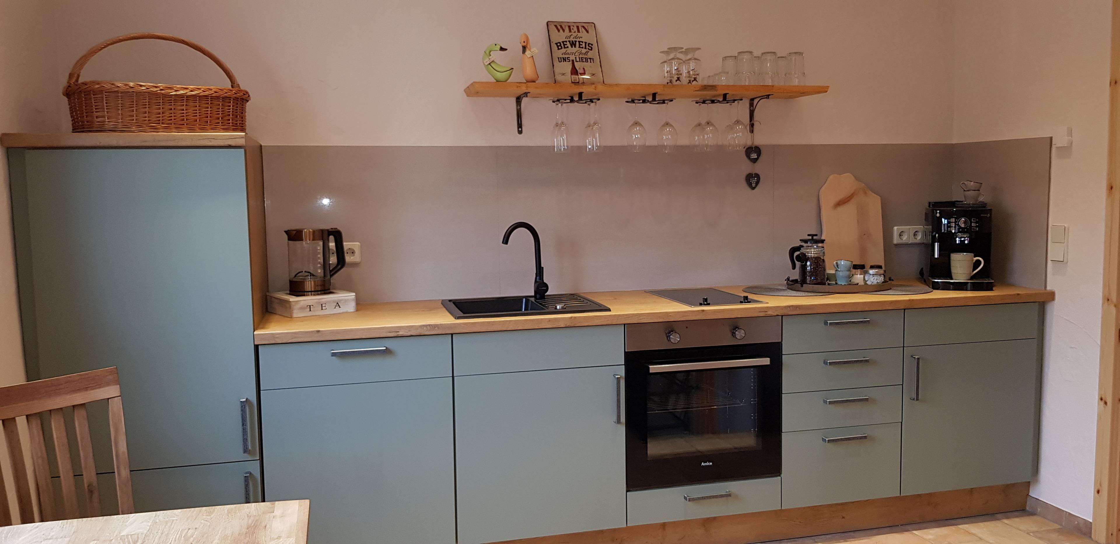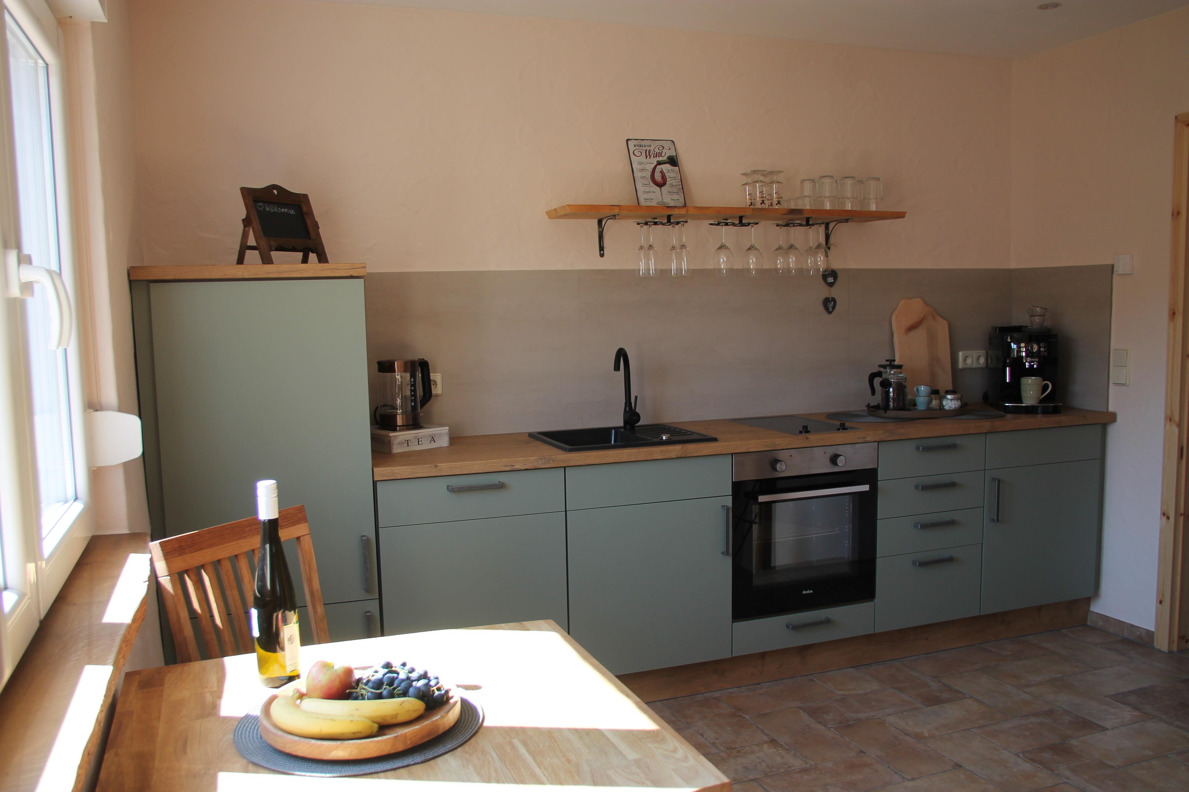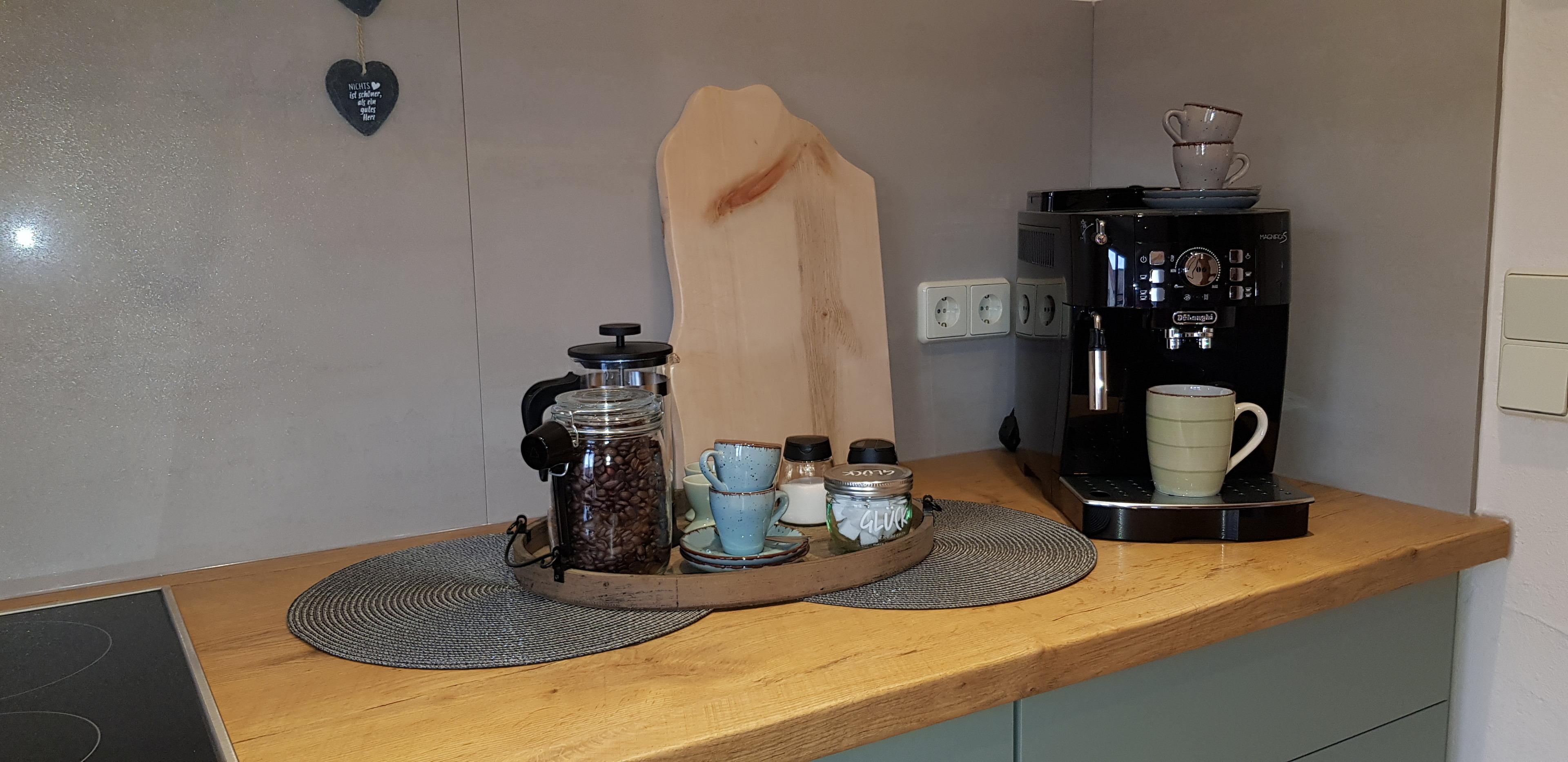 Die Wohnung hat eine komplett eingerichtete Küche mit Sitzbereich. Selbstverständlich steht Ihnen ein Kaffeevollautomat, Toaster, Wasserkocher und Teesortiment zur Verfügung.