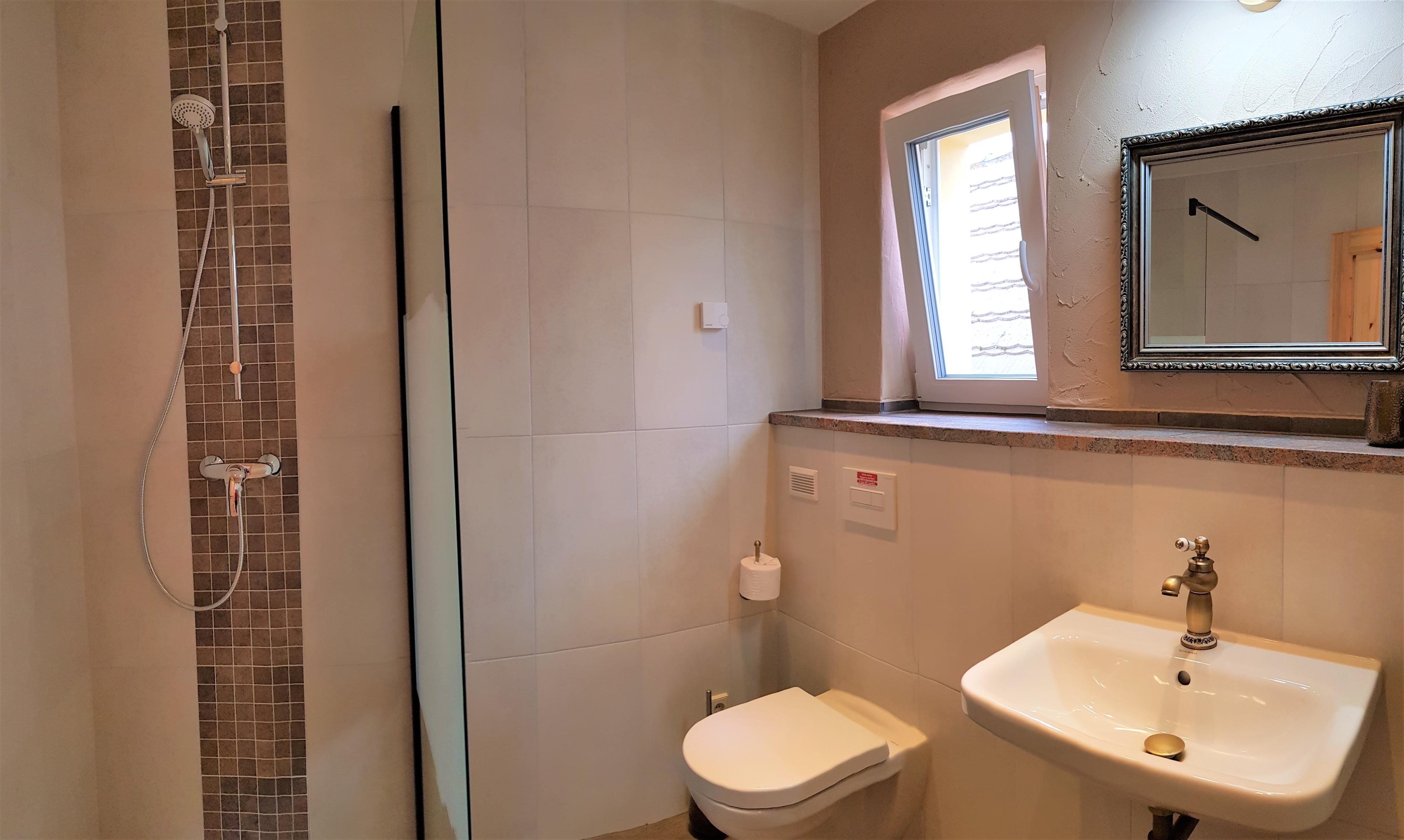 In beiden modernen Bädern stehen eine Dusche, ein Fön und auch Handtücher für Sie bereit.
