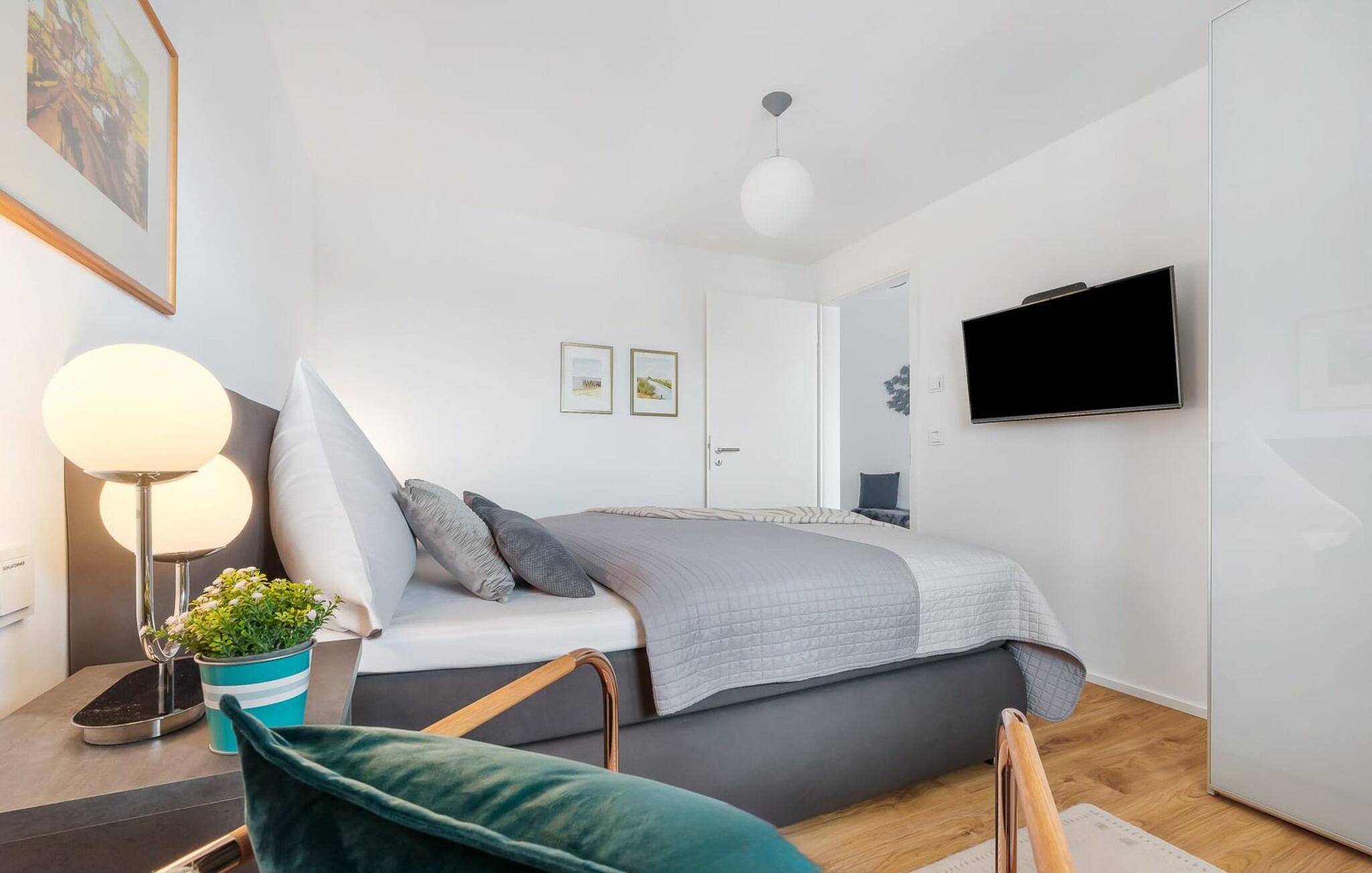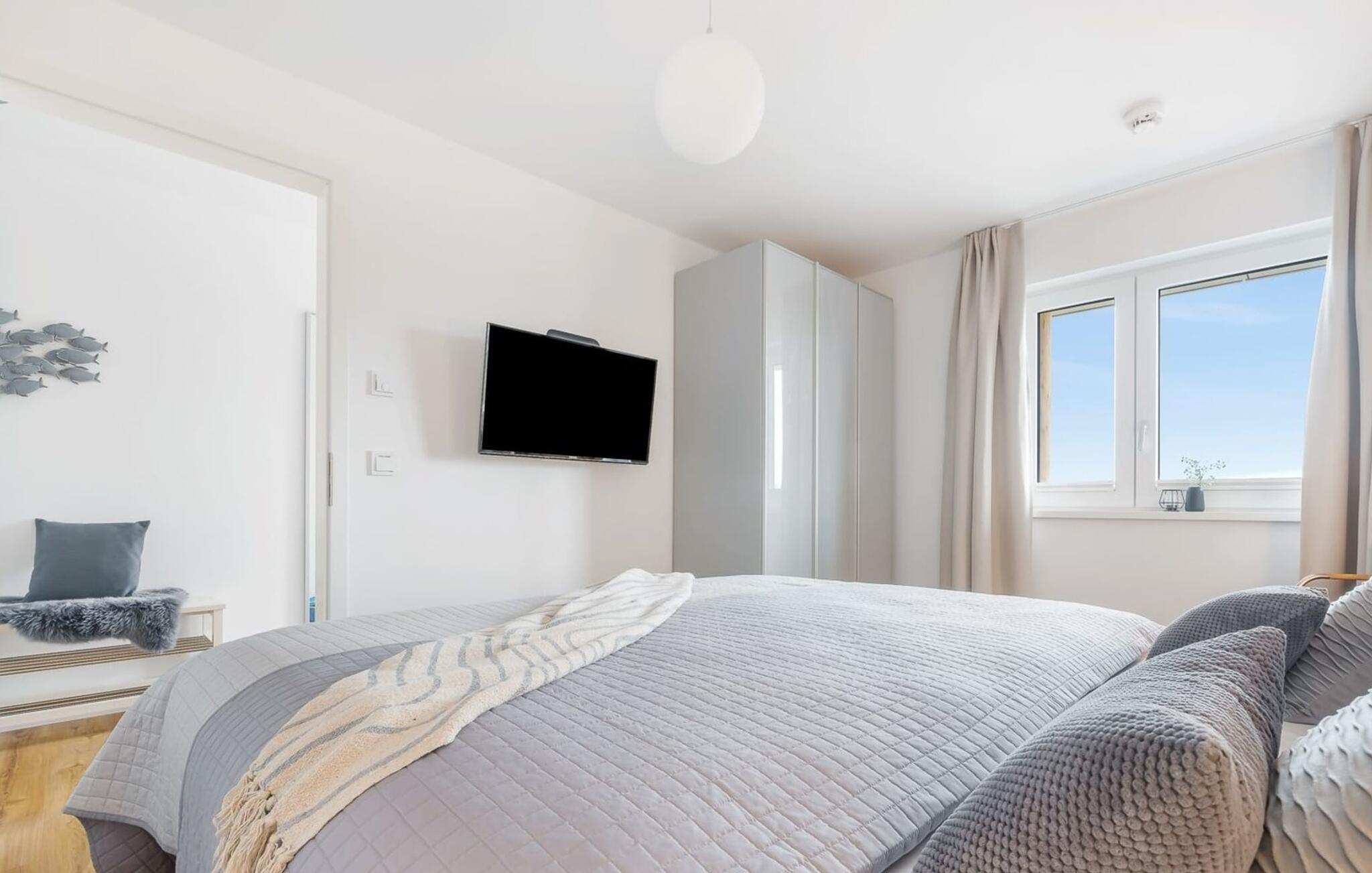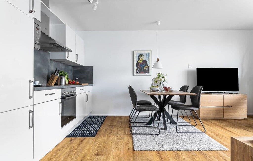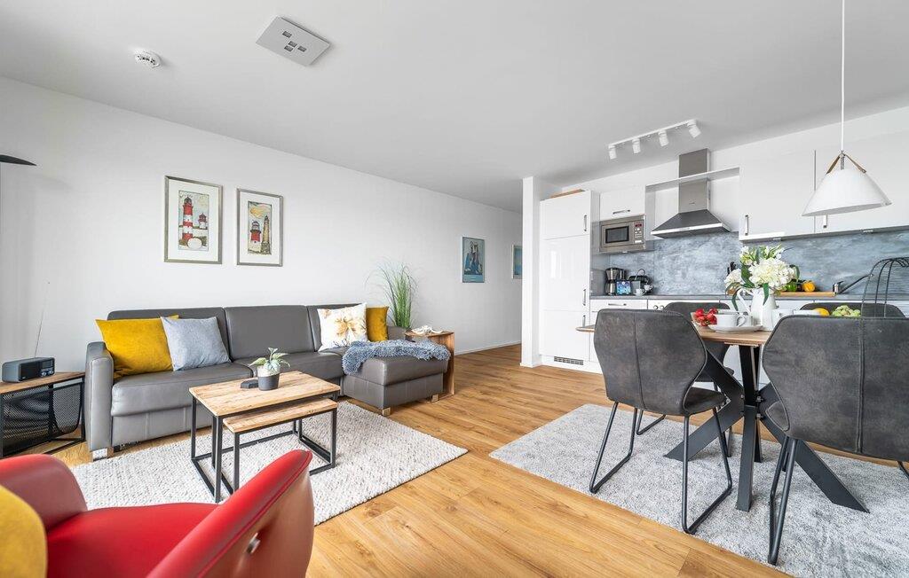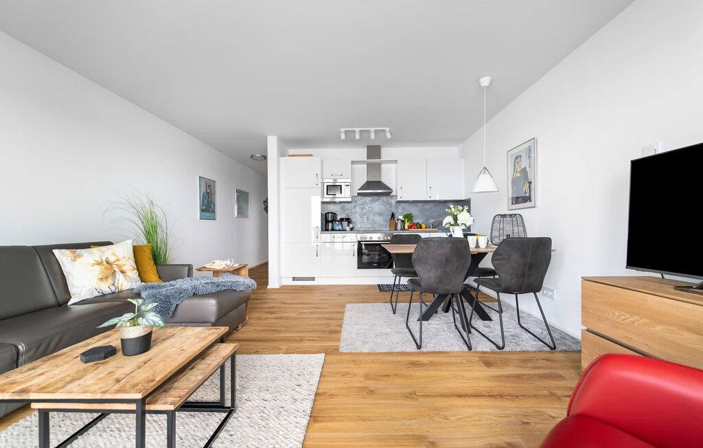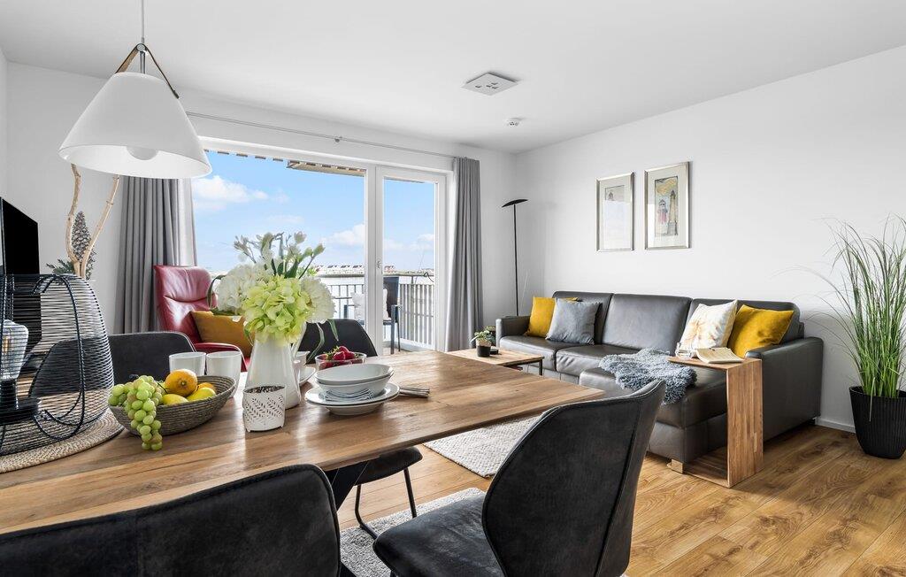 Diese schöne, helle Ferienwohnung mit ihren 56 m 2 liegt im 2. Obergeschoss der Hafenpromenade direkt in der ersten Reihe zum Wasser und bietet euch mit ihrer exklusiven Einrichtung und Ausstattung die behagliche Atmosphäre für euren Luxusurlaub. Die Lage ist perfekt, zentral aber ruhig, direkt an der Hafenpromenade mit kurzen Wegen zum Einkaufen und den besten Möglichkeiten zum Flanieren. Zudem beeindruckt die Ferienwohnung durch die gelungene räumliche Verbindung der modernen Küchenzeile mit Vollausstattung und dem exklusiven Wohnbereich. In diesem findet ihr ein Highboard mit TV, Ledercouch mit Longchair, die mit wenigen Handgriffen in ein zusätzliches Bett (120 x 200 cm) umgewandelt werden kann. Ein gemütlicher Sessel lädt zum Relaxen ein und viele weitere Accessoires bieten euch viele Möglichkeiten, sich wohl zu fühlen.