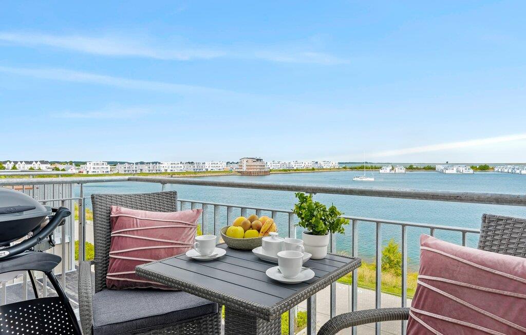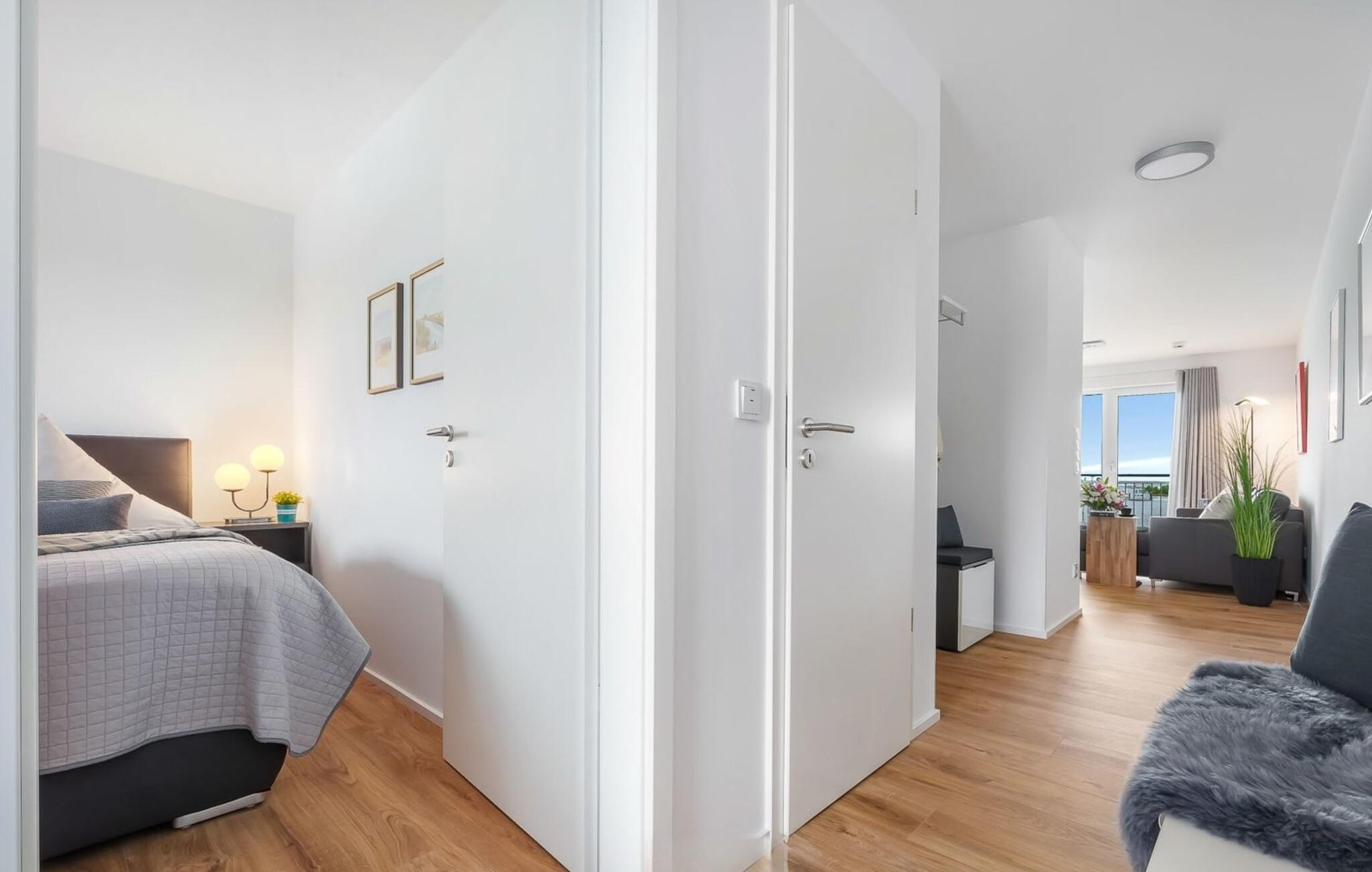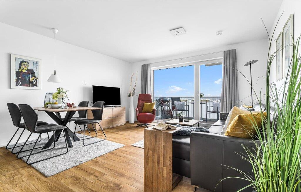 Öffnet die Wohnungstür, tretet ein und blickt durch Flur, Wohnzimmer, die bodentiefen Fenster über den Balkon direkt auf Yachthafen und Schleimündung. Ein phantastischer Weitblick bis zur Ostsee bietet euch Urlaubs- und Entspannungsatmosphäre von der ersten Sekunde an!