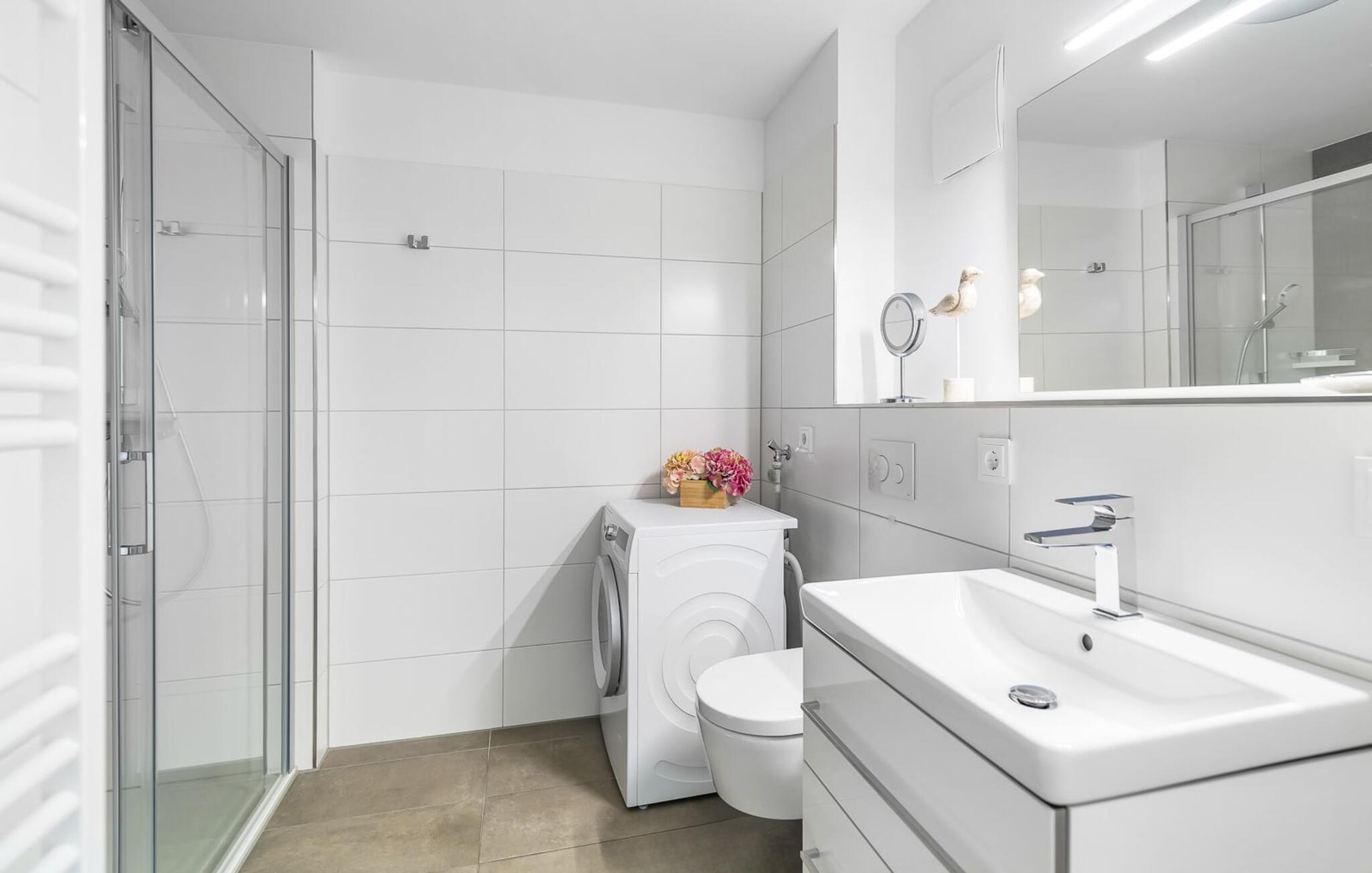 Das schöne Bad verfügt über eine moderne, bodengleiche Dusche, einen Waschtisch mit Unterschrank und einen großen Spiegel.