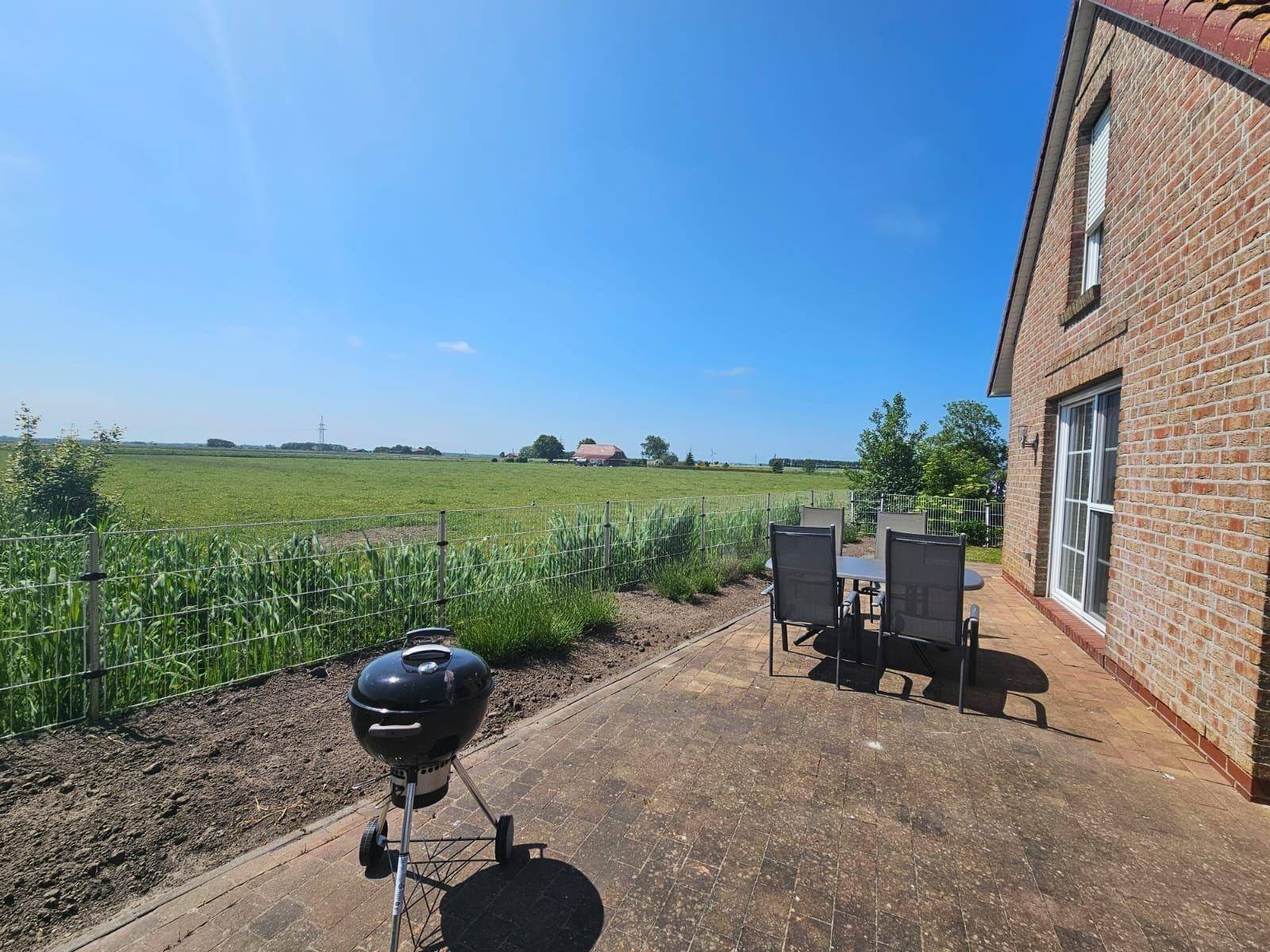 Die Ferienwohnung bietet einen einladenden Außenbereich mit einer privaten Terrasse und einem eigenen Garten. Gäste können entspannen und die Sonne auf der Liegewiese genießen. Ein Holzkohlegrill steht bereit, um gemütliche Grillabende unter freiem Himmel zu verbringen. Hier wird Erholung und Genuss in einer ruhigen Atmosphäre großgeschrieben.