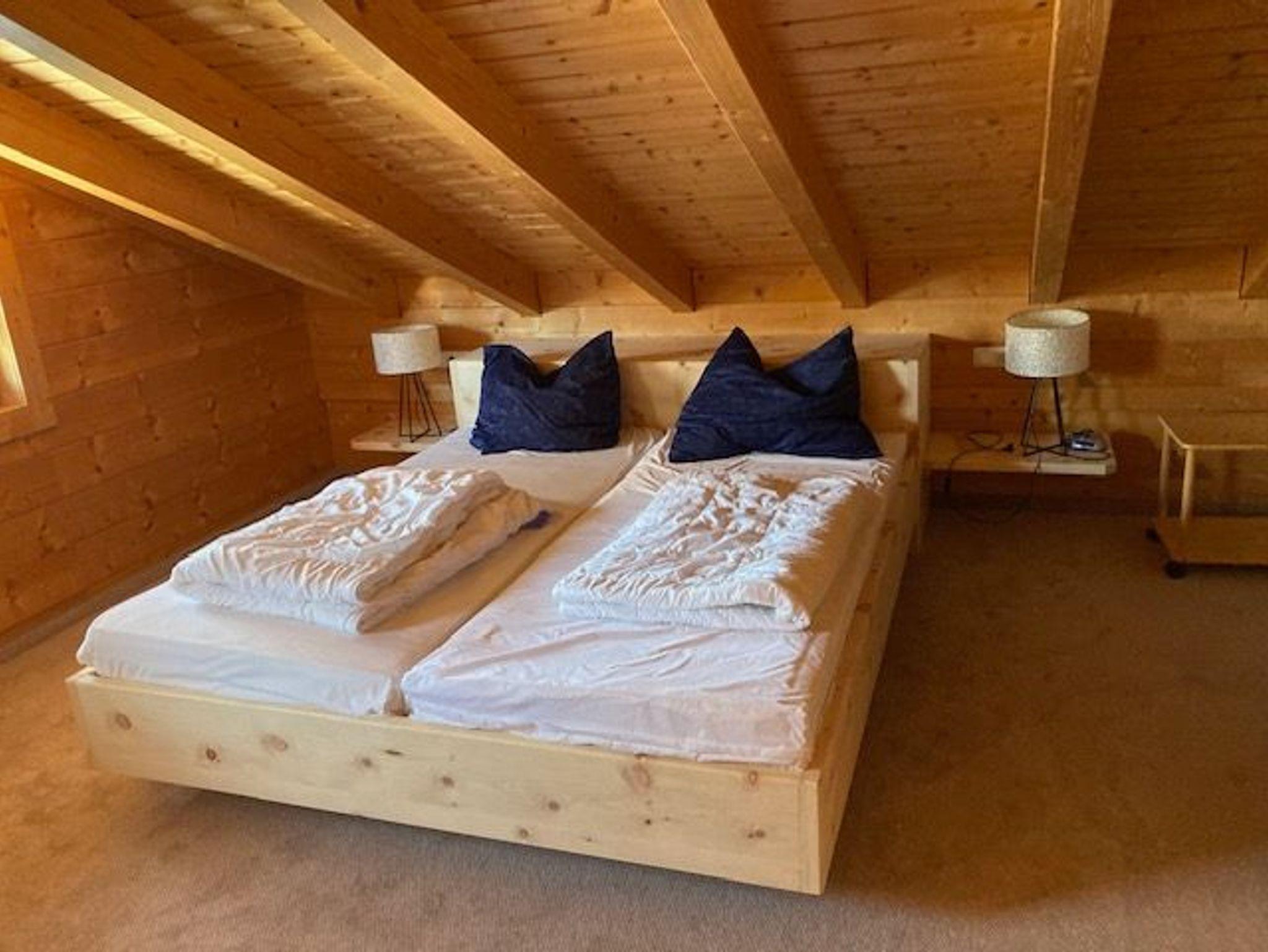 Dachgeschoss: Großes Schlafzimmer mit Zirben-Doppelbett, Babyklappbett; gemütliche, helle Nische mit Schreibtisch und Regalen sowie einen direkten Zugang zum Bad mit WC und Waschbecken. Das Kinderzimmer ist mit zwei breiten Einzelbetten mit Federkernmatratzen (1,20 x 2m) ausgestattet.