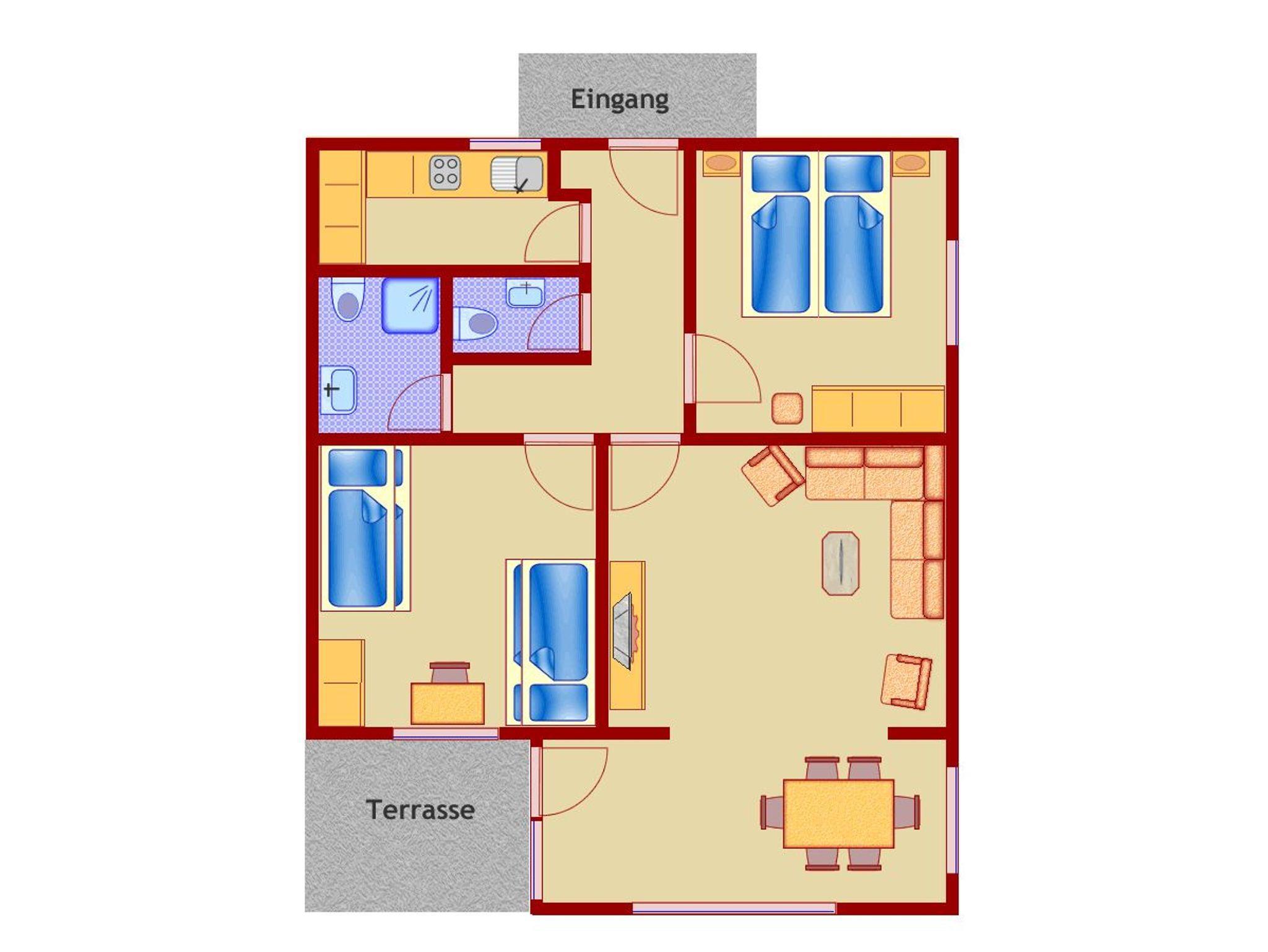 Neben einer voll ausgestatteten Küche, einem Bad mit Dusche und WC ist unser Ferienhaus mit 2 Schlafzimmern und einem Wohn-Esszimmer ausgestattet.