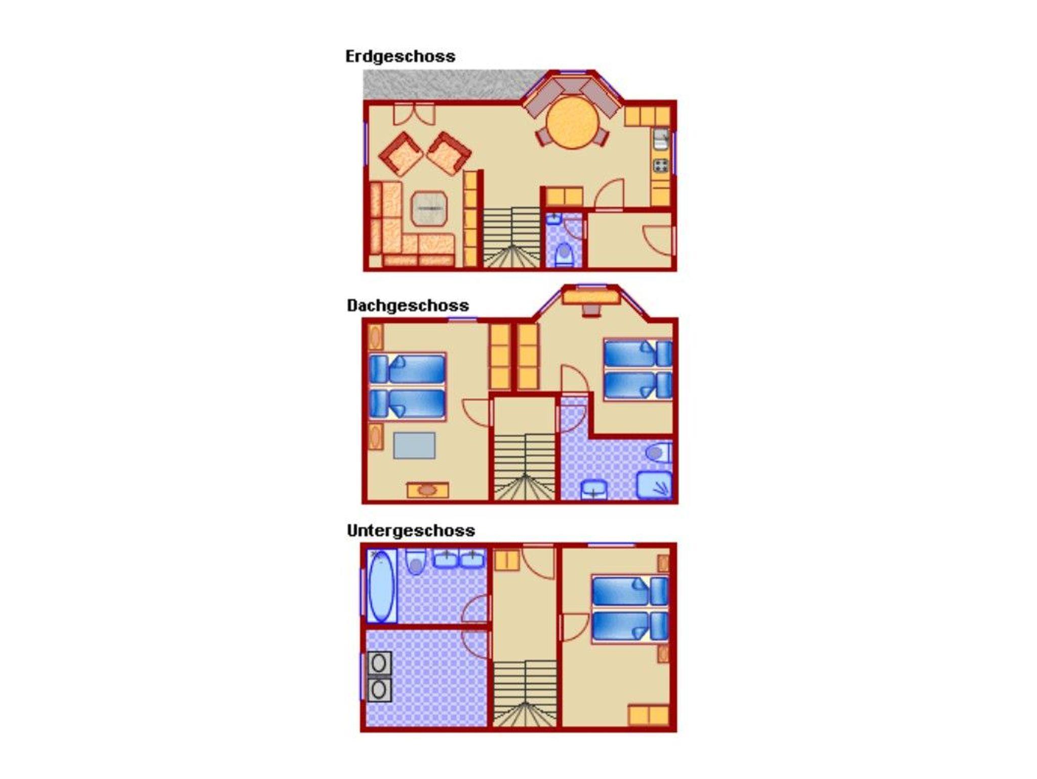 Das Obergeschoss verfügt über zwei helle Schlafzimmer und ein Bad mit Dusche/WC. Ein weiteres Schlafzimmer sowie ein Badezimmer mit Badewanne, Dusche und Doppelwaschbecken befinden sich im Untergeschoss. Alle Badezimmer sind mit einem Fön ausgestattet.