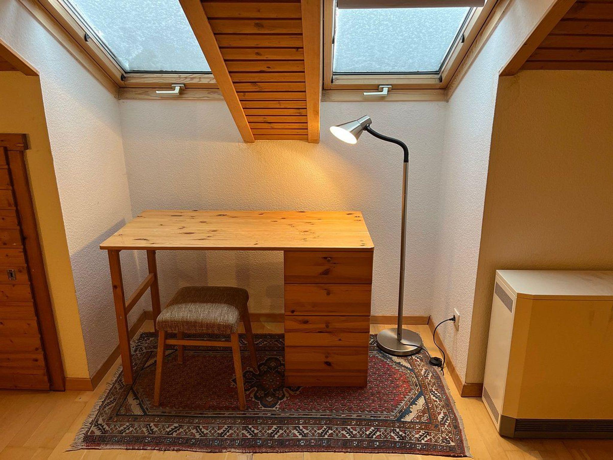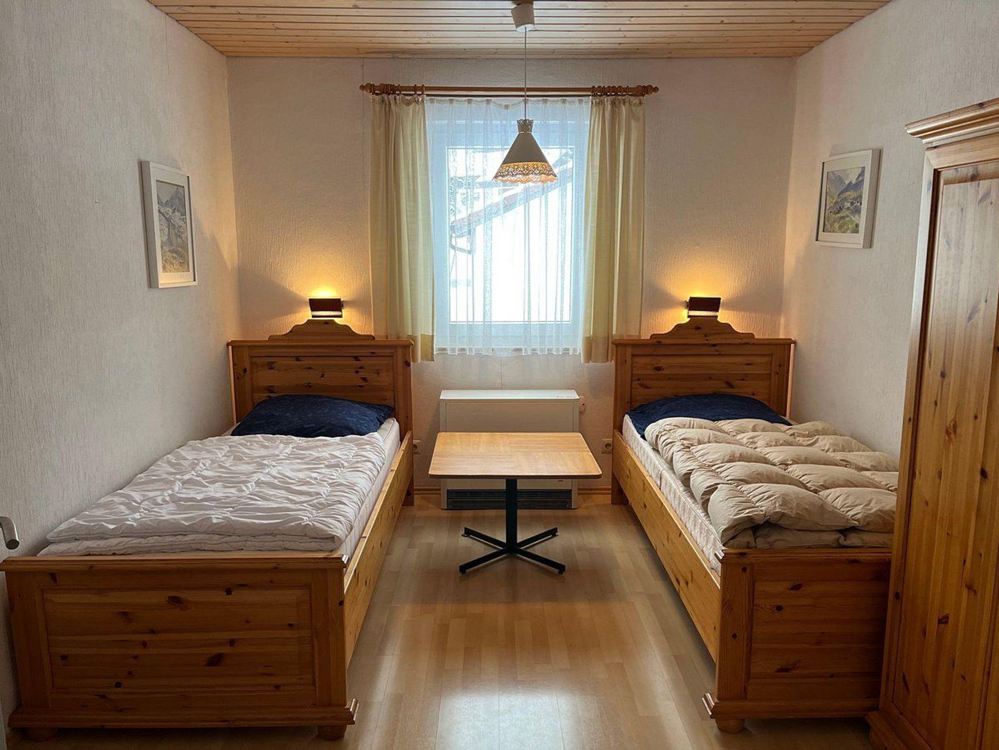 Im Inneren gibt es Platz für bis zu acht Personen in vier Schlafzimmern, von denen sich zwei mit jeweils zwei Einzelbetten und ein weiteres mit einem Doppelbett im Erdgeschoss befinden. Hier ist auch das Badezimmer und ein separates WC gelegen. Das vierte Schlafzimmer mit Doppelbett und das dritte WC befinden sich im Dachgeschoss, welches man über eine steile Treppe erreichen kann. Alle Schlafzimmer und das gemütliche Wohnzimmer sind mit Holzparkett ausgelegt.