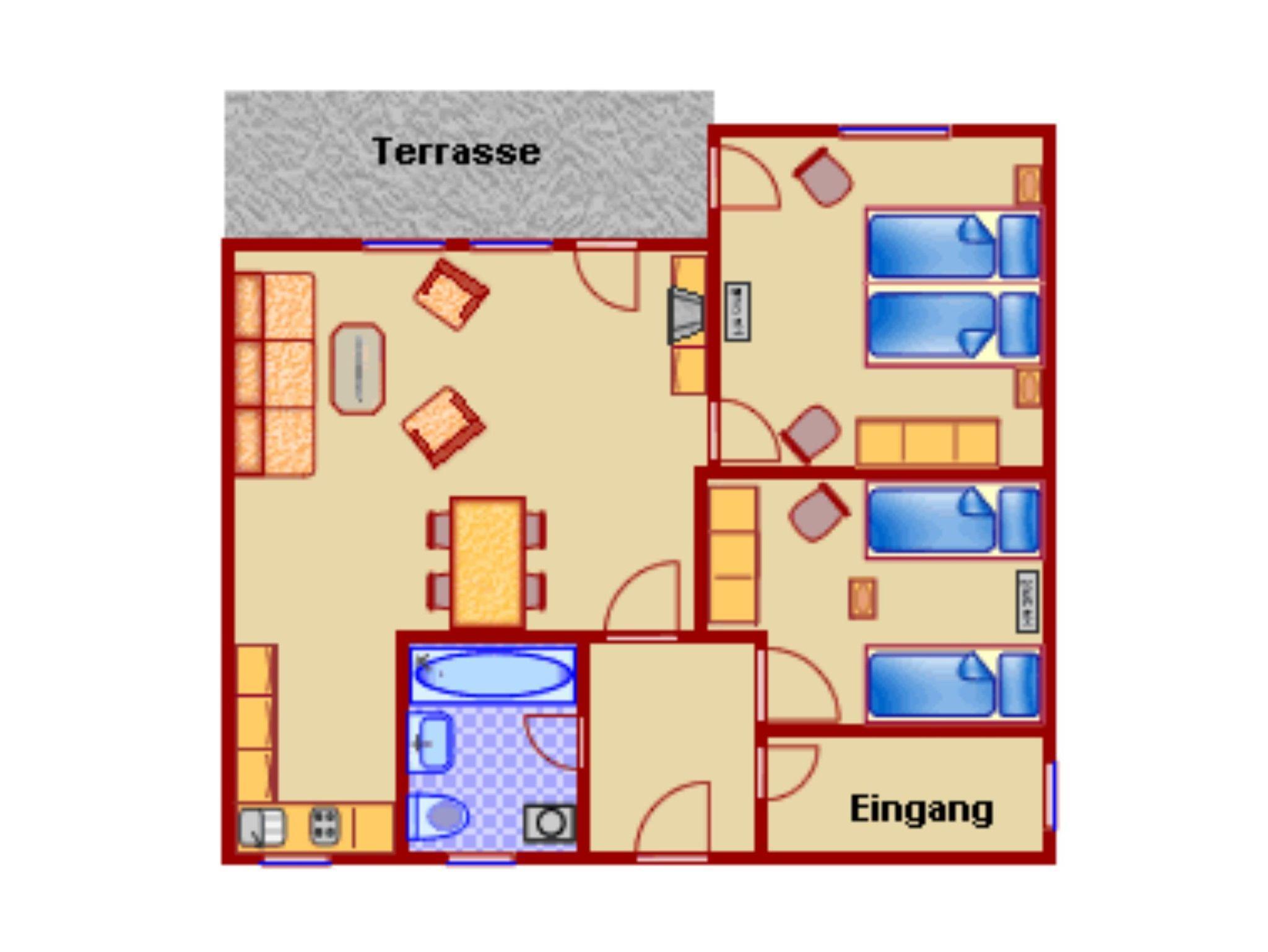 Der Eingangsbereich und das Bad sind gefliest, der Wohnbereich hat einen Linoleumfußboden, in den beiden Schlafzimmern sind hochwertige Teppichböden. Die Räume werden beheizt durch Nachtspeicheröfen. Das Bad wird beheizt über eine Fußbodenheizung und einen Decken-Infrarot-Flächenheizer. Die Küche ist mit Spülmaschine, Cerankochfeld mit Backofen, Mikrowelle und den üblichen Küchengeräten vollständig ausgestattet. Ein Fernseher mit Kabelanschluss, ein DVD-Player und eine Stereoanlage sind ebenfalls vorhanden, genauso wie eine Waschmaschine.