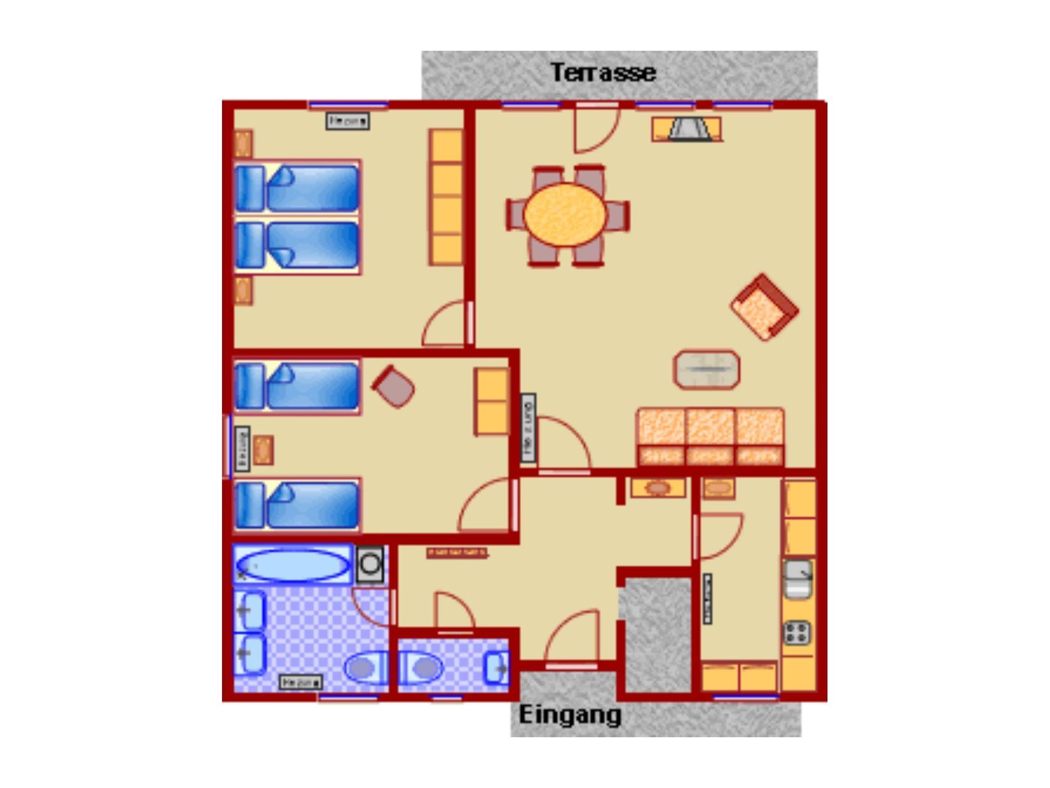 Die komplett renovierte Doppelhaushälfte mit Carport, glasüberdachter großer Sonnenterrasse und einem großen an der Nordseite gelegenen Windfang mit Unterstellmöglichkeit für Kinderwagen, Fahrräder und Ski, liegt im ansteigenden Bereich des Feriendorfes.