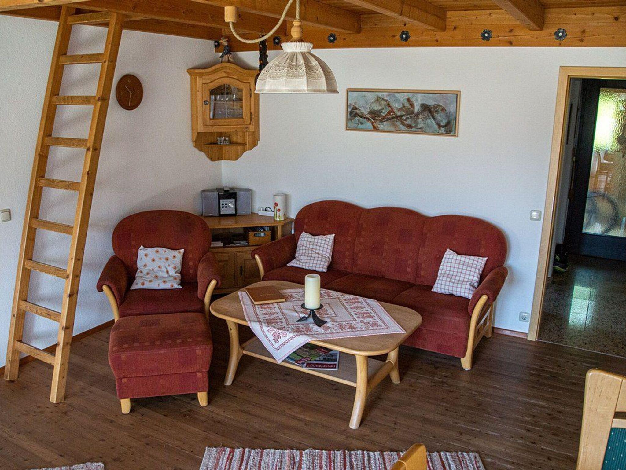 Das Wohnzimmer verfügt außerdem über eine offene Galerie (Benutzung auf eigene Gefahr), die bei Kindern und jung gebliebenen Erwachsenen gleichermaßen beliebt ist. Eine bequeme Sitzgruppe mit Couchtisch und Essecke vervollständigen die Gemütlichkeit des Raumes.