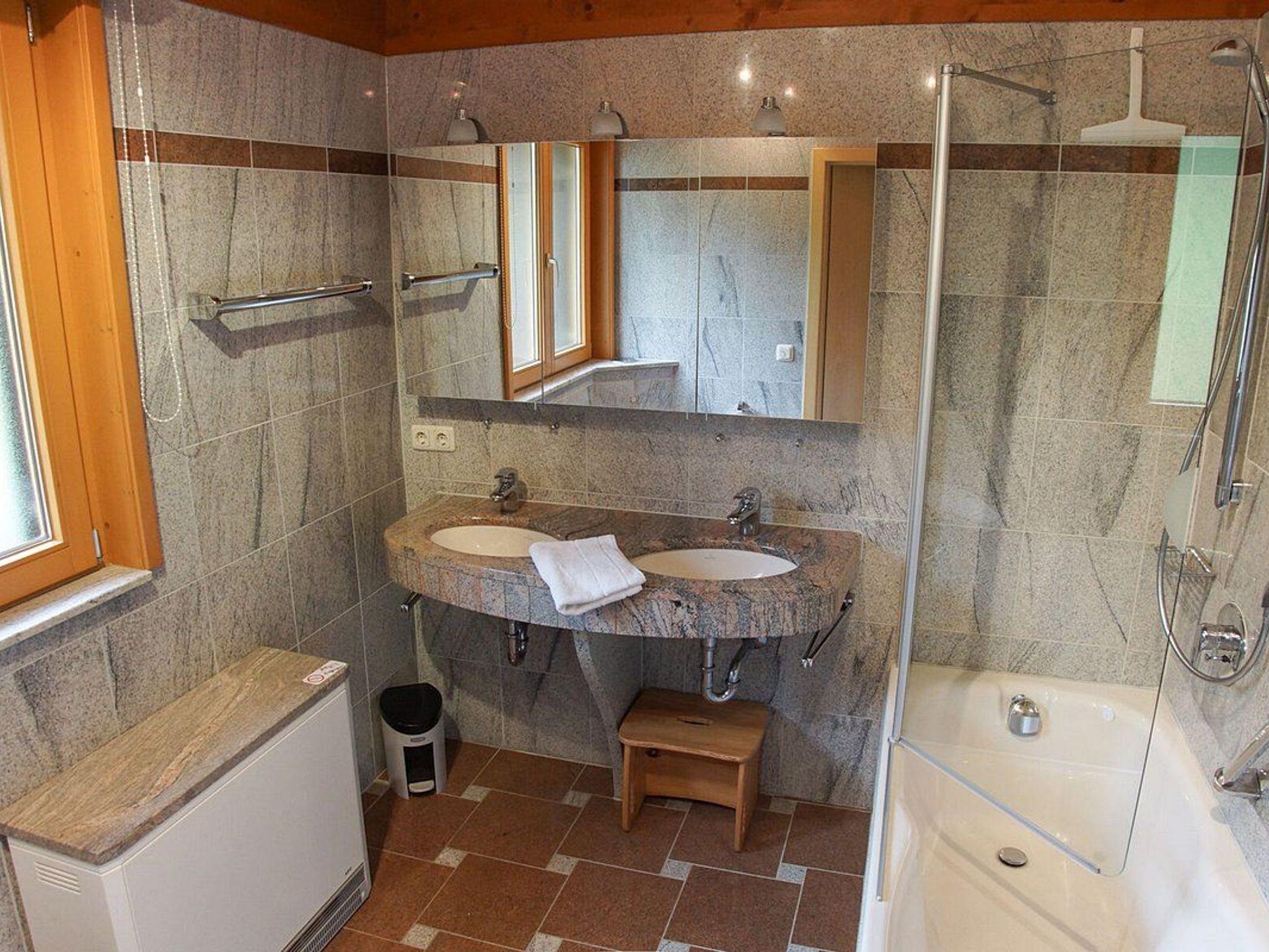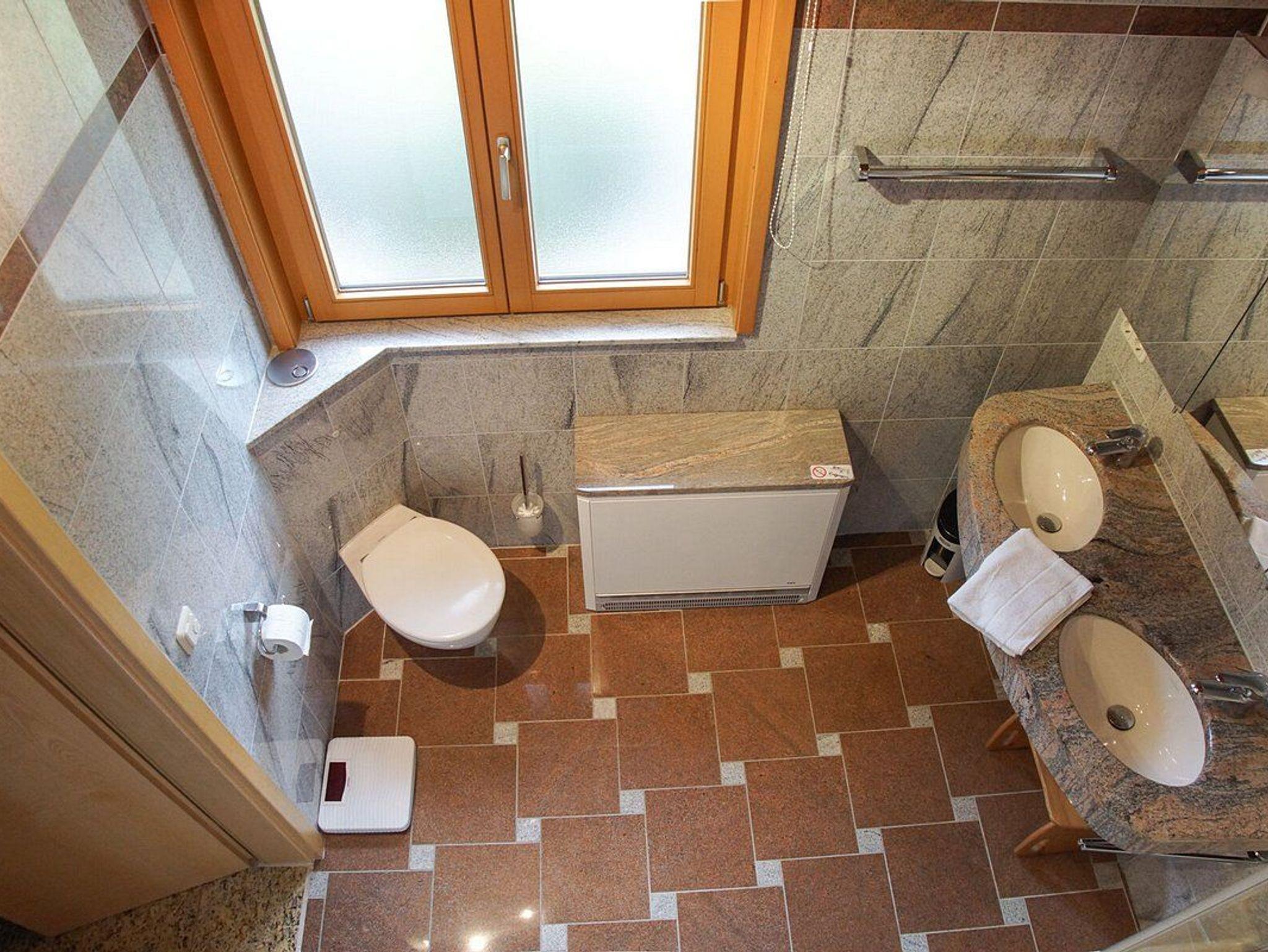 Das ebenfalls in Naturstein gestaltete Bad ist ein weiteres Glanzstück. Ausgestattet ist es mit Badewanne und integrierter Dusche, WC und Waschmaschine.