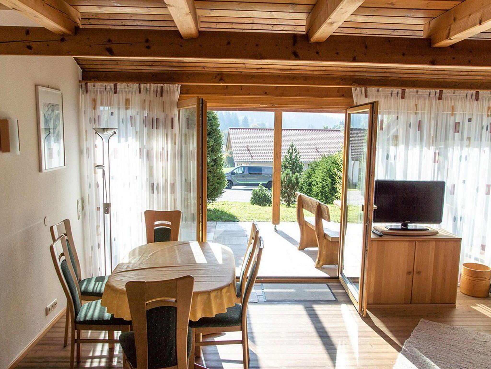 Die große, mit Naturstein gestaltete Südterrasse ist vom Nachbarhaus aus nicht einsehbar und bietet eine gute Sicht auf die Nesselwanger Hausberge und sorgt für Sonnengenuss bis zum Abend. Für sonnige Morgenstunden befindet sich hinter dem Haus eine Sitzgelegenheit für Frühstücksgenießer.