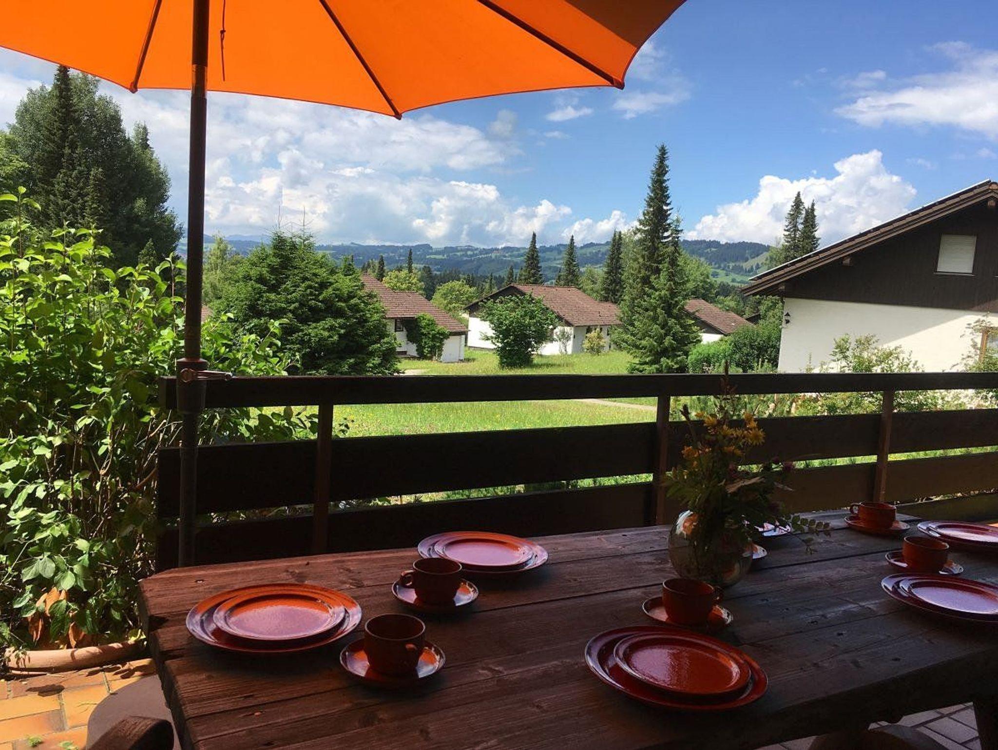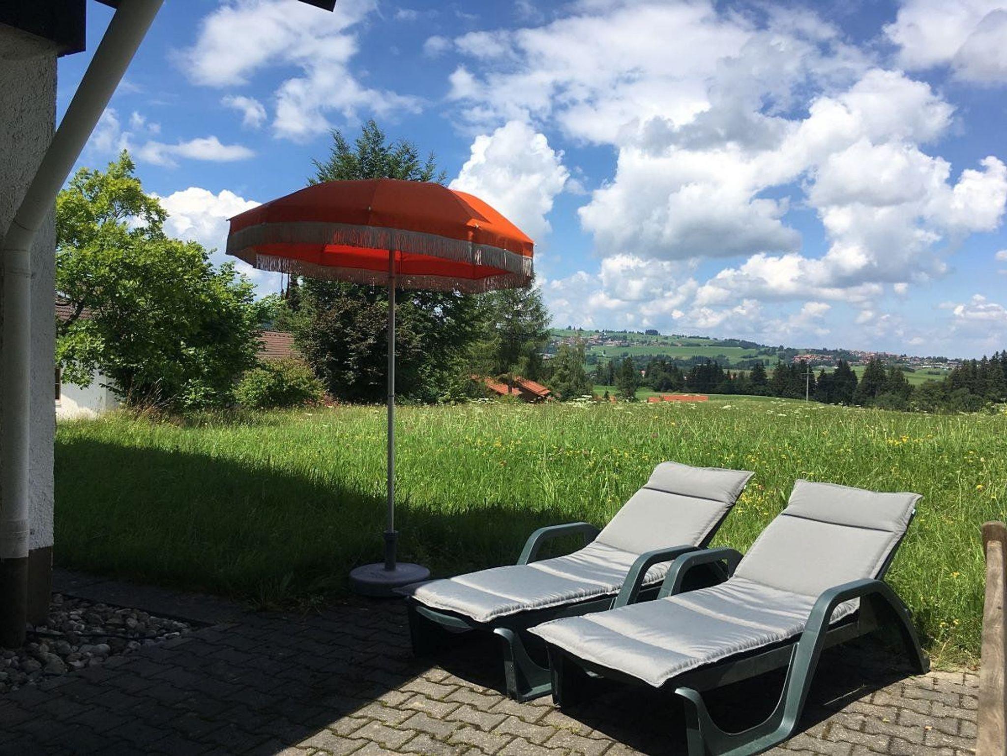 Der Südbalkon vor dem Wohnraum lädt zum Sonnenbaden ein, während die Terrasse mit Grillgelegenheit direkt an die Wiesen grenzt und einen herrlichen Blick in die Allgäuer Landschaft bietet.