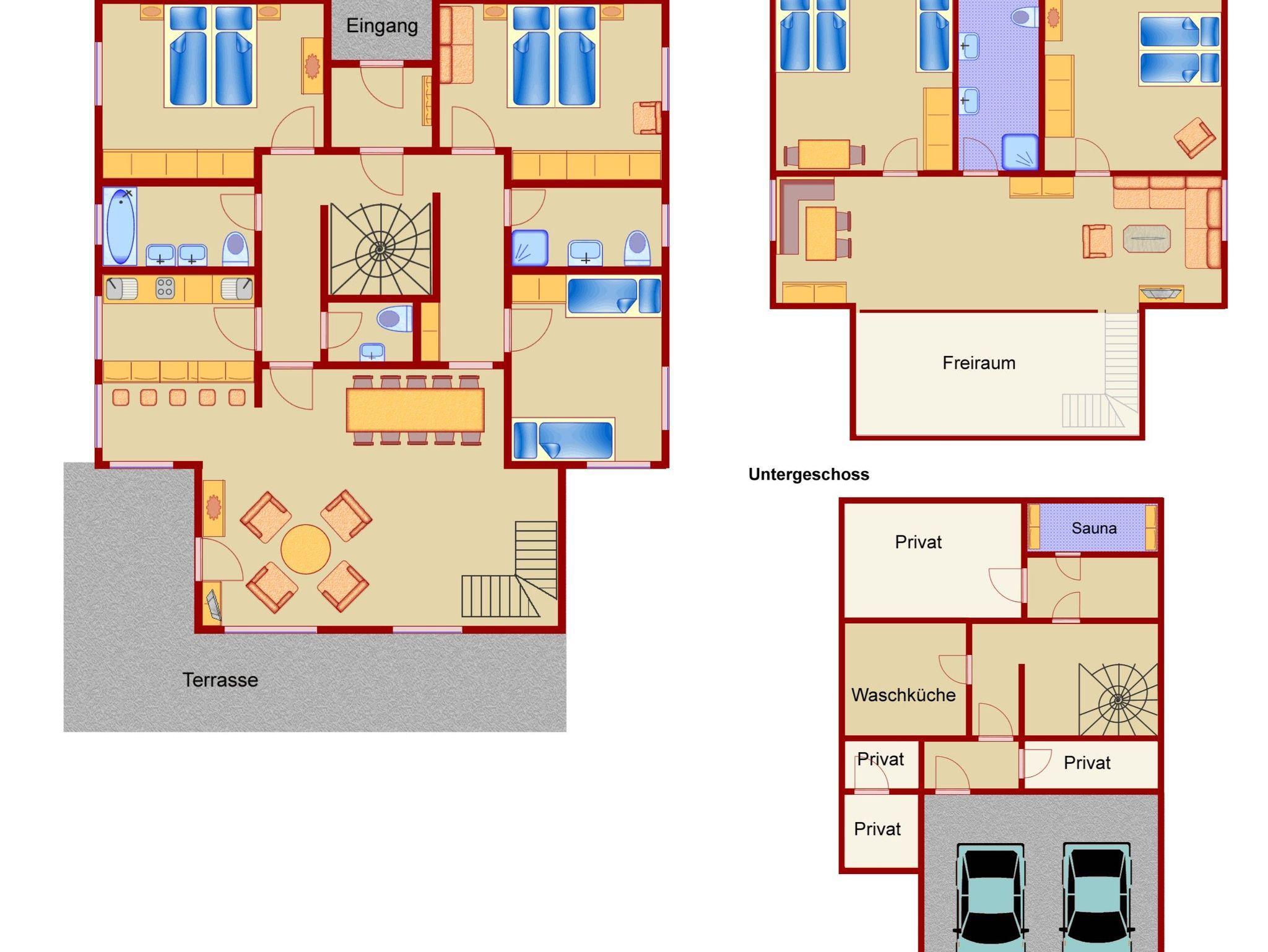 Im Untergeschoss stehen eine Waschküche, eine Sauna (gegen Gebühr + Verbrauchskosten) sowie eine Doppelgarage mit Tischtennisplatte zur Verfügung.