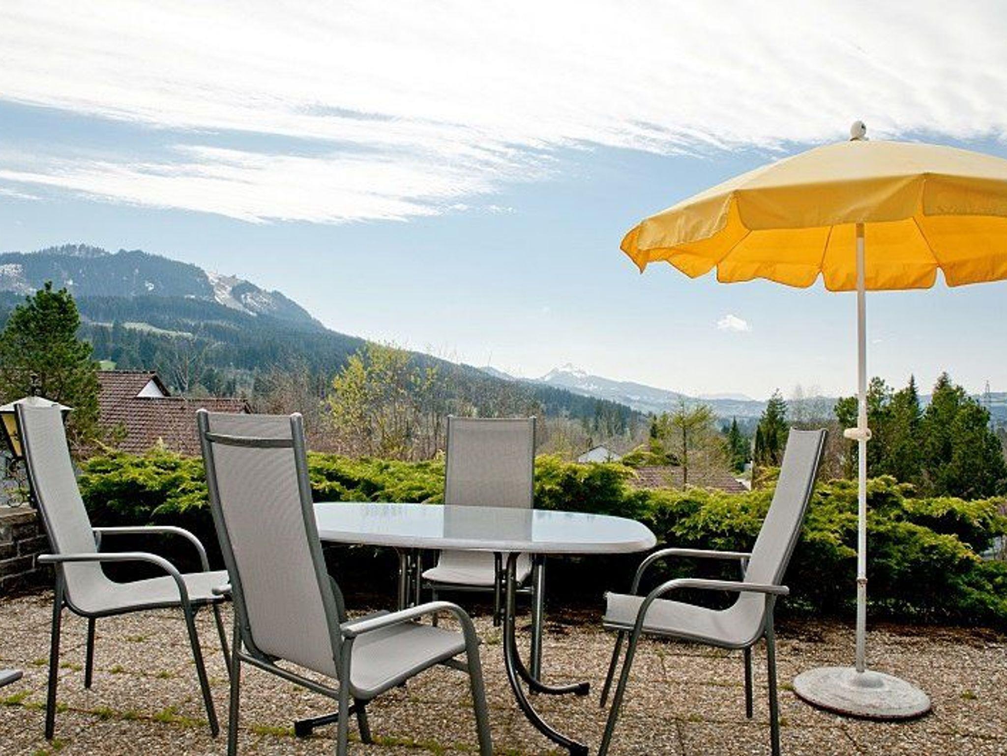 Von der ca. 50 m² großen Sonnenterrasse genießen Sie einen unverbaubaren Blick über Mittelberg und Wertach bis hin zum Wahrzeichen des Allgäus, dem Grünten, sowie zur Reutterwanne und der Alpspitze.