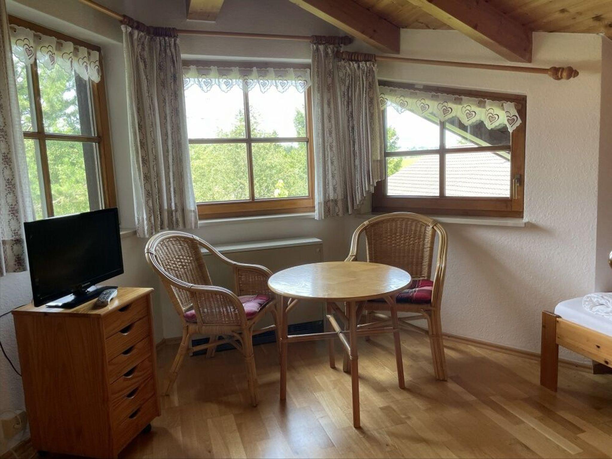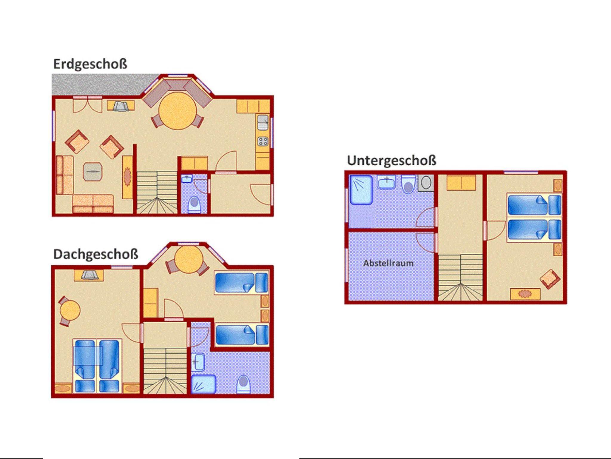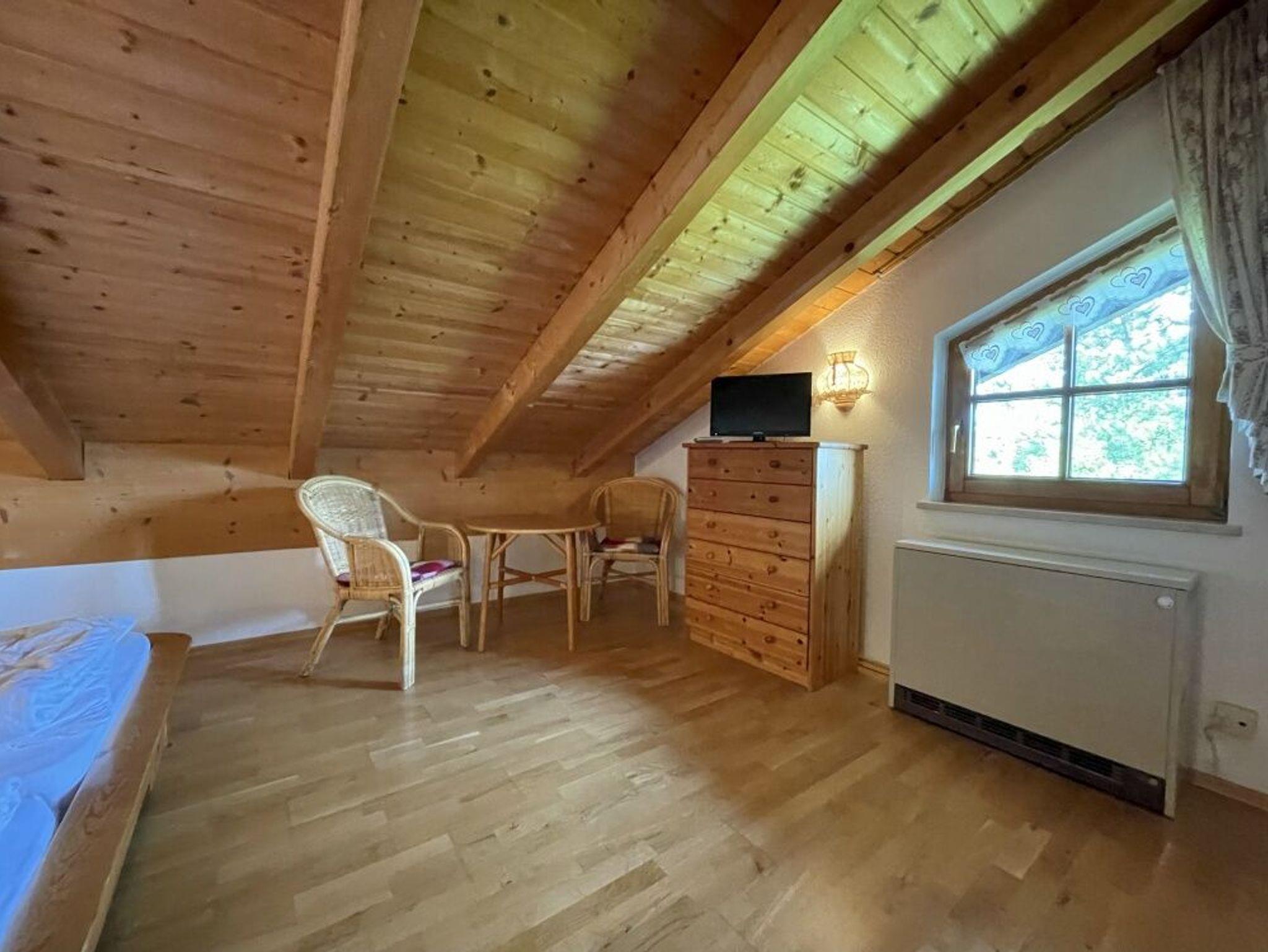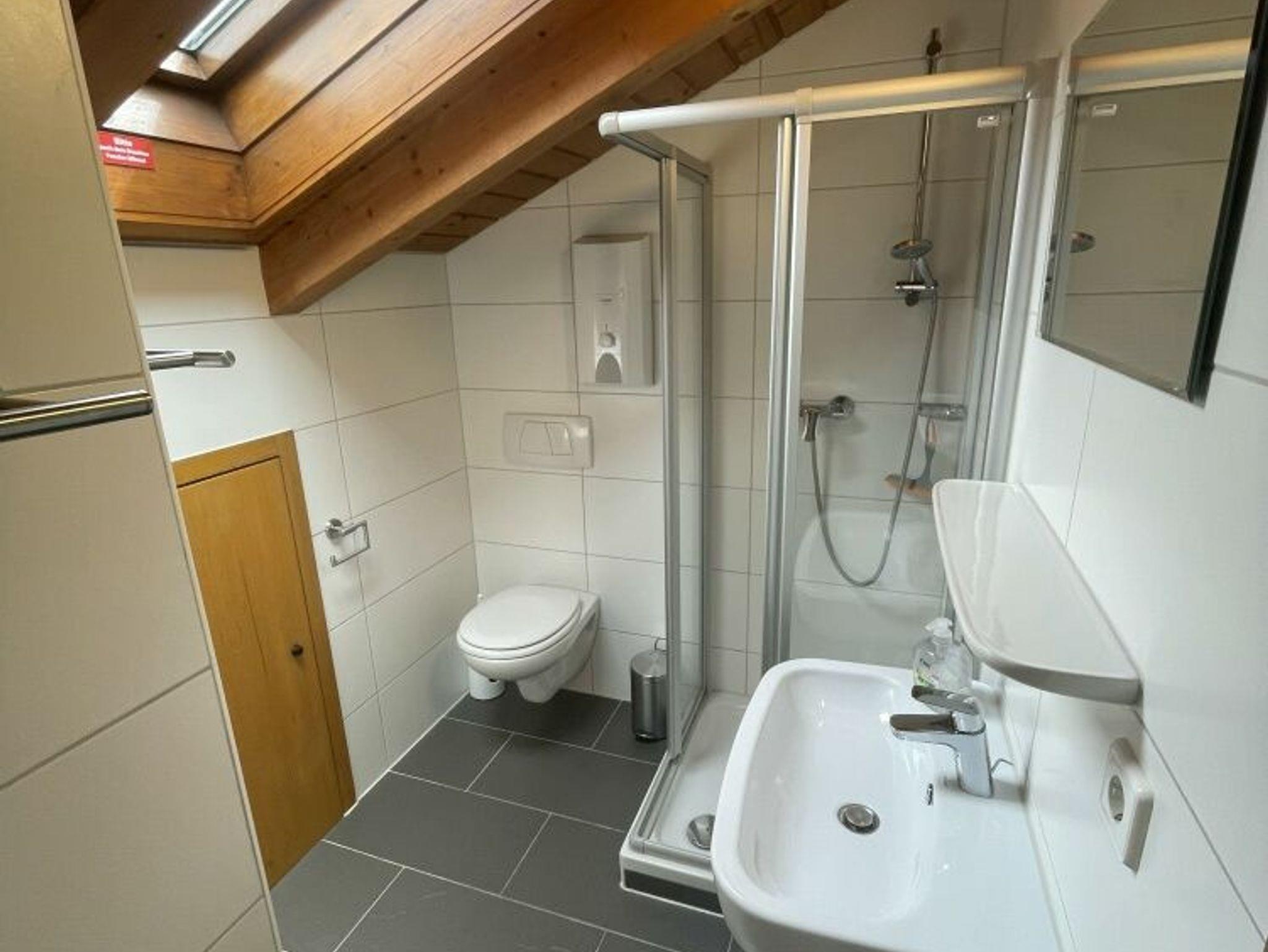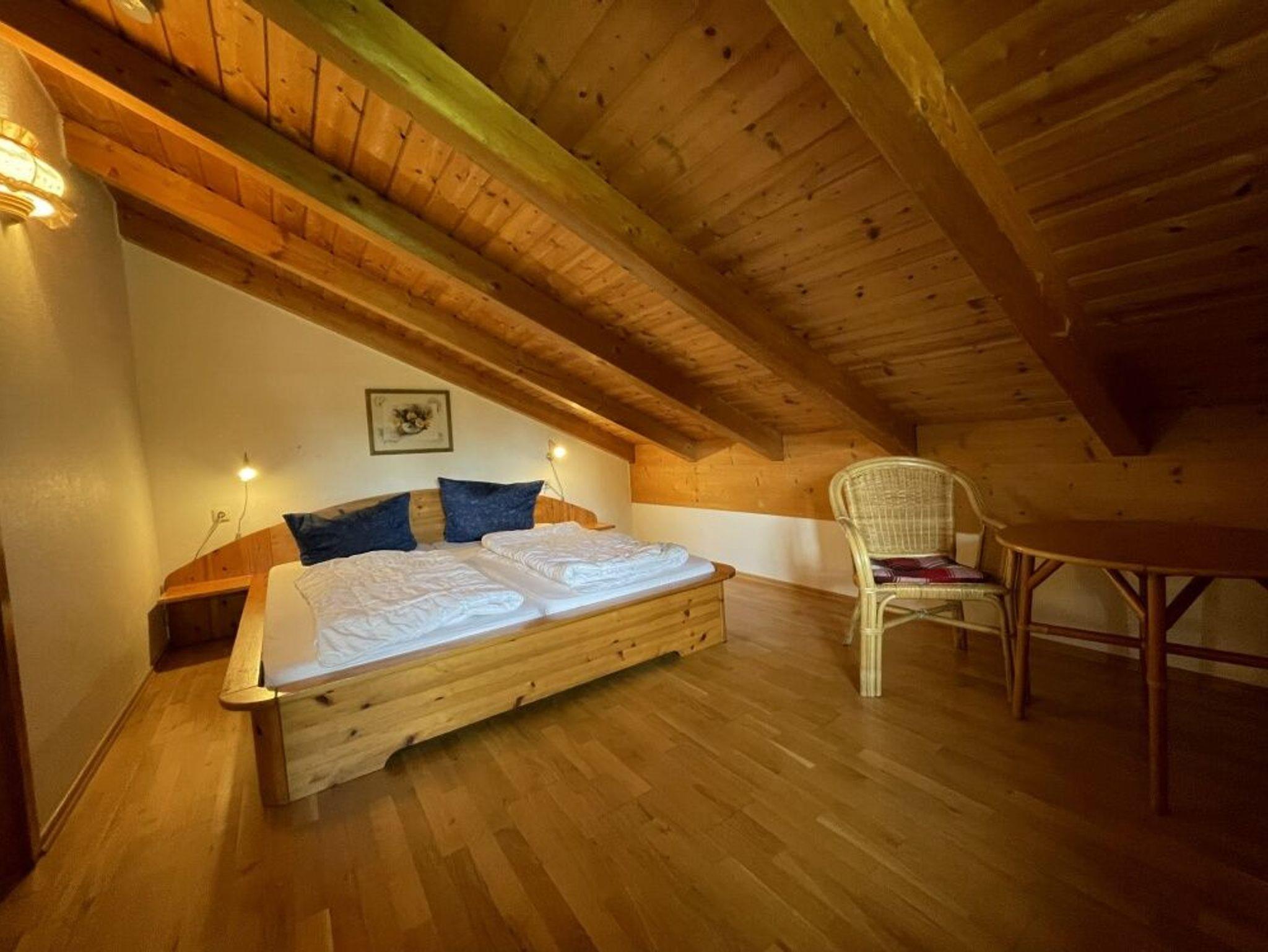 Im Obergeschoss mit offenem Dachausbau bis zum First befinden sich zwei Schlafzimmer sowie ein neu renoviertes Badezimmer mit Dusche und WC. Das größere Schlafzimmer ist mit einem Doppelbett und einer Sitzgarnitur ausgestattet, das zweite mit zwei Einzelbetten und einer Sitzgelegenheit im Erker. In beiden Zimmern sind Fernseher und Radios vorhanden. Ein Kinderbett kann bei Bedarf zugestellt werden.