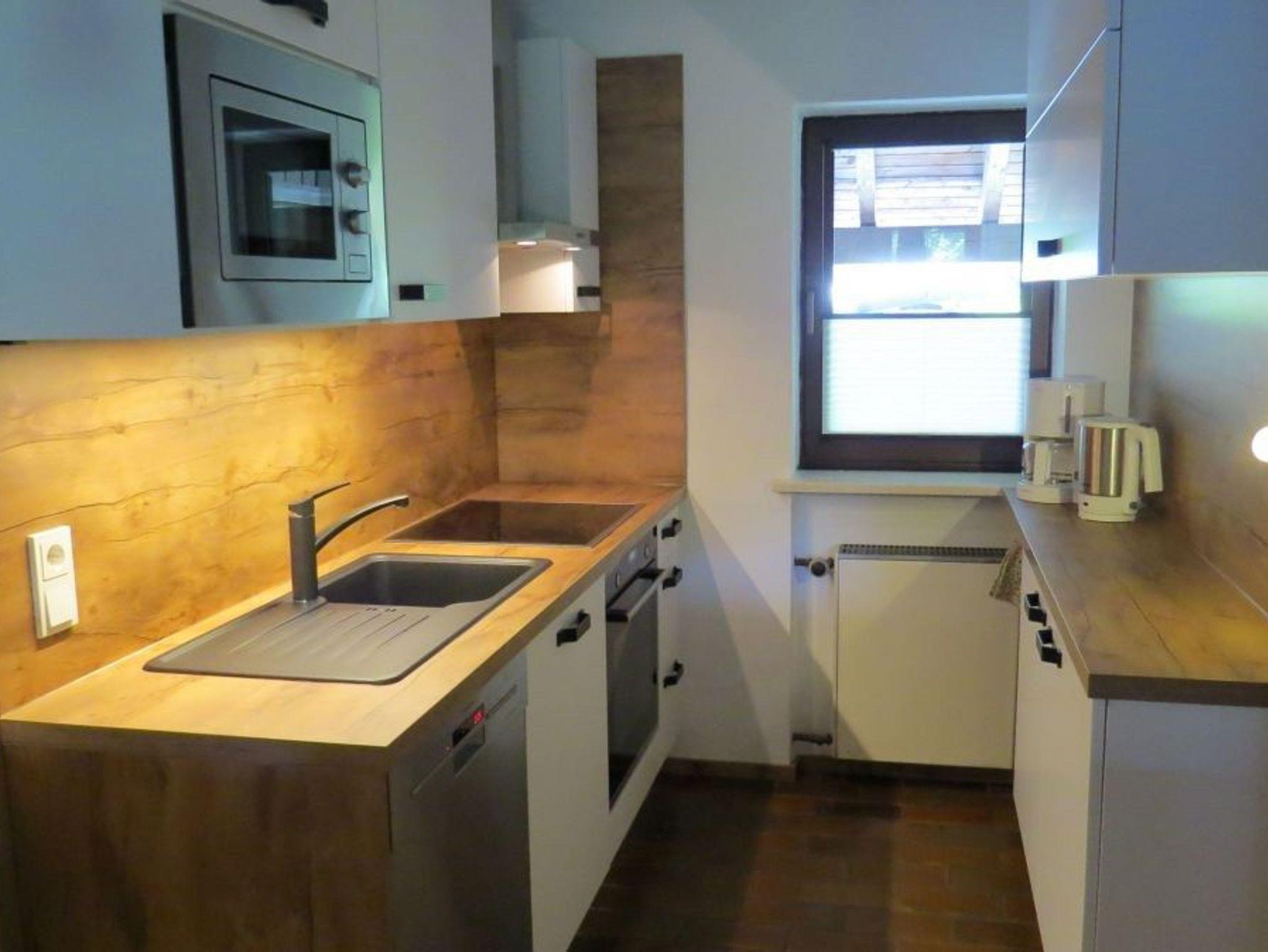 • Offene Kochküche mit Backofen, Mikrowelle, Cerankochfeld mit Abzug, Kühlschrank mit Gefrierfach, Kaffeemaschine, Wasserkocher und Spülmaschine.