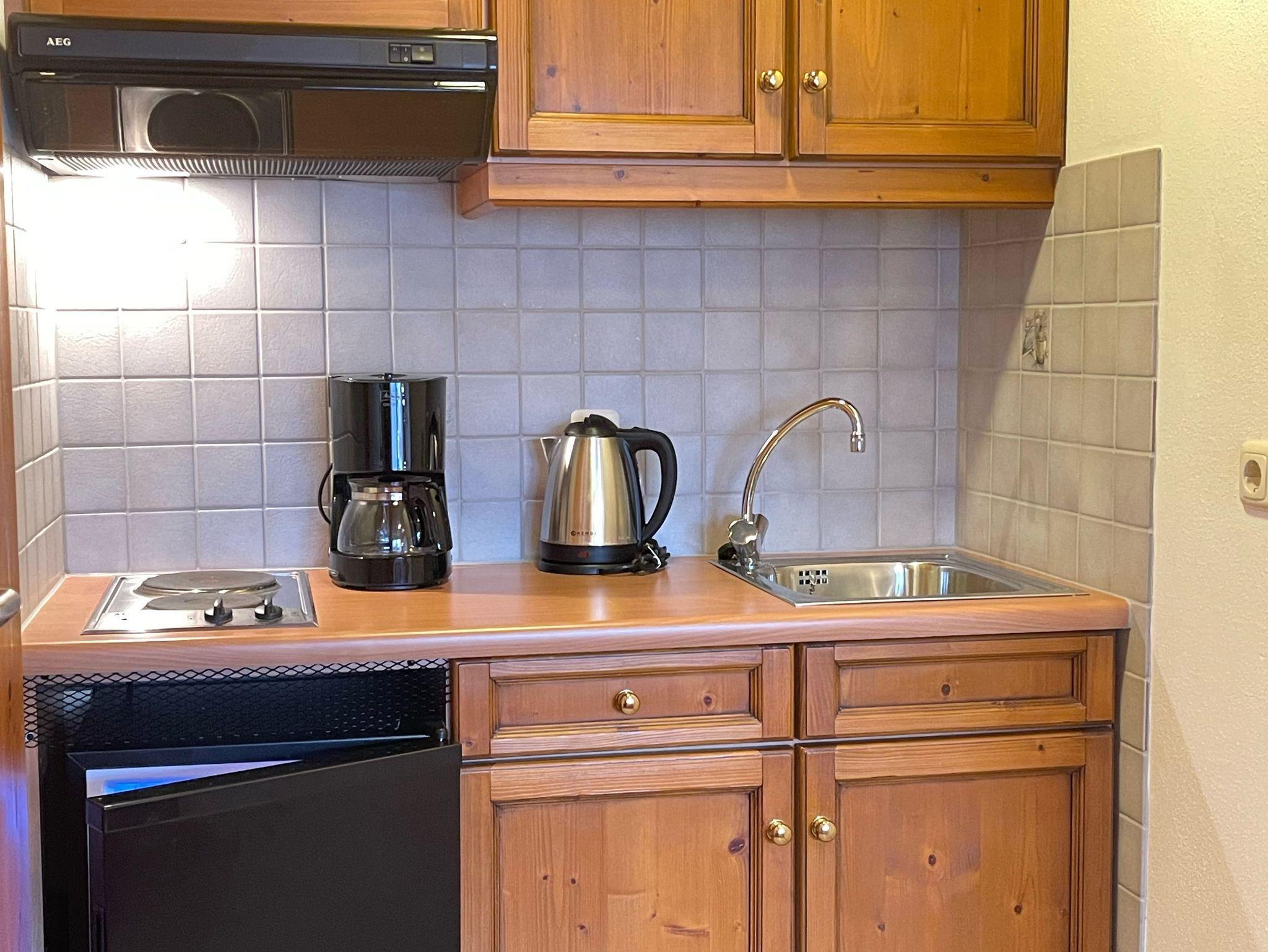 Ferienwohnung für 3 - 4 Personen, Wohn- und Schlafraum kombiniert, mit gemütlicher Sitzecke und Balkon. Doppelbett oder zwei Einzelbetten, Komplett ausgestattete Küchenzeile mit Spüle, Kaffeemaschiene, Kochfeld, Kühlschrank, Mikrowelle, Toaster. Badezimmer mit Dusche/WC mit Kosmetikspiegel und Fön, Digital-TV und integriertem Radio.