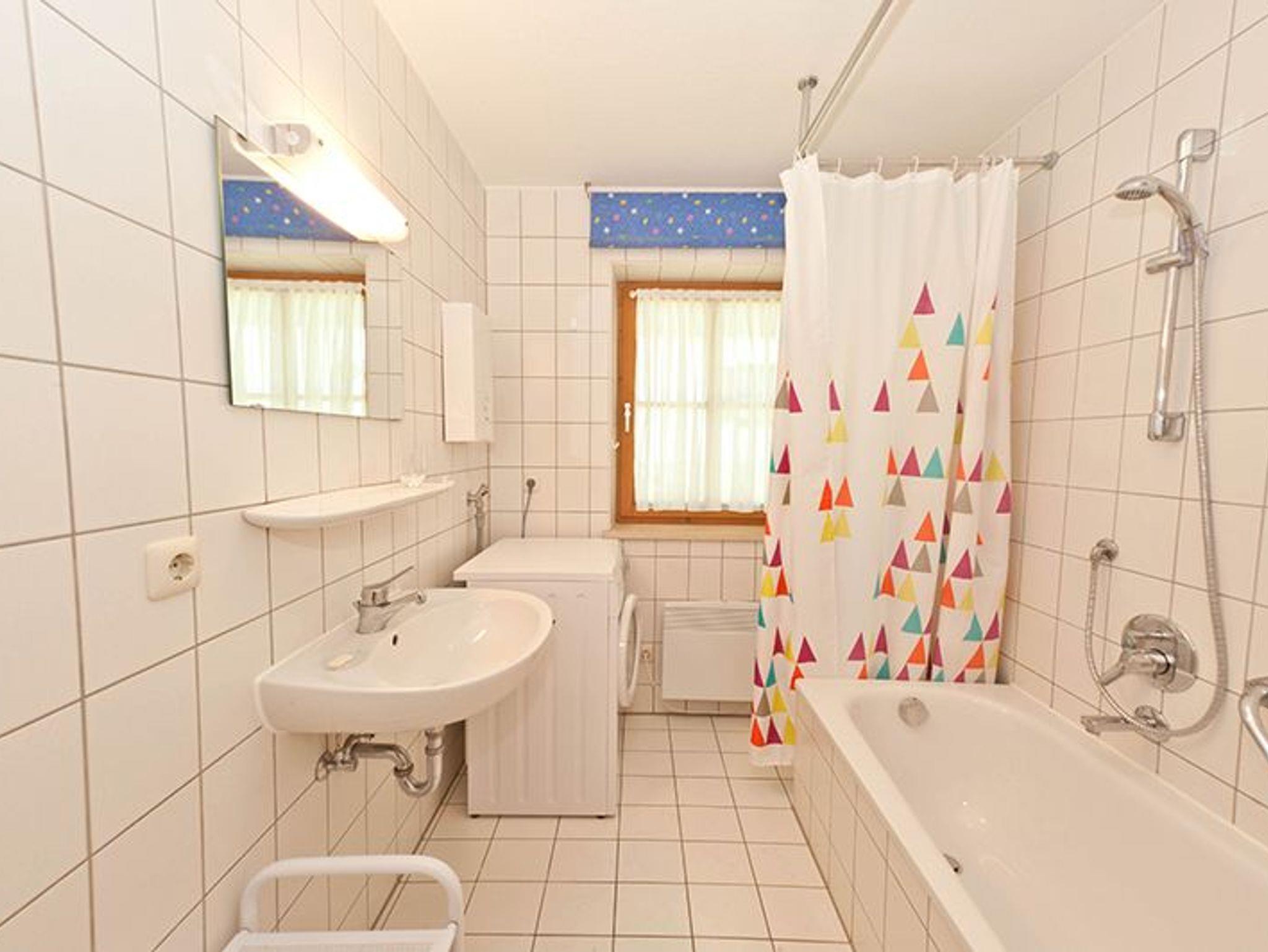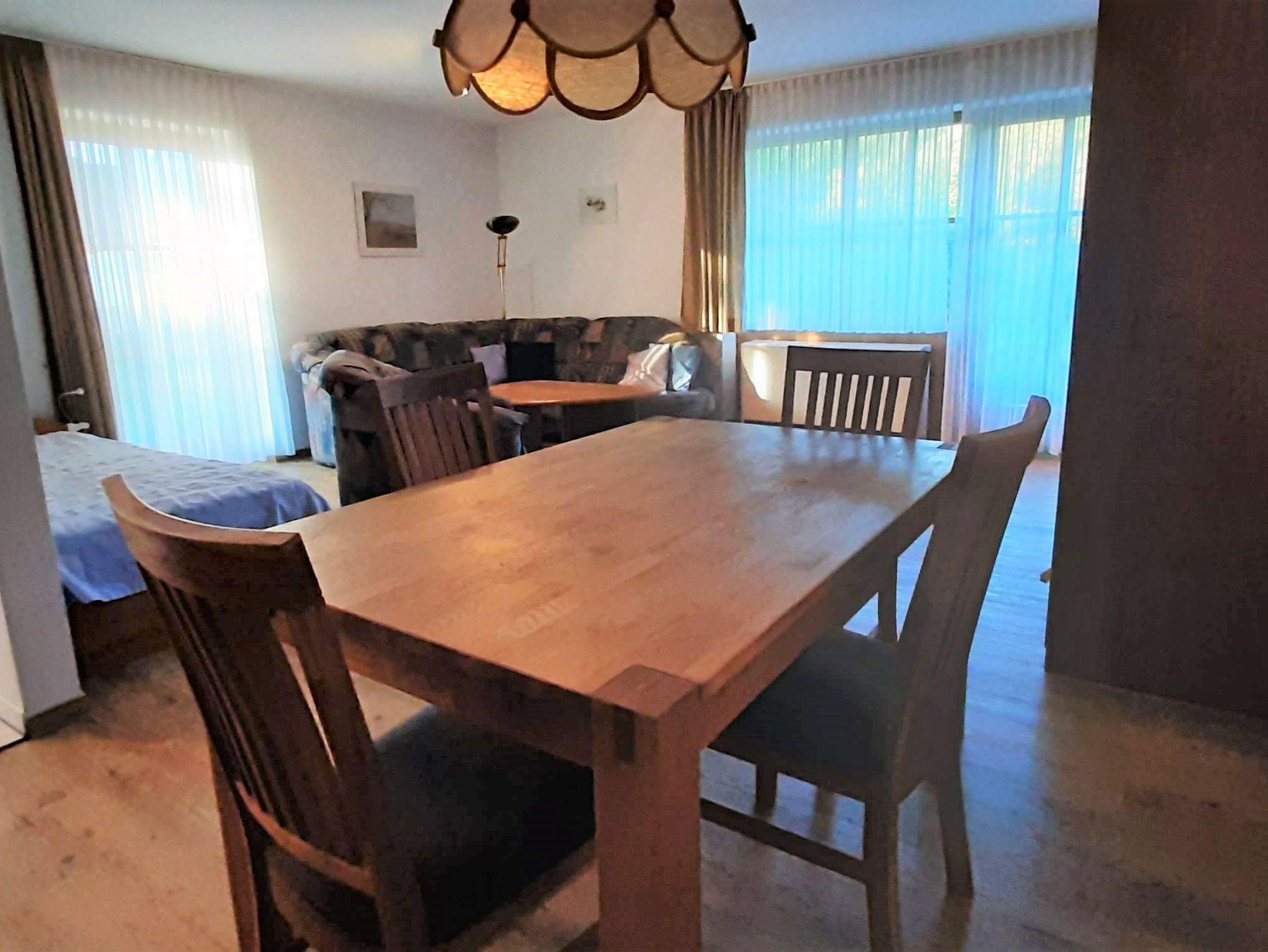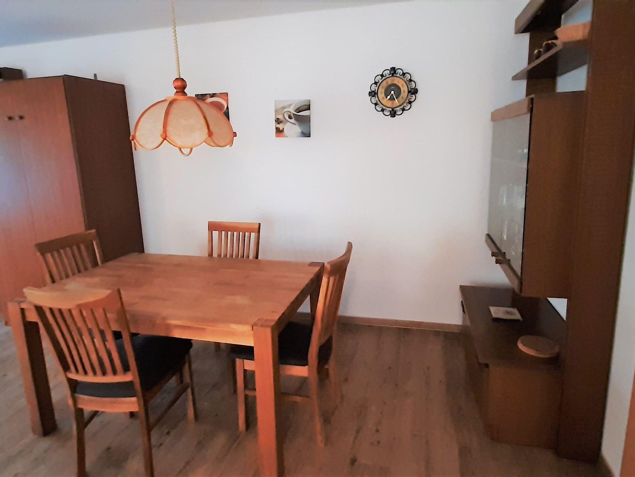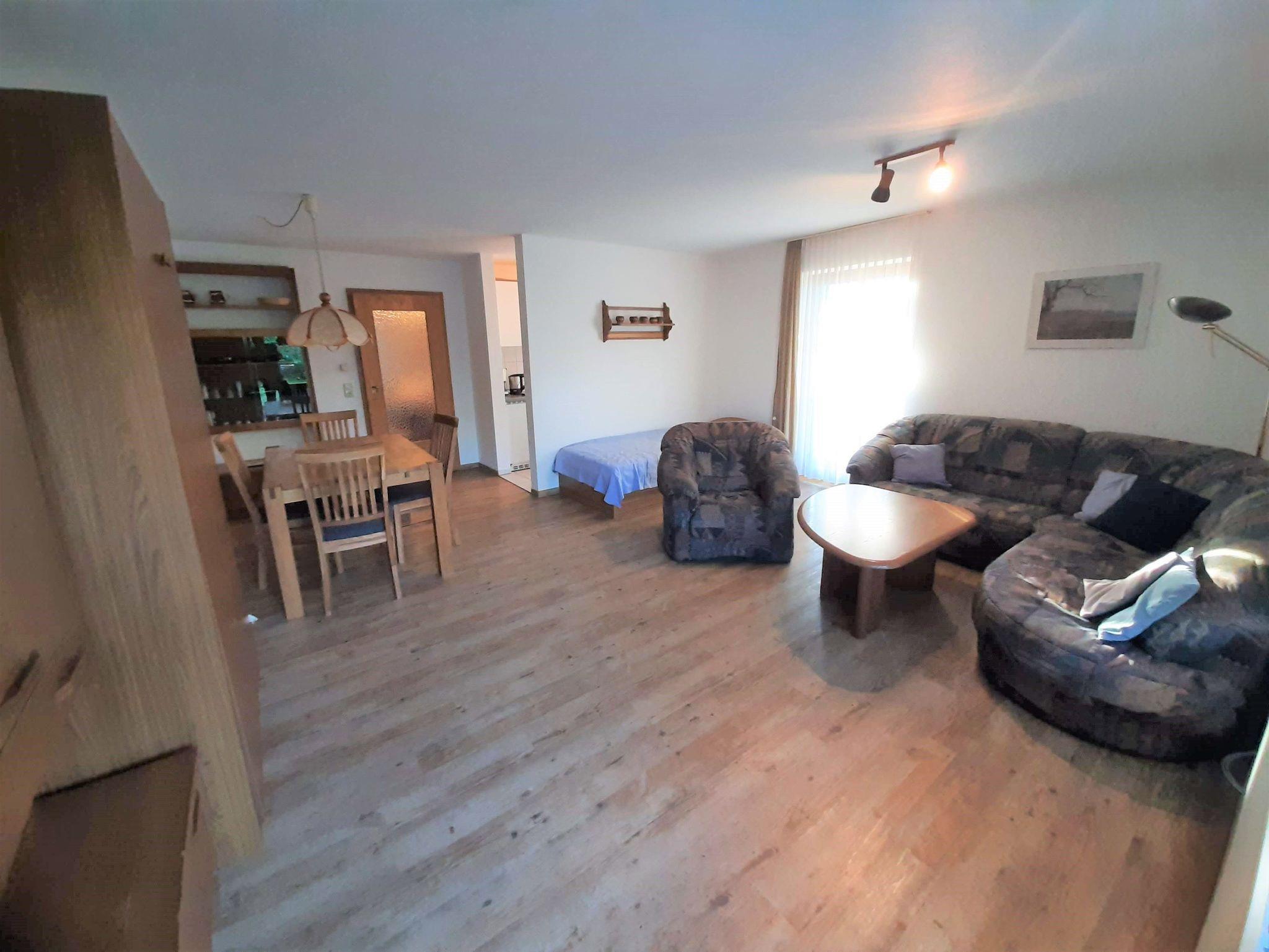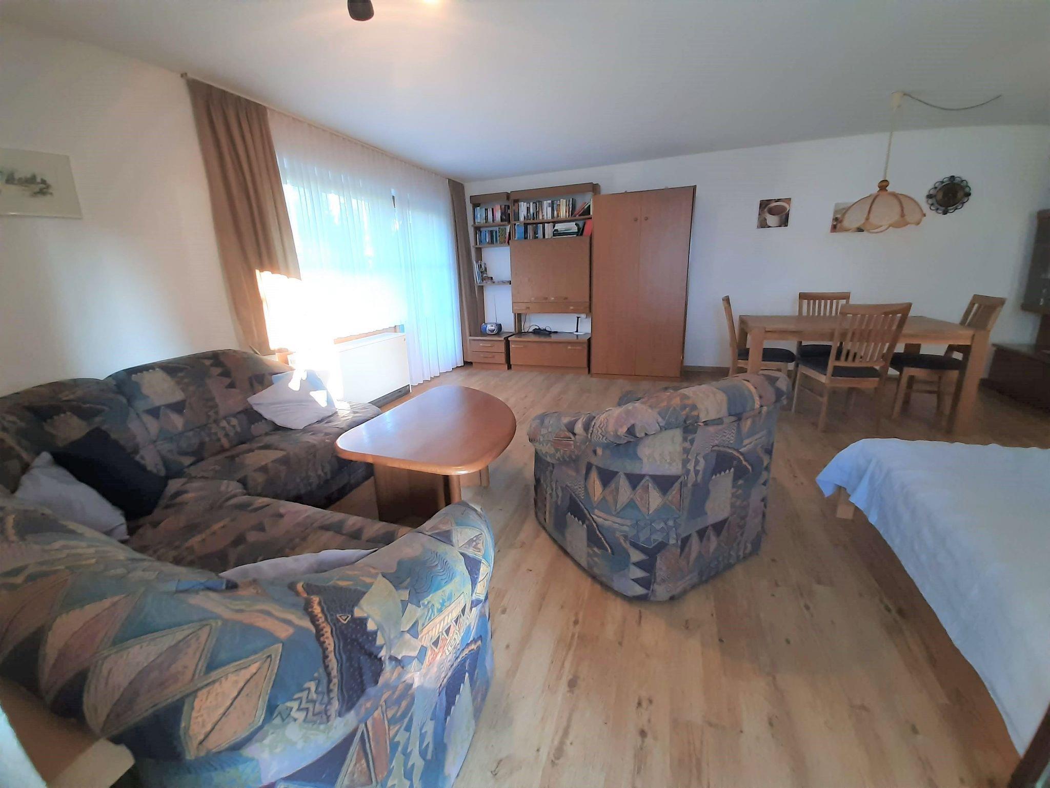 Sonnige und ruhige Zwei-Zimmer-Wohnung im Erdgeschoss mit direktem Zugang über eine Terrasse - Gartenmöbel vorhanden - auf eine große Wiese. Pflegeleichter Laminatfußboden in Holzoptik in allen Räumen. Das Elternschlafzimmer mit großem Schrank bietet genügend Platz, um ein Kinderbett aufzustellen. Im Wohnzimmer bieten ein extra Bett und ein Schrankbett bei Bedarf Schlafmöglichkeiten für zwei weitere Urlauber. Ein Vorteil der Wohnung ist die Nähe zu Spielhaus, Spielplatz und Freibad. Die Gaststätte Wildbachalm ist in ein paar Gehminuten Entfernung, ebenso wie die Verwaltung. Die Küche ist neben dem Herd mit Backofen, einem Kühlschrank mit einem kleinen Gefrierfach noch mit einer Filter-Kaffeemaschine, einem Toaster, Eierkocher und einem Wasserkocher ausgestattet. Im Bad finden Sie eine Waschmaschine. Außerdem verfügt die Wohnung über einen Stellplatz in der Tiefgarage neben Haus Nr. 11. In der Wohnung ist ein kleiner separater Abstellraum vorhanden (ist auf dem Grundriss nicht verzeichnet ). Wlan und TV vorhanden.