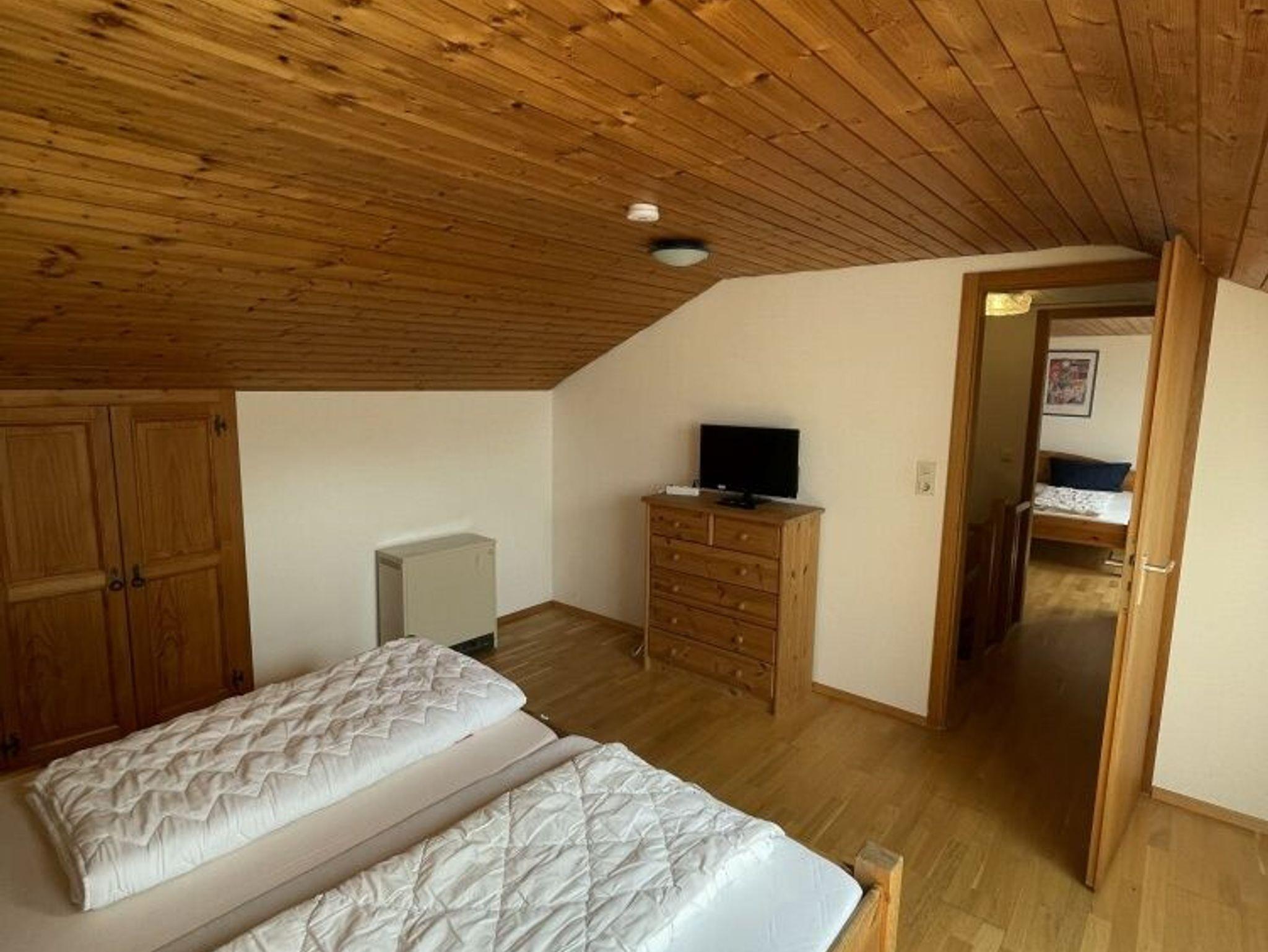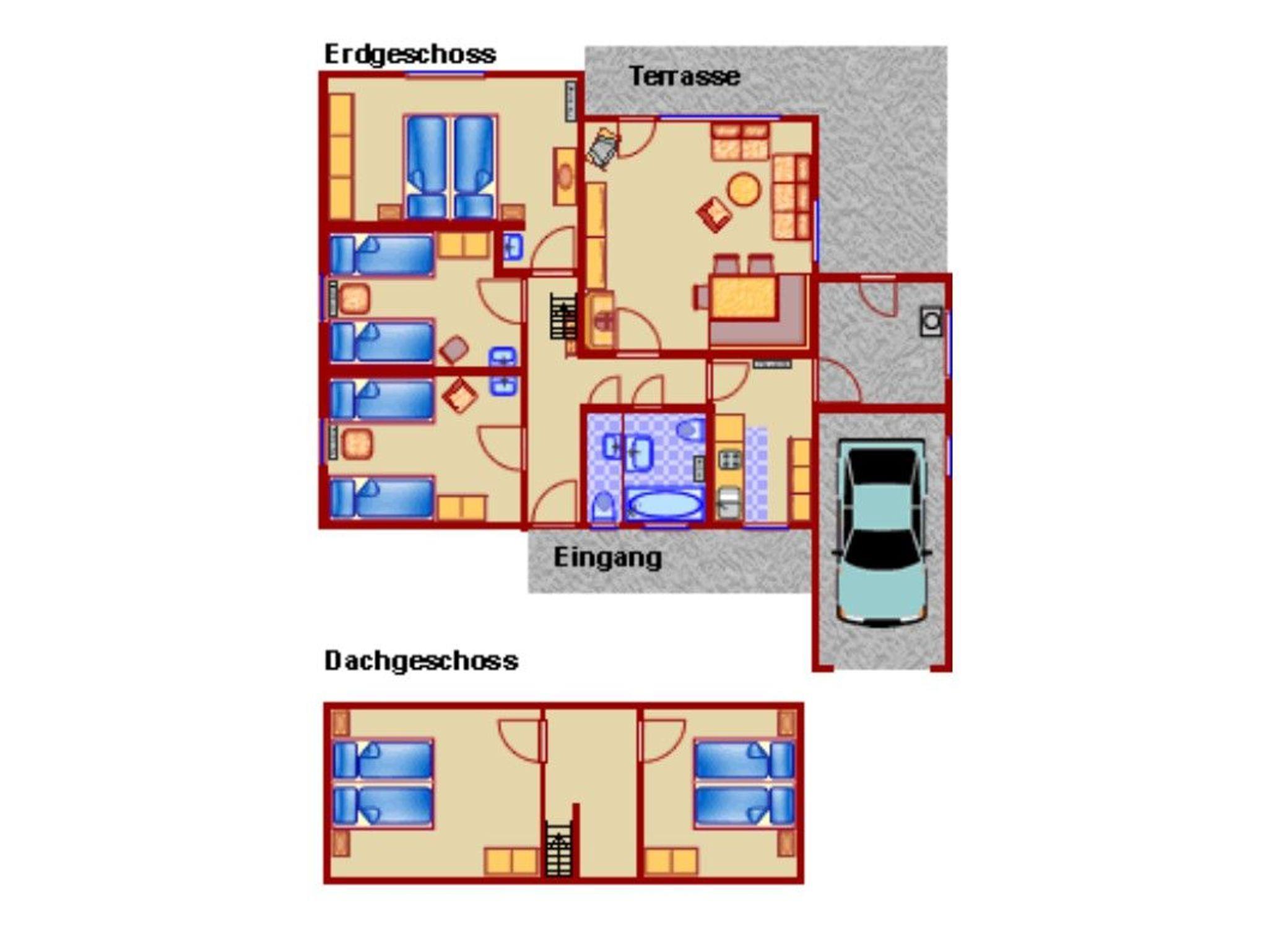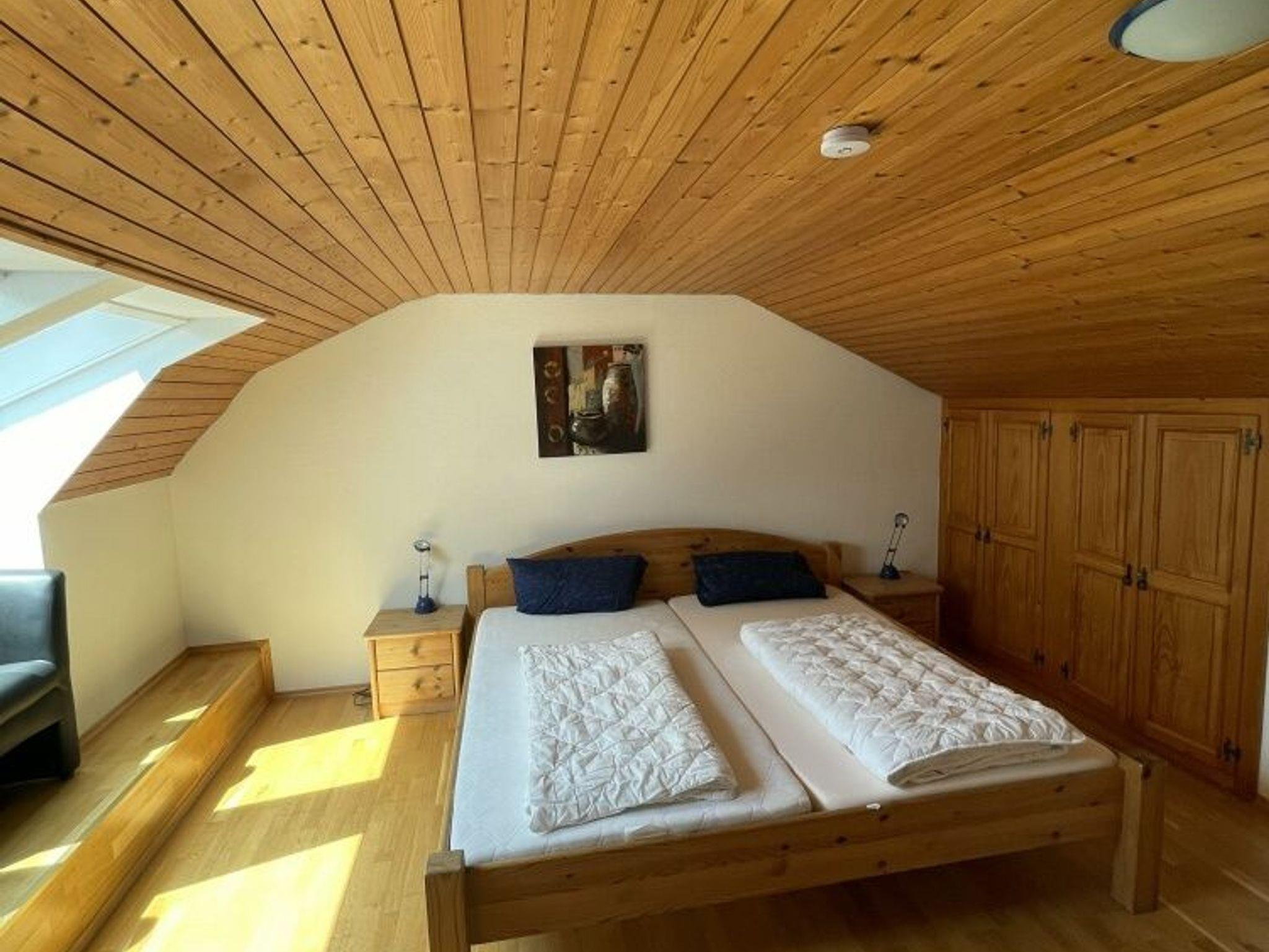 Alle drei Schlafzimmer im EG sind mit Eiche-Massivholzparkett ausgestattet. Im Obergeschoss befinden sich zwei weitere Schlafzimmer mit neuen Massivholz-Doppelbetten, Holzparkett und je einem eigenen Fernseher. Die renovierte Küche ist mit neuen Möbeln und Geräten ausgestattet: Cerankochfeld, Backofen, Mikrowelle, Geschirrspüler, großer Kühlschrank mit Gefrierfach, Kaffeemaschine sowie vollständige Ausstattung für mehr als 8 Personen. Das Wohnzimmer verfügt über eine gemütliche Essecke mit Eckbank, Polstergarnitur und HD-Flachbildfernseher, der zentral einsehbar ist, sowie Stereoanlage. Ein elektrisch beheizter Kachelofen sorgt für angenehme Atmosphäre, beheizt wird mit Nachtspeicheröfen. Eine Garage und vier Stellplätze stehen am Eingang zur Verfügung. Schneller Internetzugang mit ca. 55Mbit/s ist vorhanden. Haustiere sind erlaubt.
