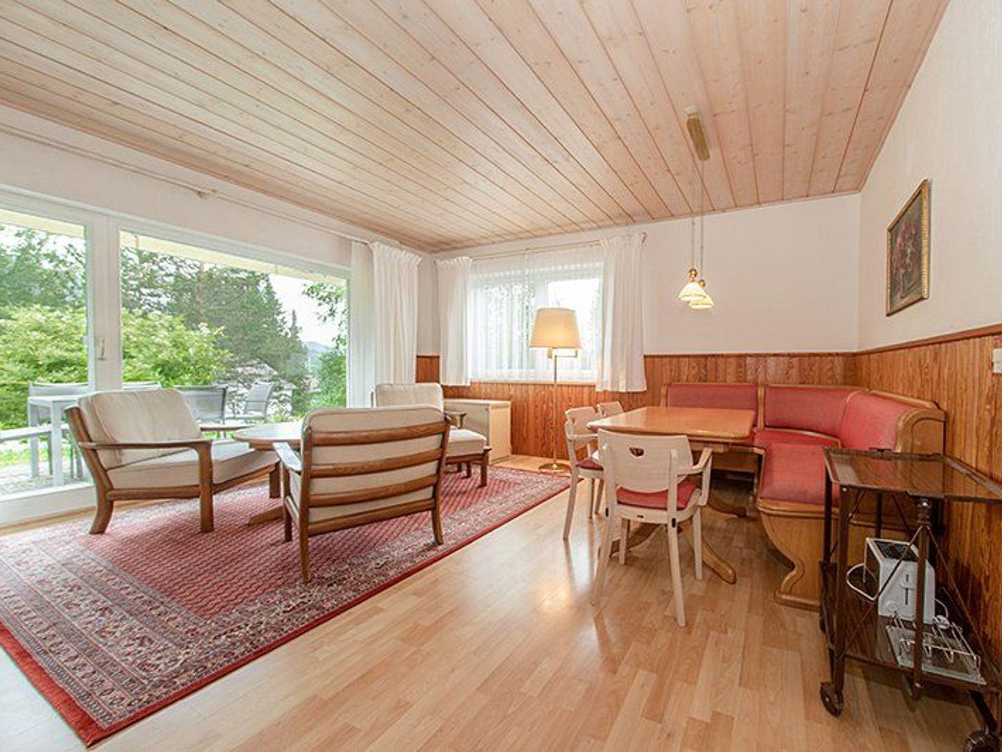 Der großzügige Wohnbereich ist mit einem Esstisch, einer gepolsterten Eckbank und Stühlen eingerichtet und öffnet sich zur sonnigen Terrasse mit Ausblick auf Alpspitze, Reuterwanne und Grüntenberg. Im Wohnraum stehen ein Fernseher, Gesellschaftsspiele, Puzzles und auch etwas Spielzeug bereit.