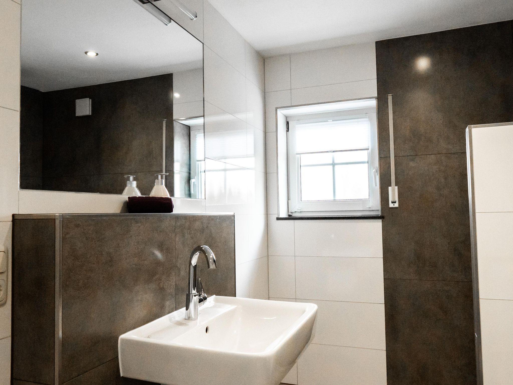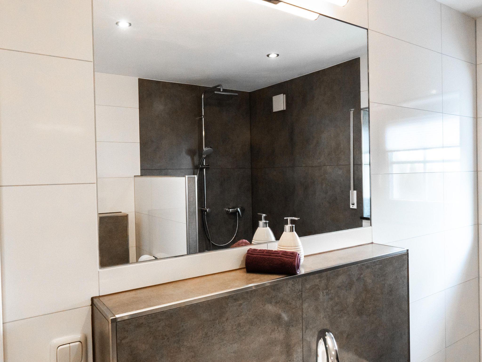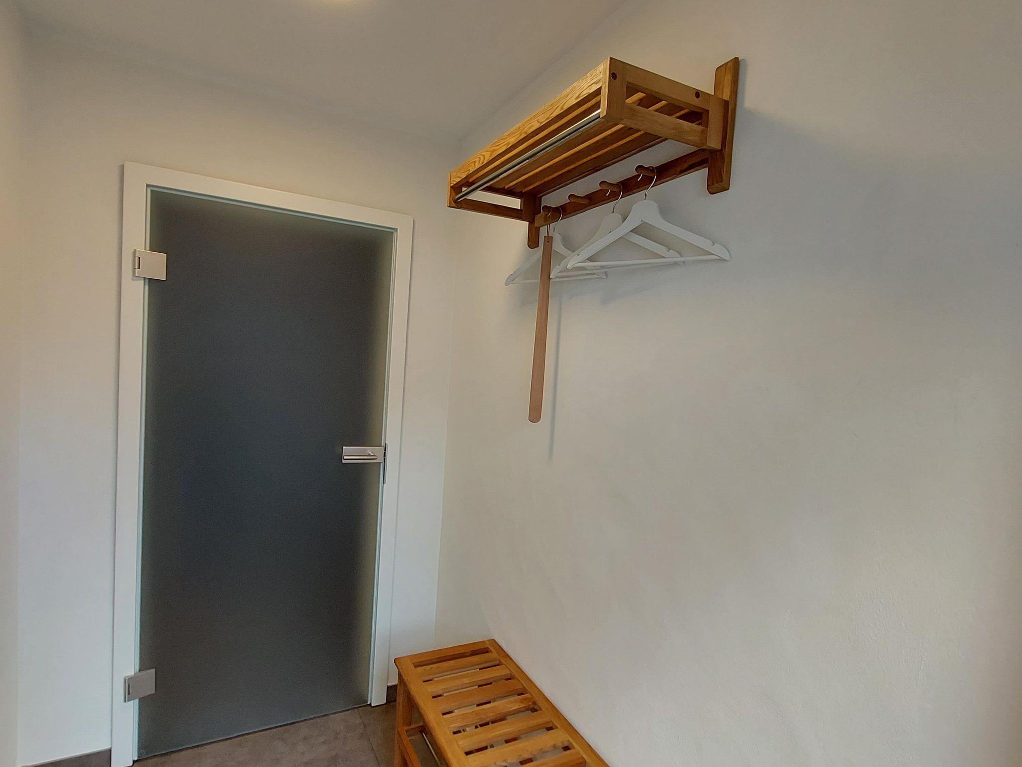 Im Badezimmer finden Sie eine ebenerdige und geräumige Dusche sowie eine Waschmaschine. Möglichkeiten zum Trocknen der Wäsche finden Sie im Außenbereich der Wohnung.