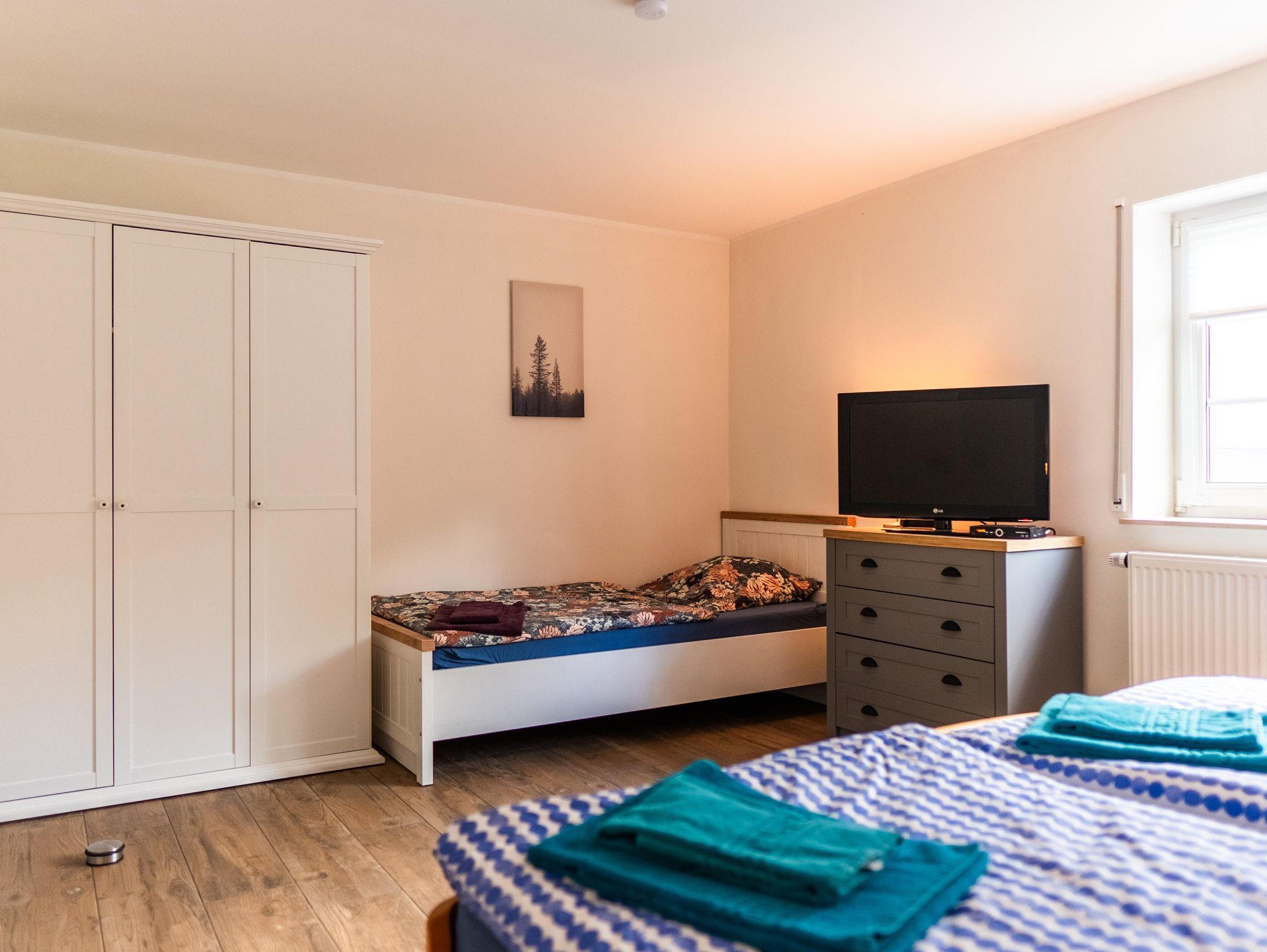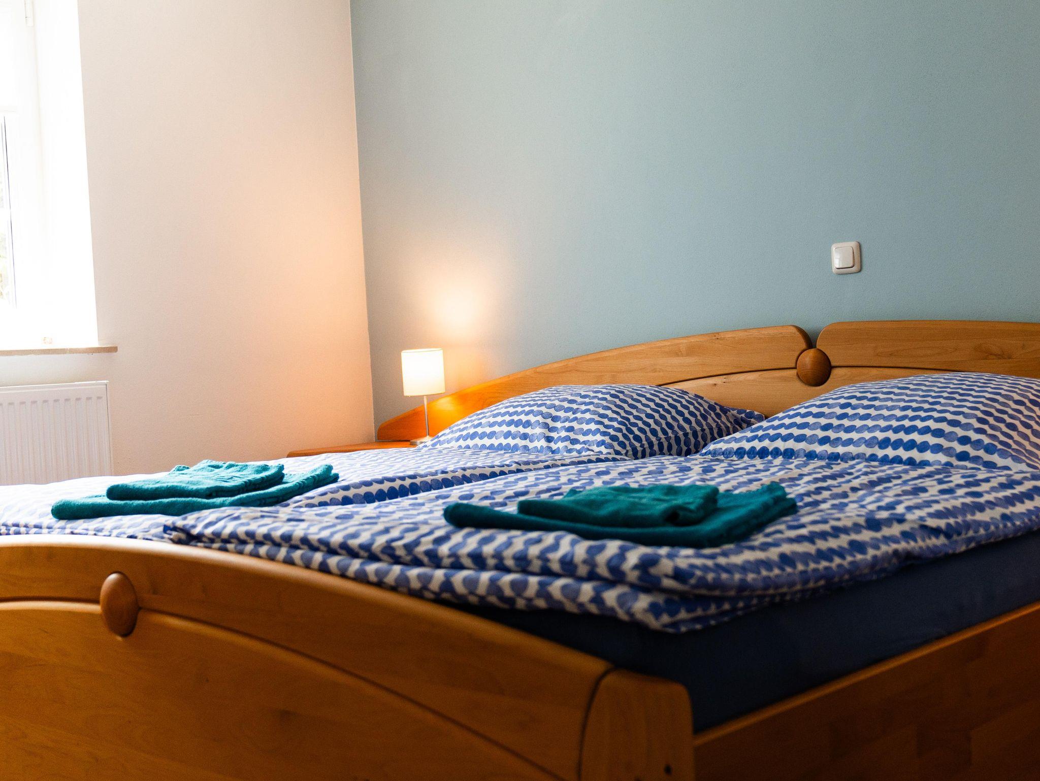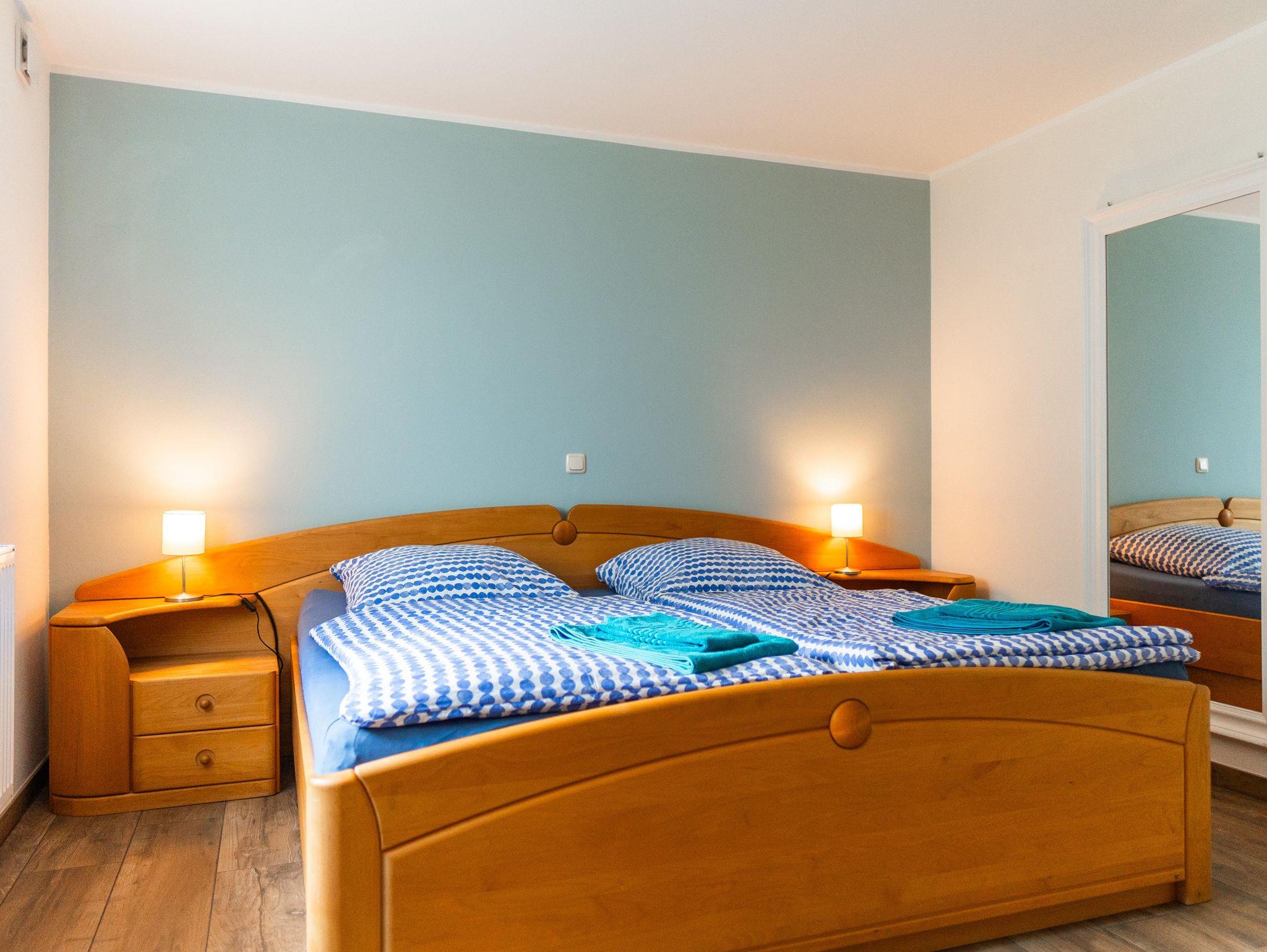Unsere Ferienwohnung verfügt über ein Schlafzimmer mit Doppelbett und zusätzlichem Einzelbett sowie einem zweiten Schlafzimmer mit Einzelbett. Des Weiteren besteht die Möglichkeit für zwei weitere Personen die Schlafcouch zu nutzen.