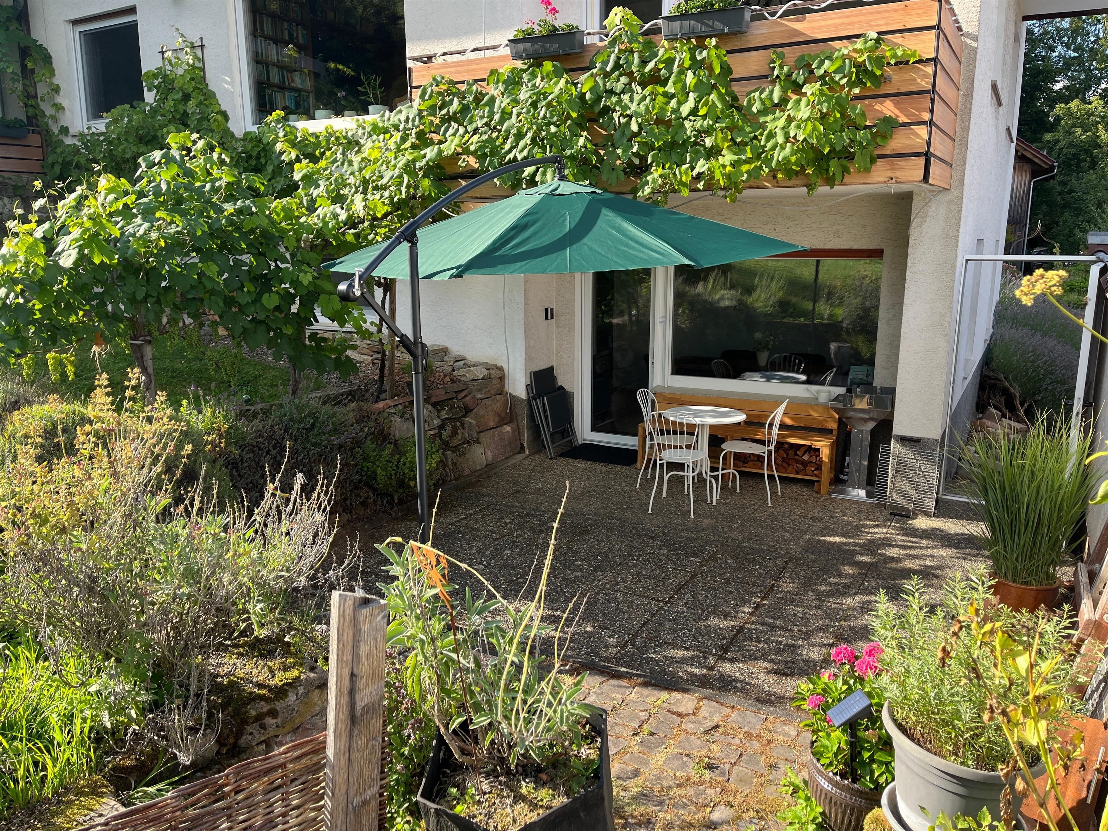- private, teilüberdachte Terrasse mit Sonnenschirm