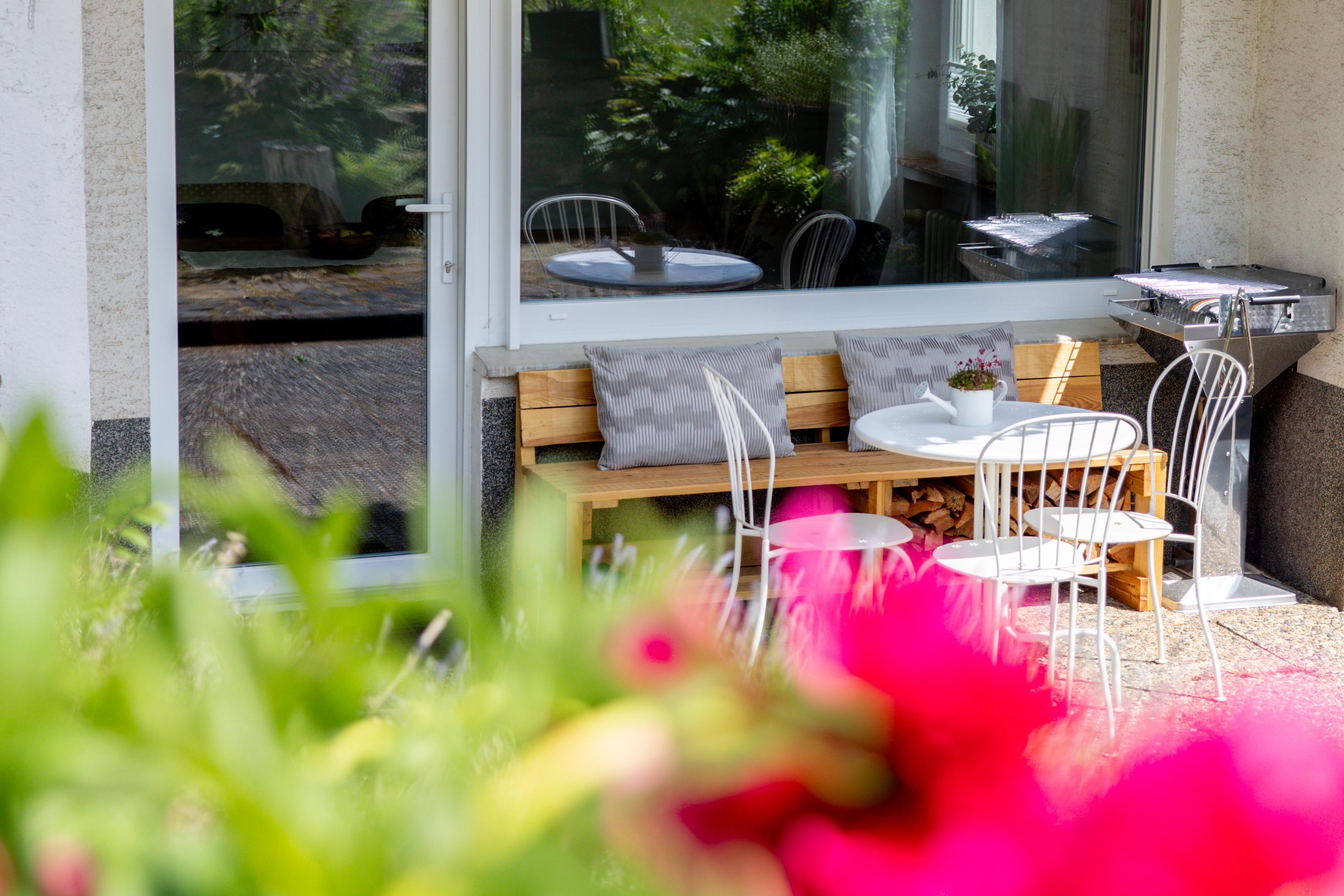Die Terrasse vor der Wohnung bietet genügend Platz für Eure Fahrräder, zum Grillen oder für ein Glas Wein beim Sonnenuntergang.