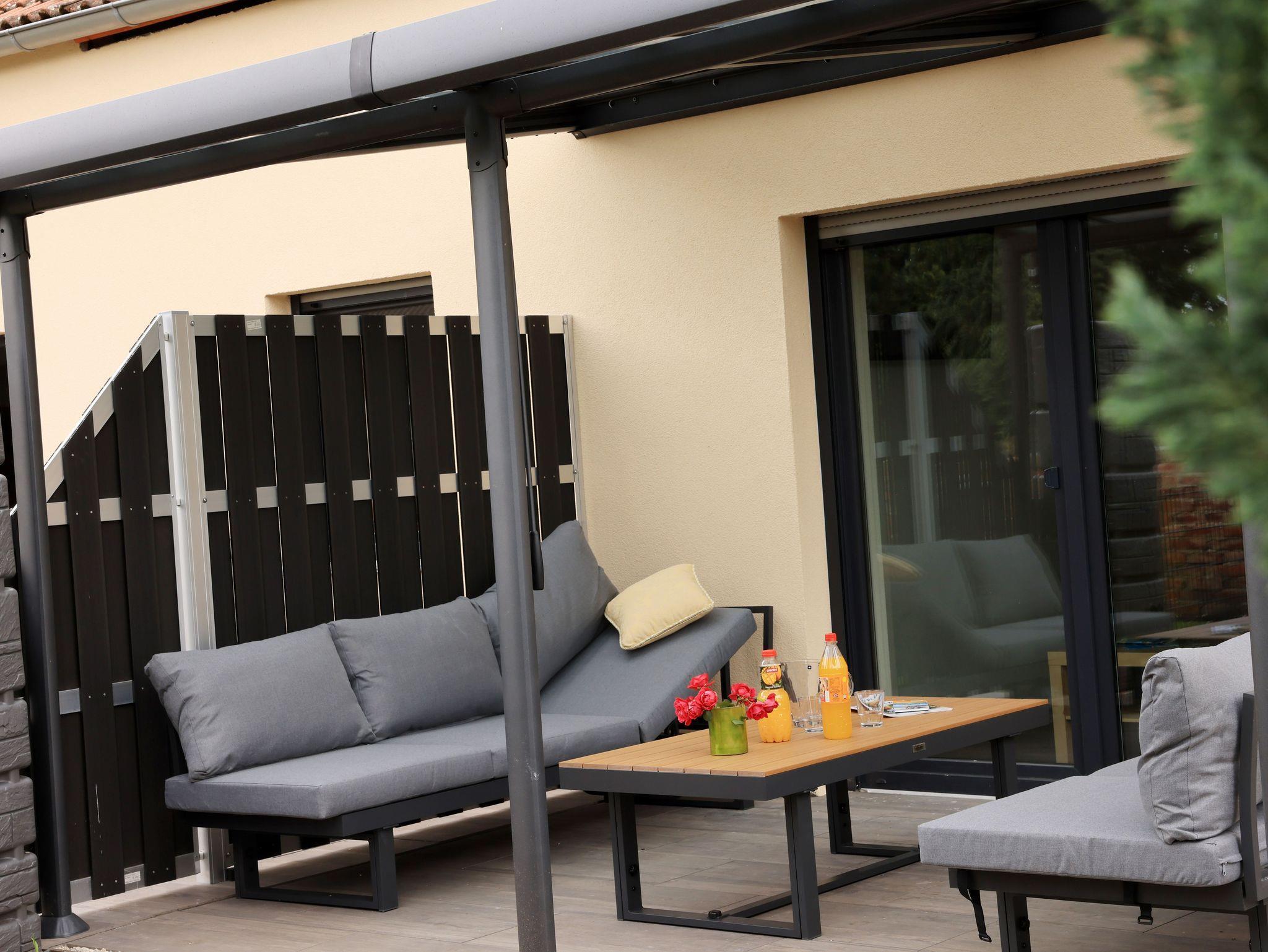 Südterrasse (teilüberdacht) mit Loungemöbeln und Esstisch (4 Stühle)
