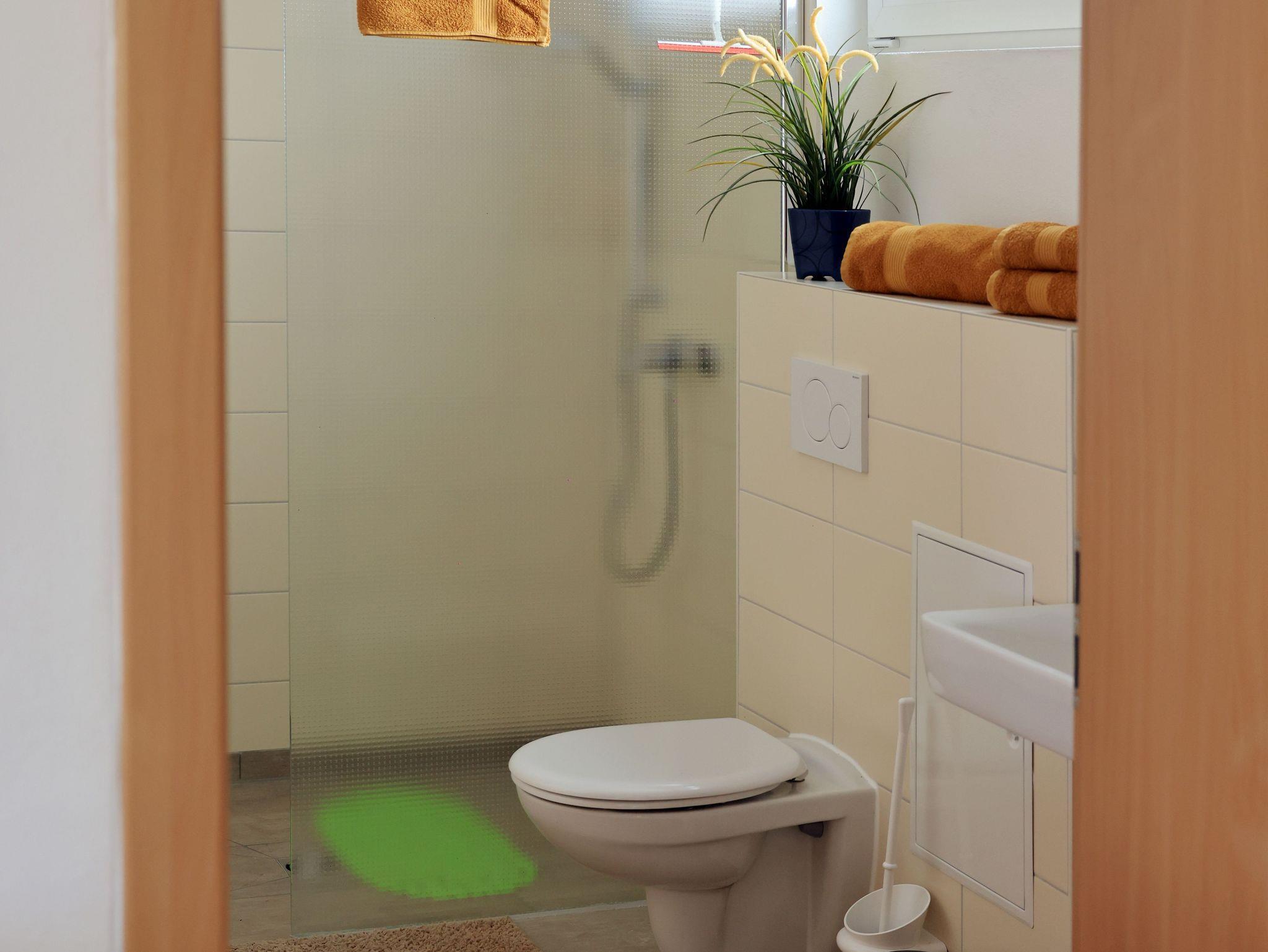 Das moderne und freundliche Bad ist mit ebenerdiger Dusche und WC ausgestattet.