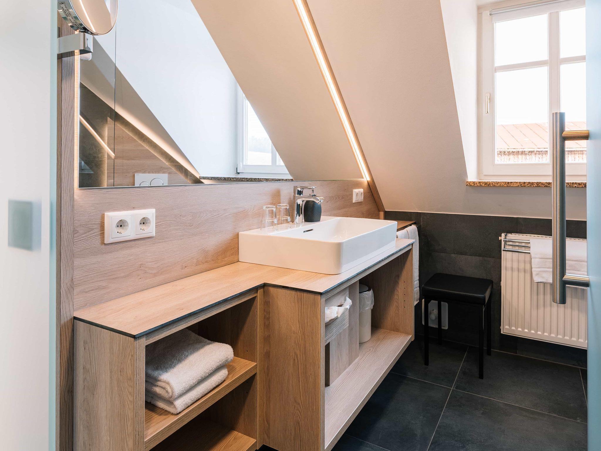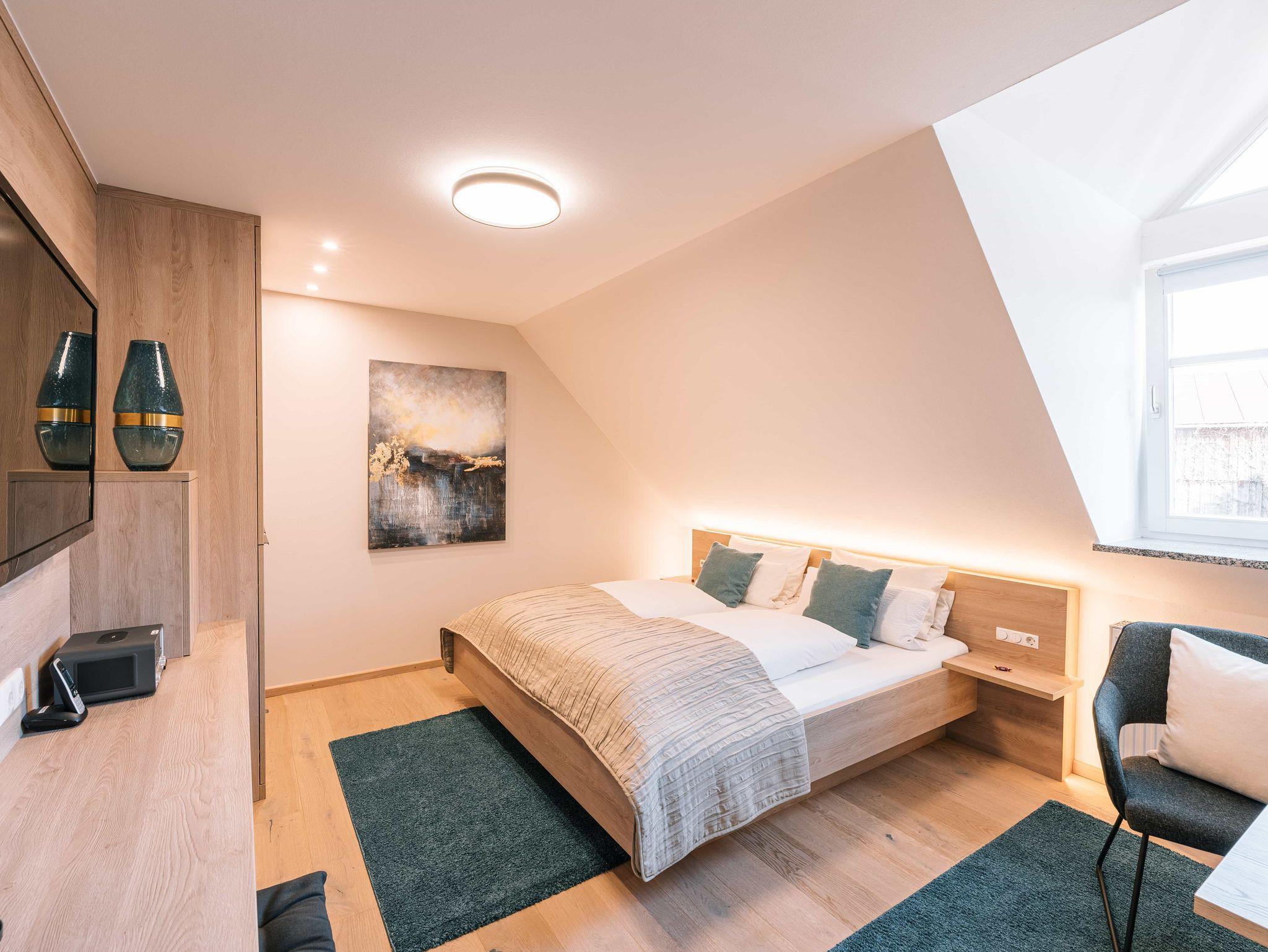 Kuscheliges Doppelzimmer mit Sitzgruppe, Flachbildfernseher, Stereoanlage, Telefon, Kühlschrank, Wasserkocher, Schreibtisch, Safe, ebenerdiger Dusche, WC, Kosmetikspiegel, Haarfön und kostenlosem WLAN.