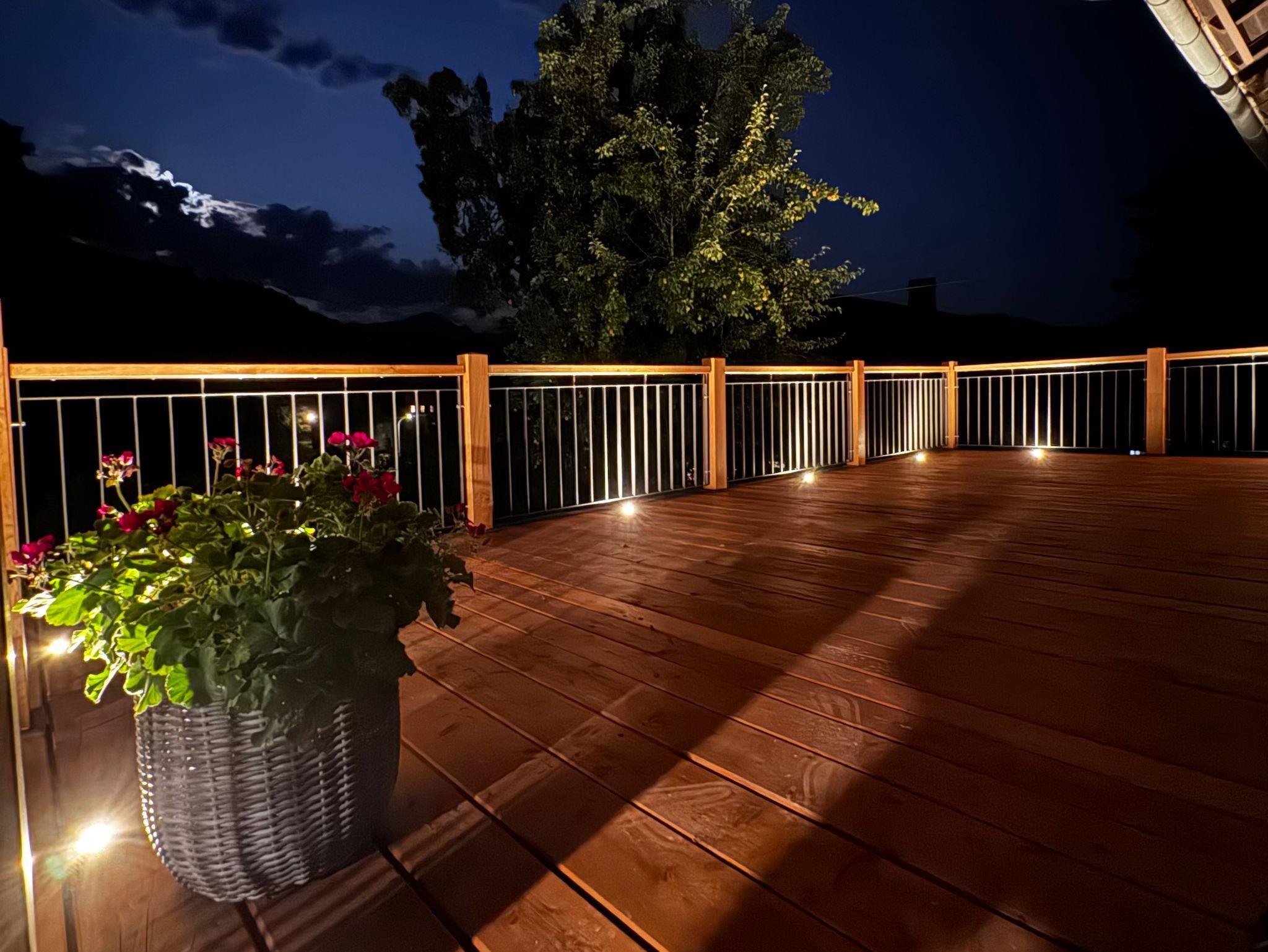 Genießen Sie einen wunderschönen, erholsamen Urlaub auf unserer großen Terrasse im 1. OG mit Sonnenschirm und Liegen.