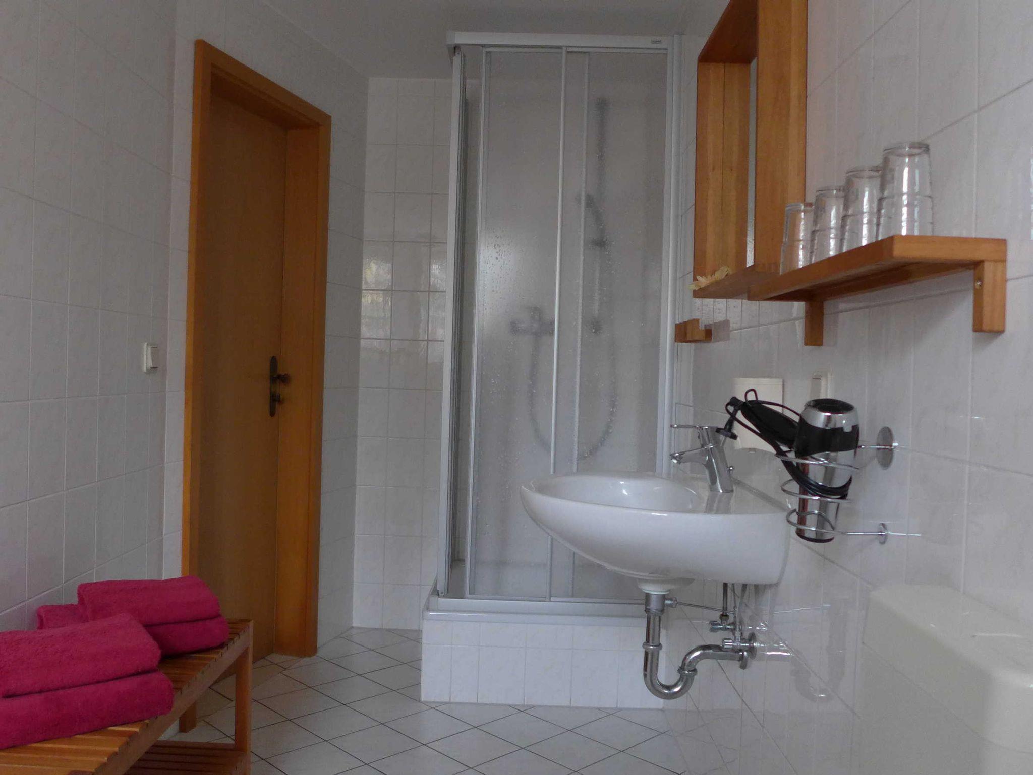 Unsere Wohnungen Käthe ist bis maximal 2 Personen und einem Kleinkind - Baby buchbar, ausgestattet mit einem geräumigen Duschbad, Küche incl. Geschirrspüler, Kühlschrank und Induktionsherd.