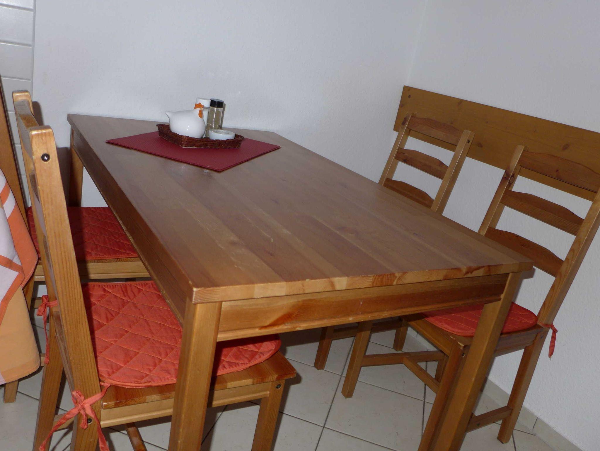 Gemütlicher Wohn-Schlafraum, Küche mit großem Esstisch, Flur und Bad.
