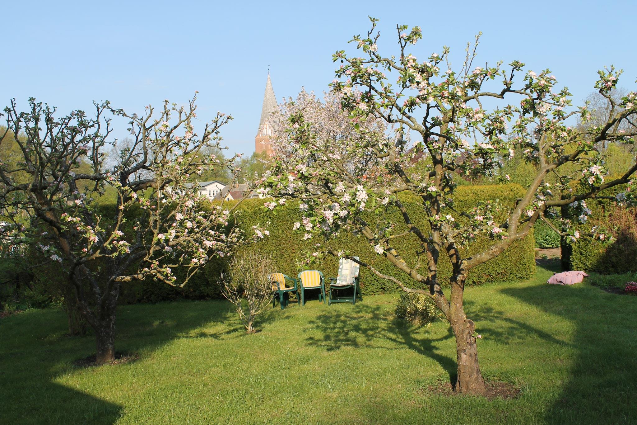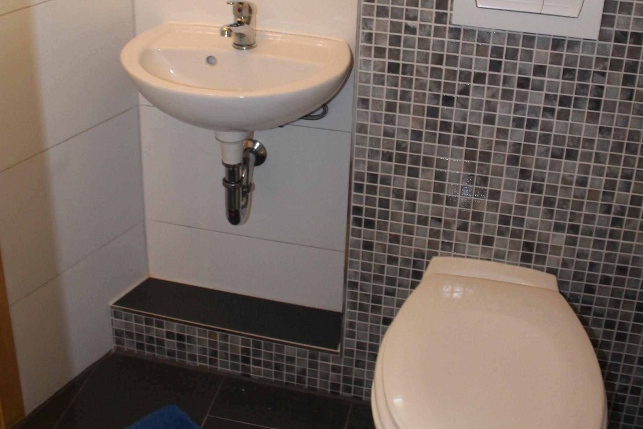 Ground floor: (Entrance(shared with the owner )) On the 1st floor(via fairly steep stairs): (open kitchen(dining table, electric kettle, toaster, cooker(4 ring stoves), coffee machine, oven, fridge(+ freezer)), Living/diningroom(TV, seating area, radio), Bedroom with bathroom(double king size bed(two single duvets)), bathroom(shower, washbasin, toilet, hairdryer), heating) garden(shared with the owner , fenced), bicycle storage, garden furniture, BBQ, parking