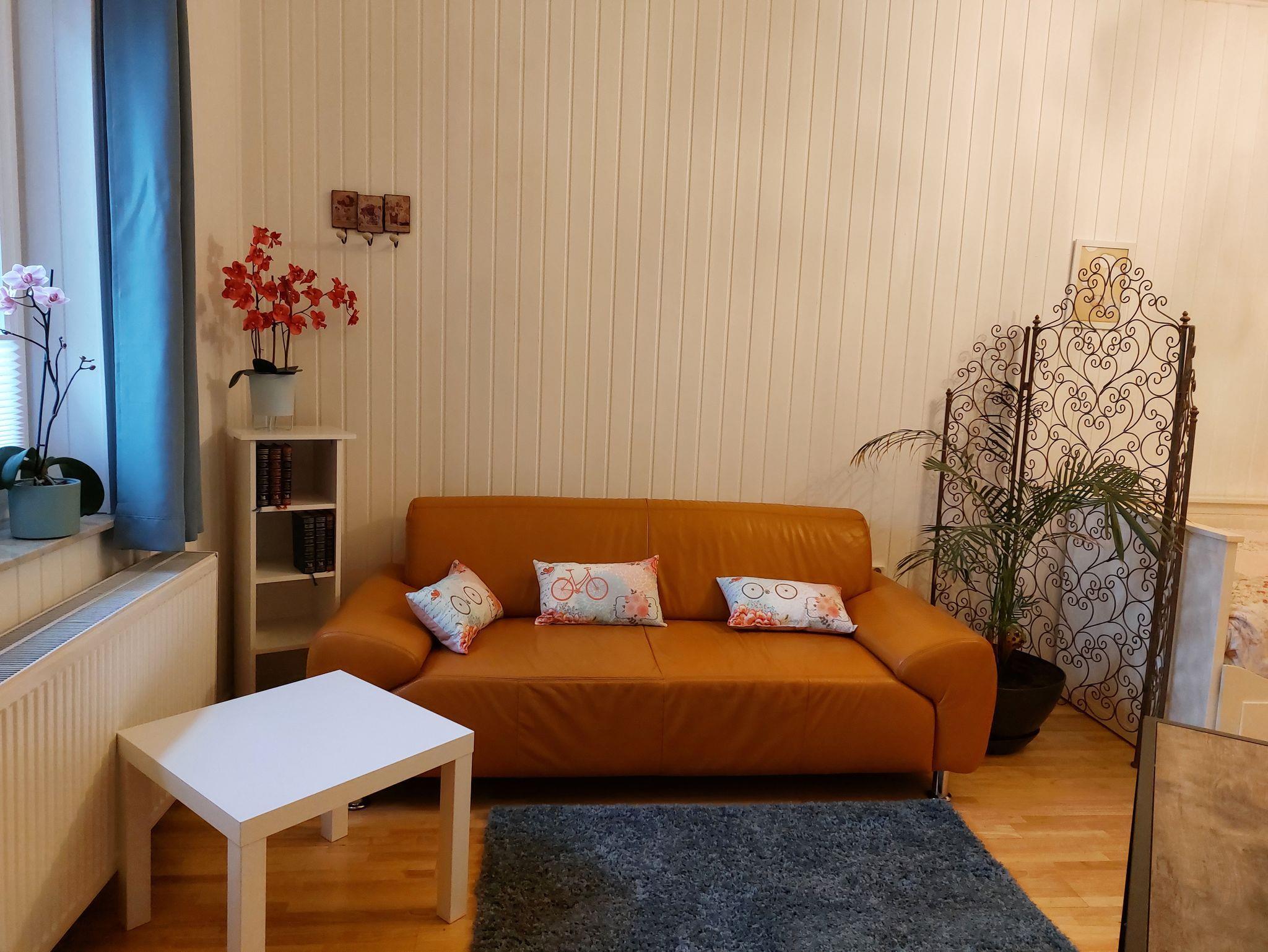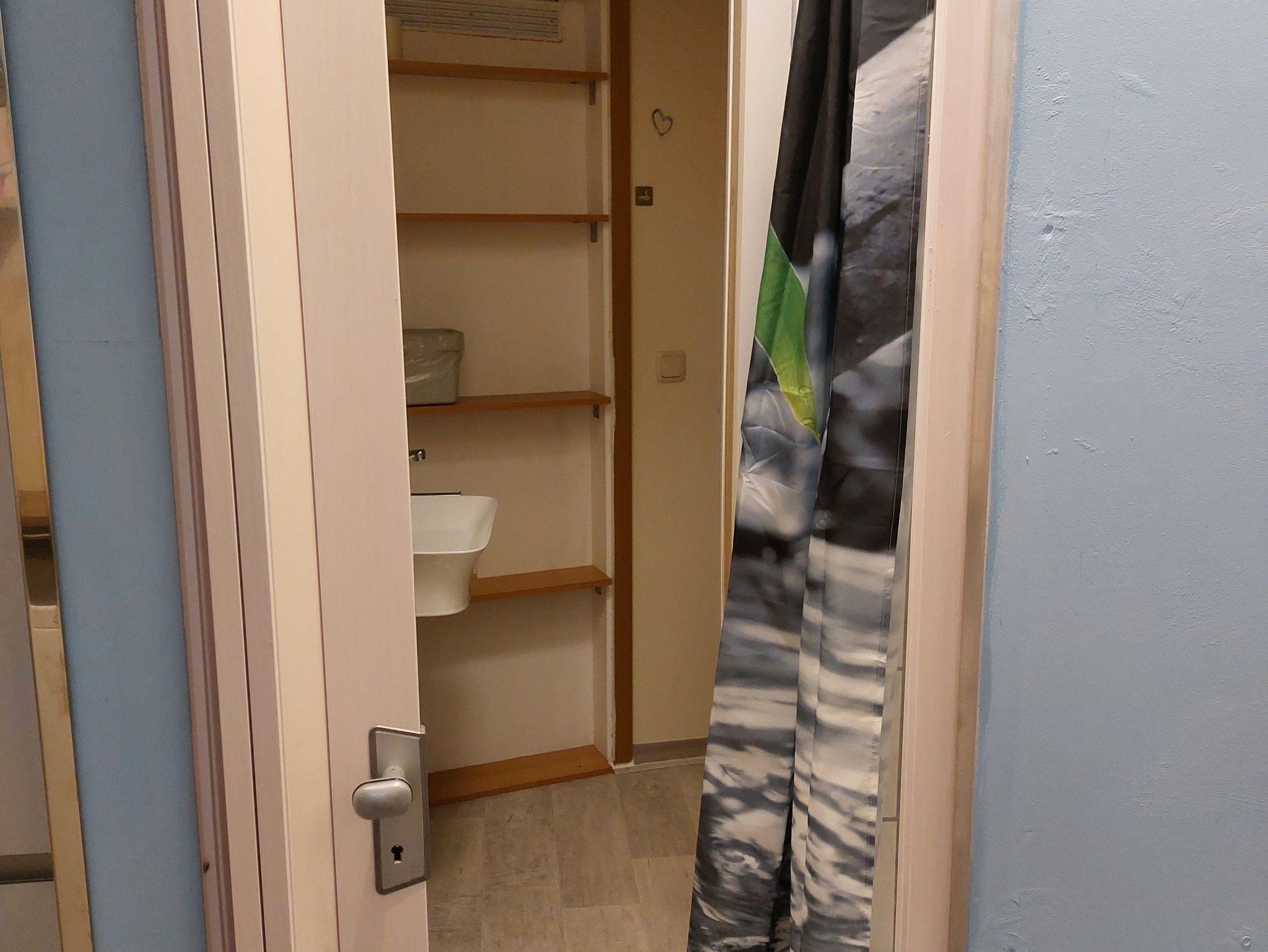Ferienwohnung mit Wohn/Schlafraum, Küche mit Geschirrspüler und Mikrowelle, Dusche und WC. Es gibt ein zweites WC zur Nutzung.