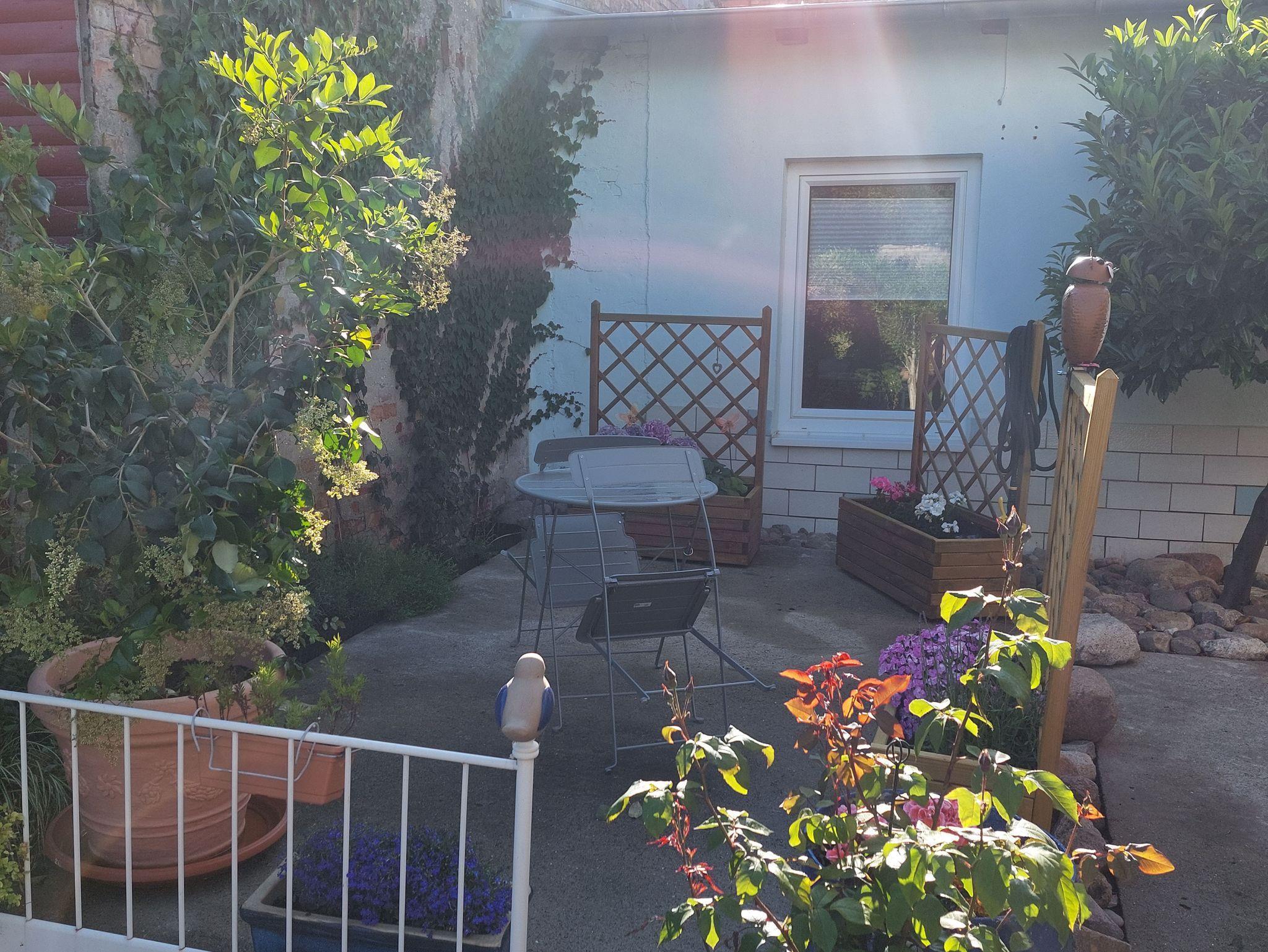Sie können eine kleine Terrasse im Garten nutzen, Tisch mit 2 Stühlen, 1 Liegestuhl
