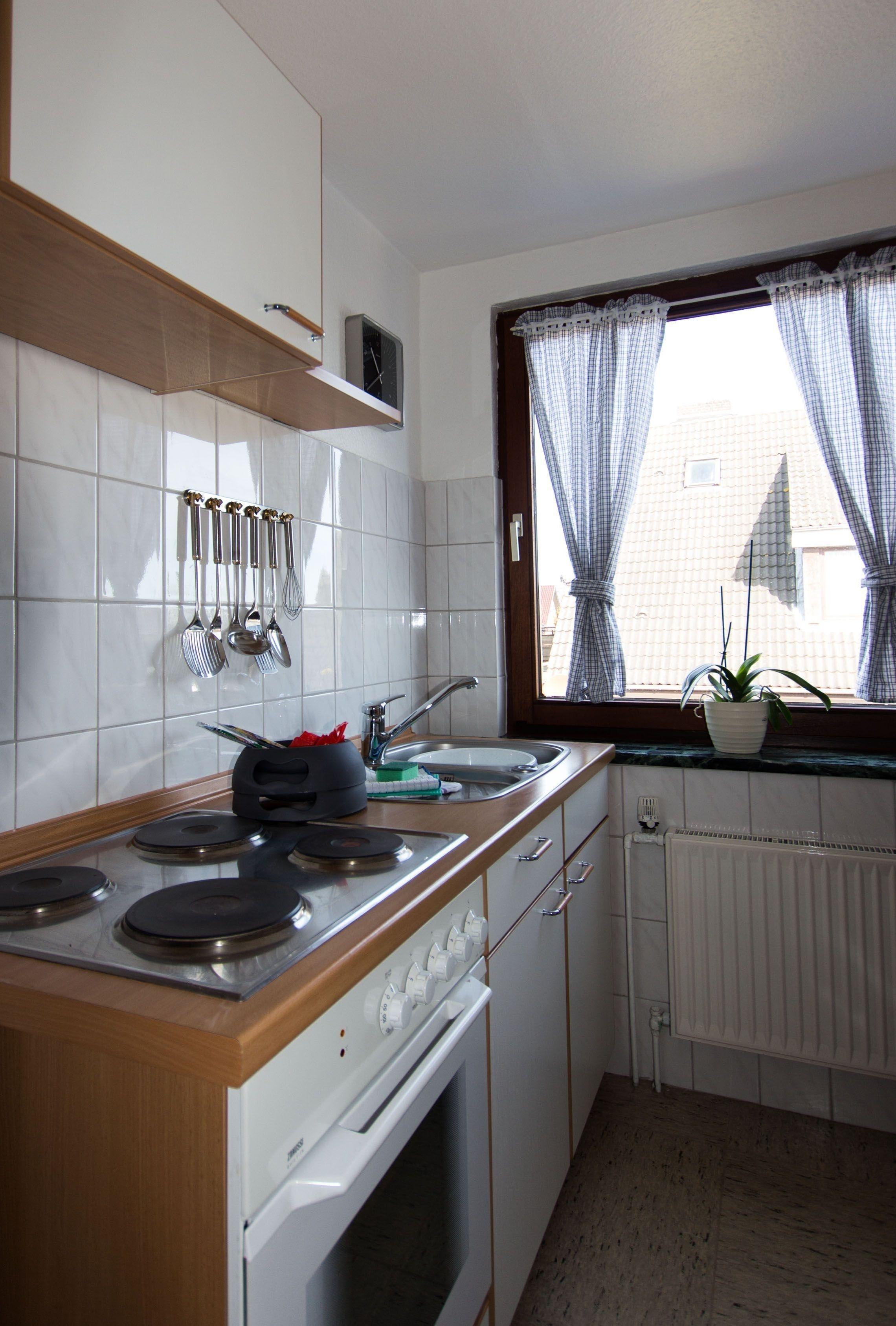 Küche mit voller Ausstattung incl. Mikrowelle und Backofen, Hochstuhl optional zustellbar.