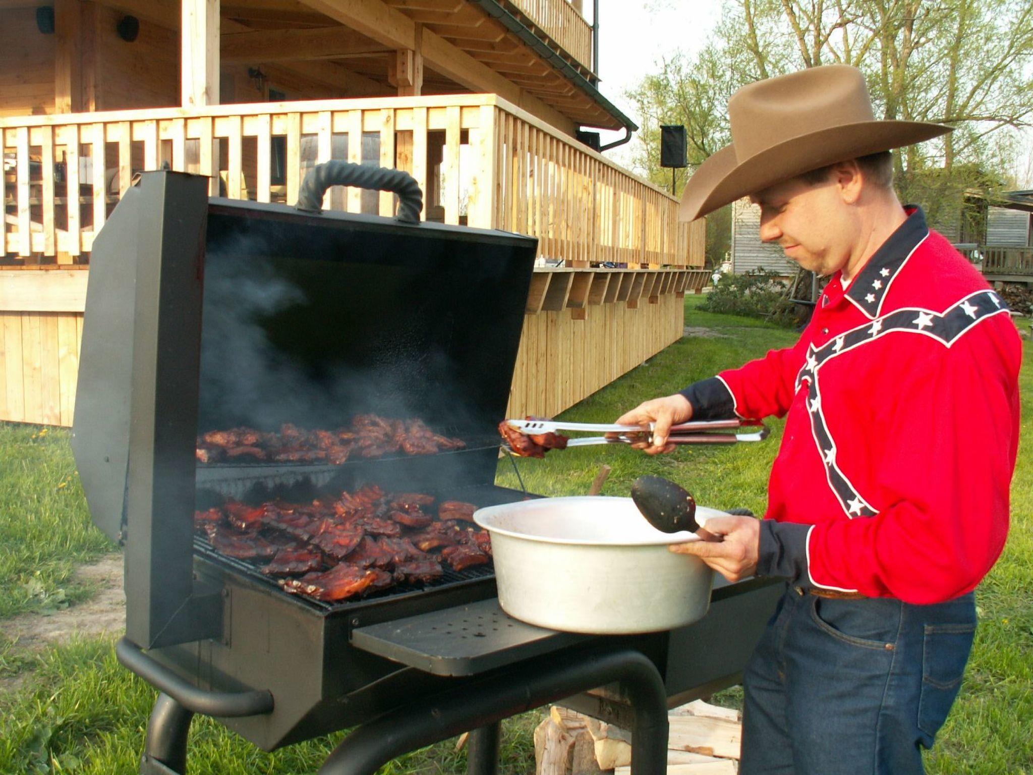 The ranch house is rustically furnished with a fireplace in the living room, fitted wooden kitchen, bathroom and two bedrooms. Enjoy the western-style ambience. The kitchen is fully equipped with an electric cooker with oven, fridge with freezer compartment, coffee machine, toaster and kettle. Don't fancy doing the washing up? No problem, a dishwasher is also available. Take a seat at the wooden dining table for four. The living room is also cosily furnished. Not only is there a CD radio, but also a satellite TV. Everything for a cosy atmosphere. The two bedrooms can sleep a total of four people, as there are two double beds measuring 1.60m x 2.00m each. In the living area there is of course a wood-burning stove. The bathroom has an extraordinary wooden bathtub and a toilet. There is electric heating and radiators in every room.