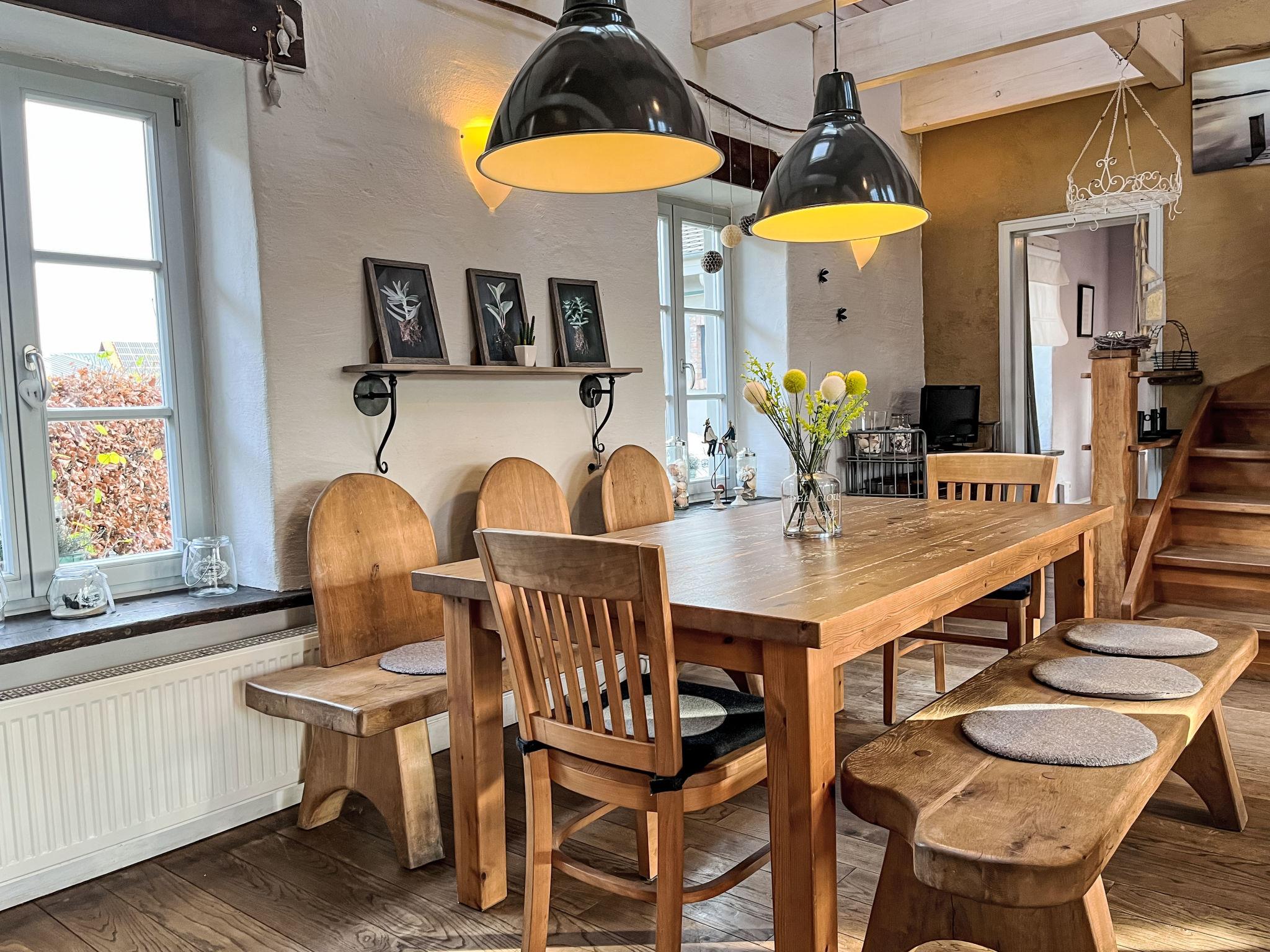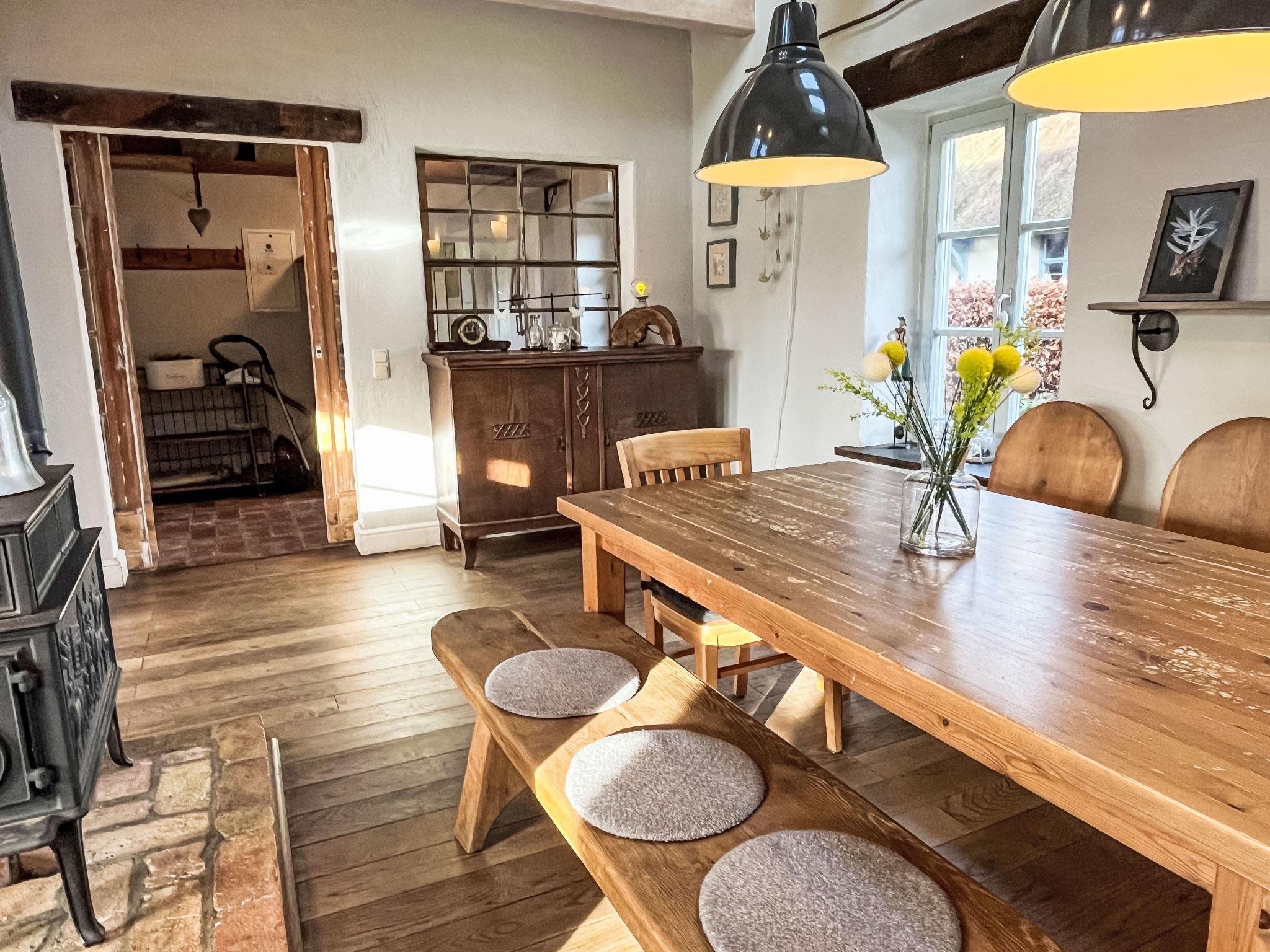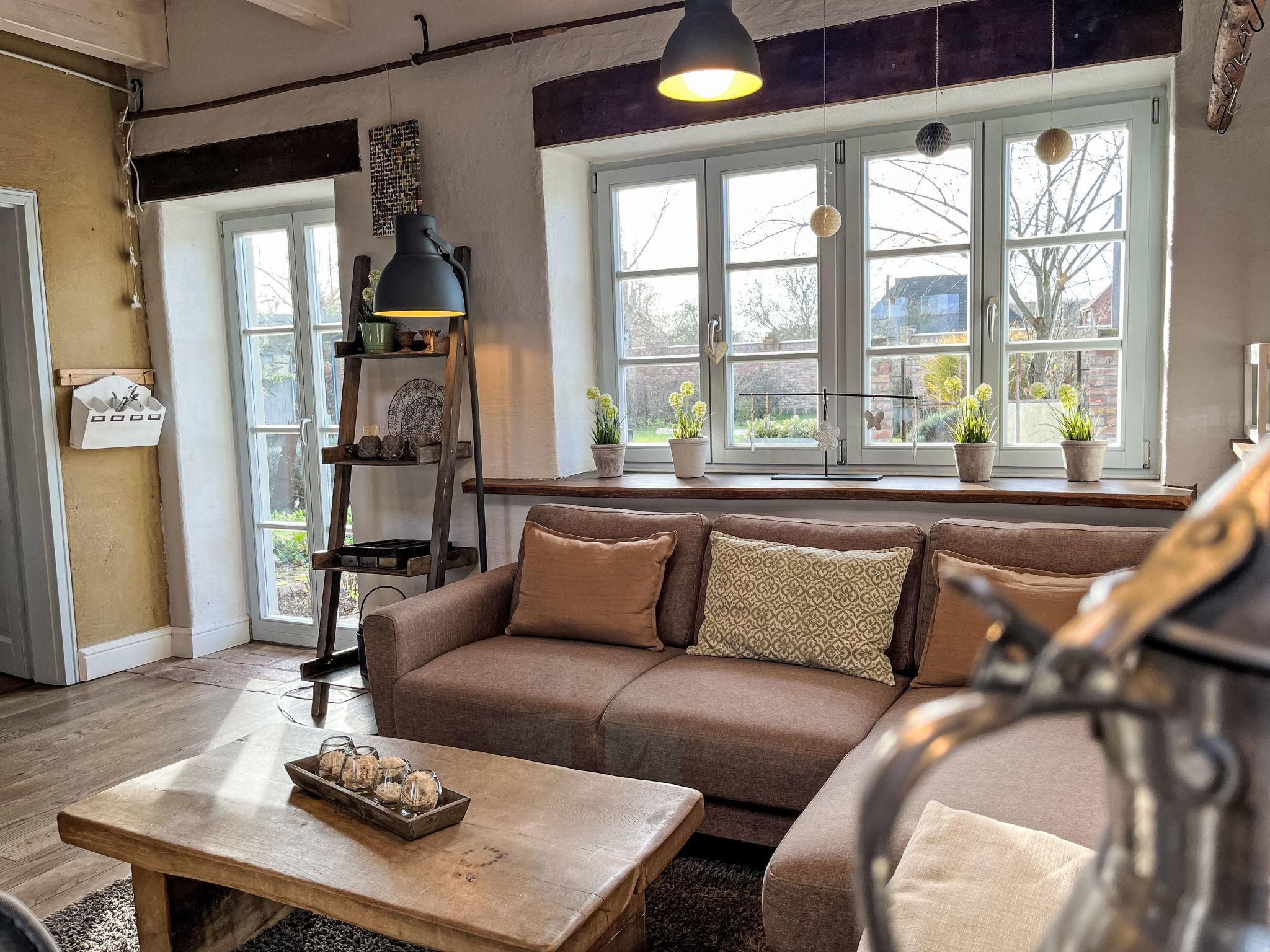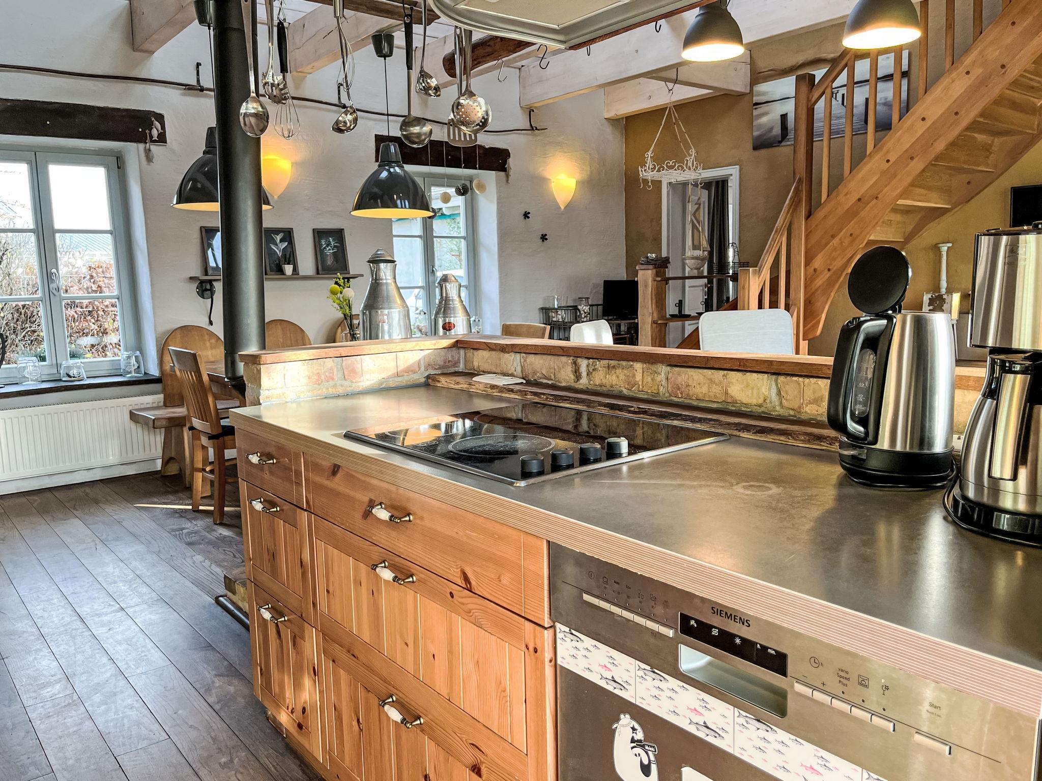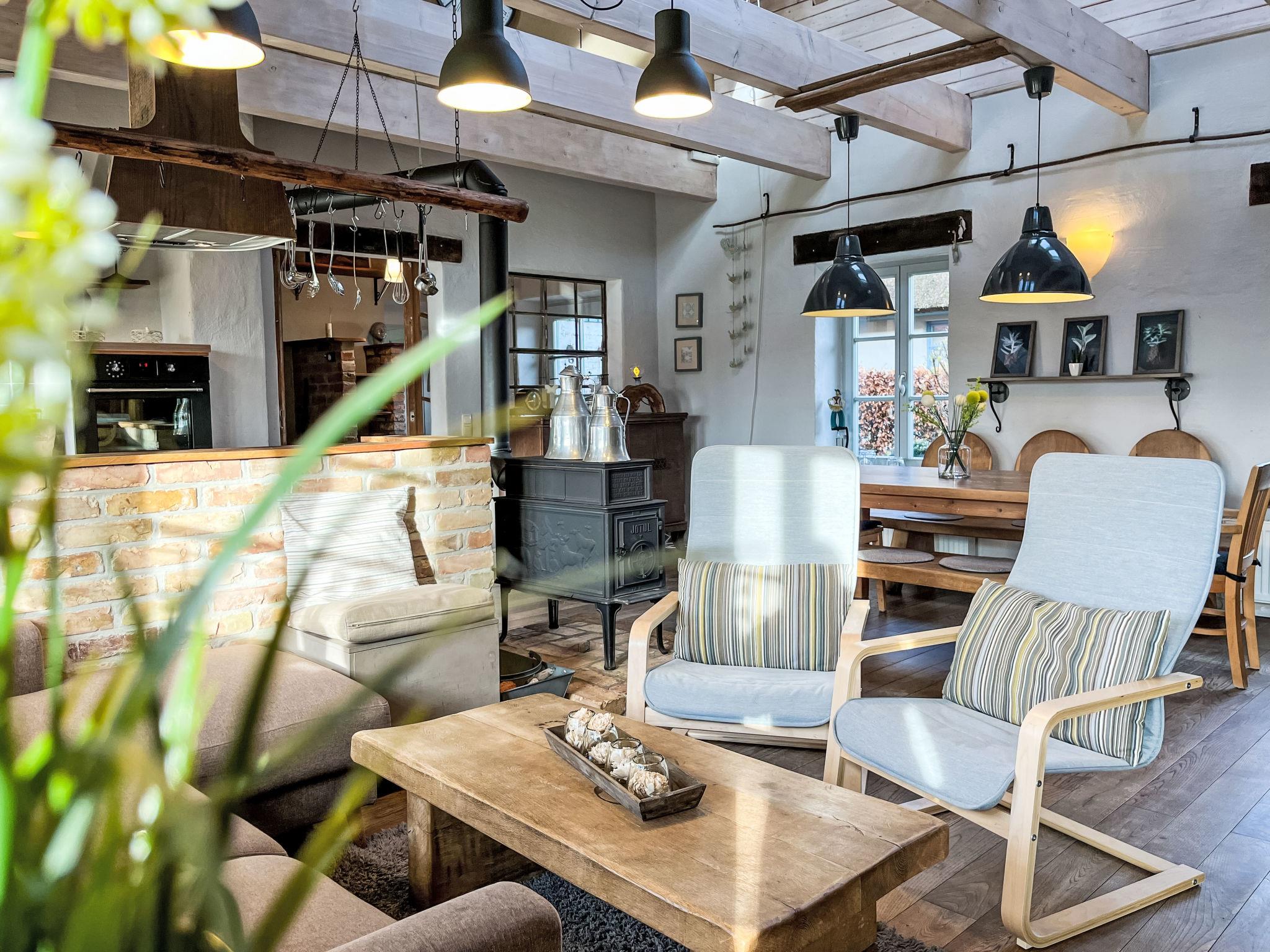 "Ferienscheune", 5-room cottage 160 m2 on 2 levels. Object suitable for 8 adults. Comfortable and cosy furnishings: living/dining room with Scandinavian wood stove, dining table and cable TV (flat screen), radio and CD-player. Exit to the garden, to the terrace. 1 room with 1 double bed (160 cm, length 200 cm). 1 room with 2 beds (90 cm, length 200 cm). Open kitchen (oven, dishwasher, 4 ceramic glass hob hotplates, toaster, kettle, electric coffee machine). Shower/WC. Upper floor: 1 room with 1 double sofabed (160 cm, length 200 cm). 1 room with 1 double bed (160 cm, length 200 cm). Bath/shower/WC. Comfortable furnishings in the country house style. Terrace. Terrace furniture. Beautiful view of the garden. Facilities: children's high chair, baby cot, hair dryer. Internet (WiFi, free). Parking (2 cars). Please note: suitable for families. Non-smokers only. Maximum 1 pet/ dog allowed.
