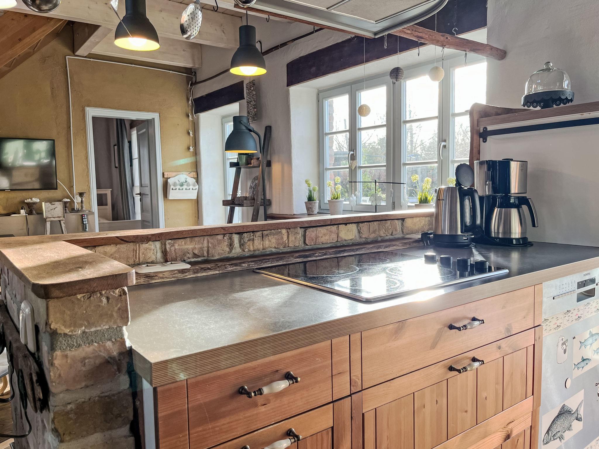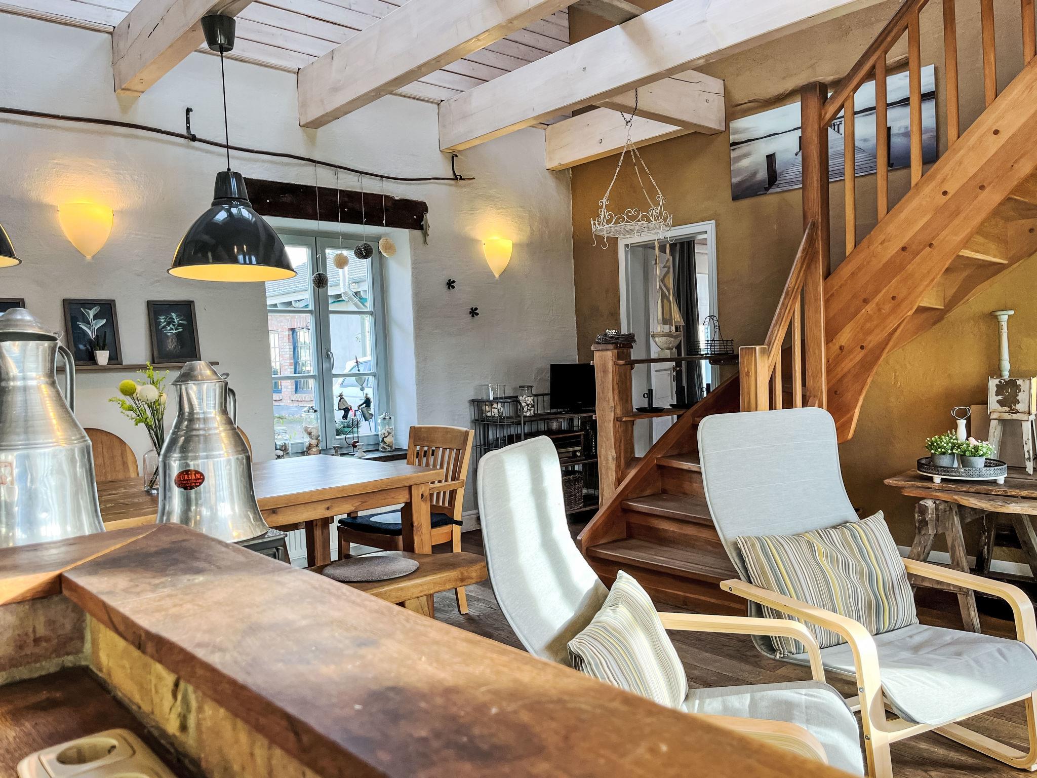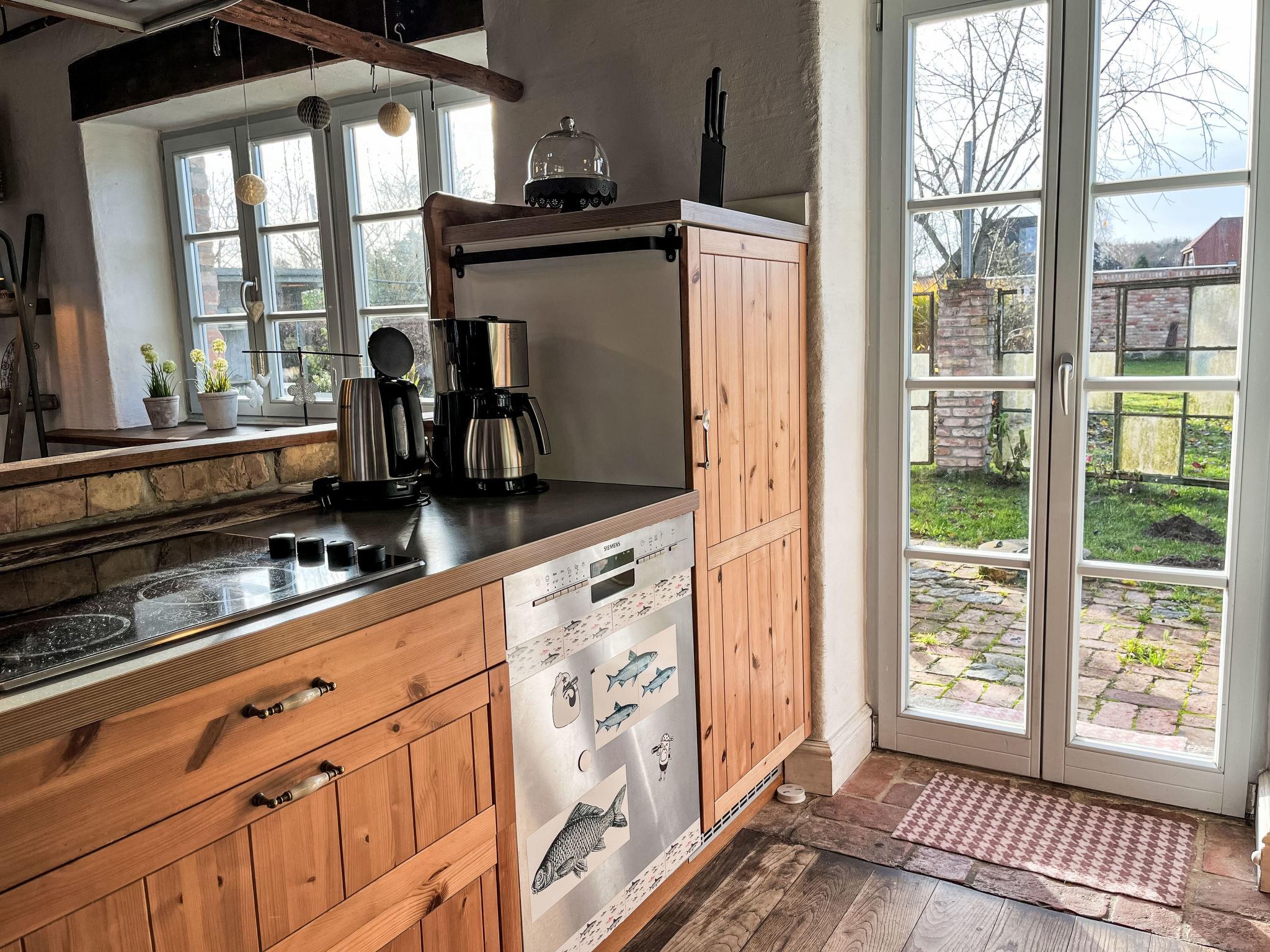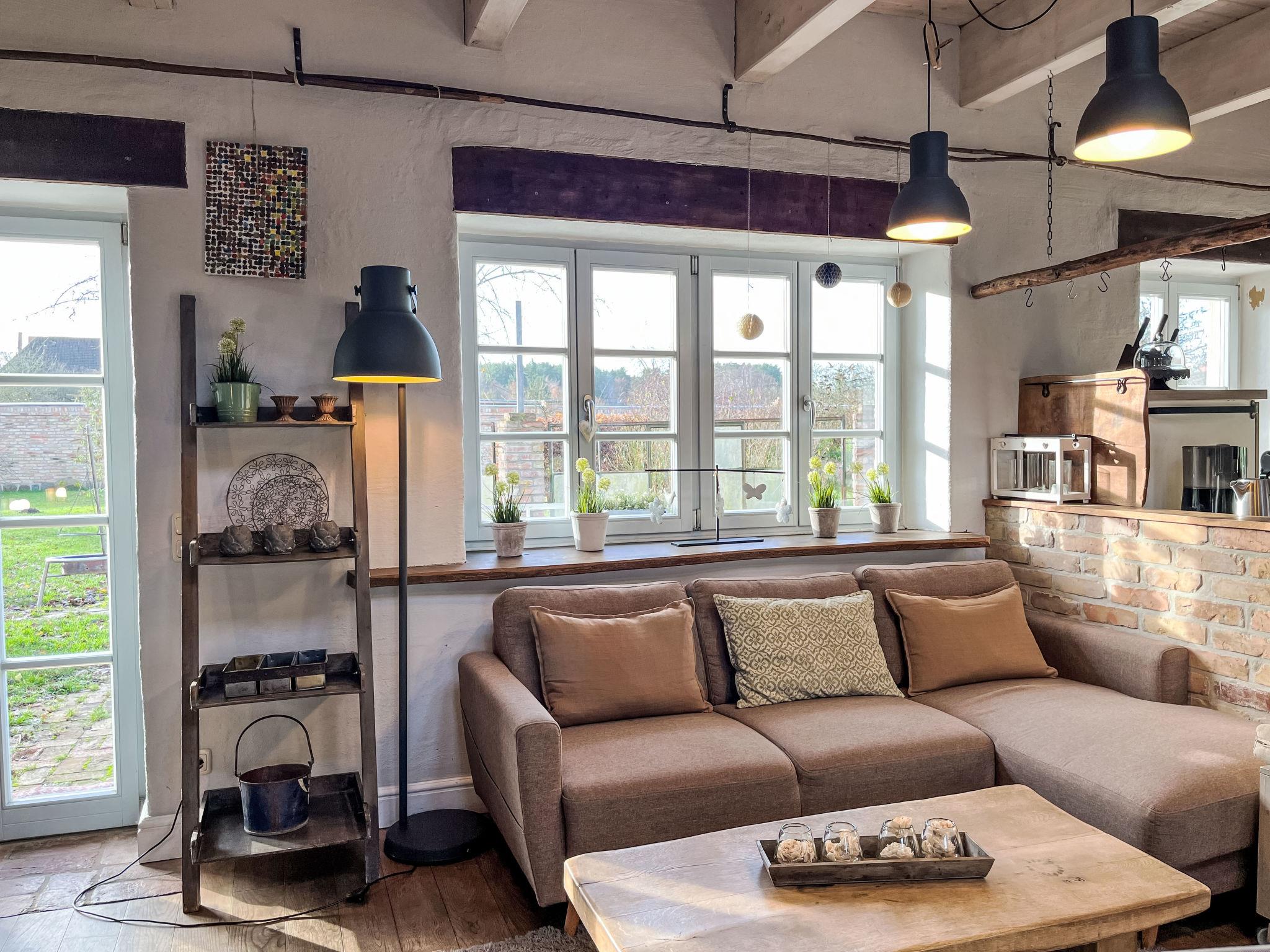 "Ferienscheune", 5-room cottage 160 m2 on 2 levels. Object suitable for 8 adults. Comfortable and cosy furnishings: living/dining room with Scandinavian wood stove, dining table and cable TV (flat screen), radio and CD-player. Exit to the garden, to the terrace. 1 room with 1 double bed (160 cm, length 200 cm). 1 room with 2 beds (90 cm, length 200 cm). Open kitchen (oven, dishwasher, 4 ceramic glass hob hotplates, toaster, kettle, electric coffee machine). Shower/WC. Upper floor: 1 room with 1 double sofabed (160 cm, length 200 cm). 1 room with 1 double bed (160 cm, length 200 cm). Bath/shower/WC. Comfortable furnishings in the country house style. Terrace. Terrace furniture. Beautiful view of the garden. Facilities: children's high chair, baby cot, hair dryer. Internet (WiFi, free). Parking (2 cars). Please note: suitable for families. Non-smokers only. Maximum 1 pet/ dog allowed.