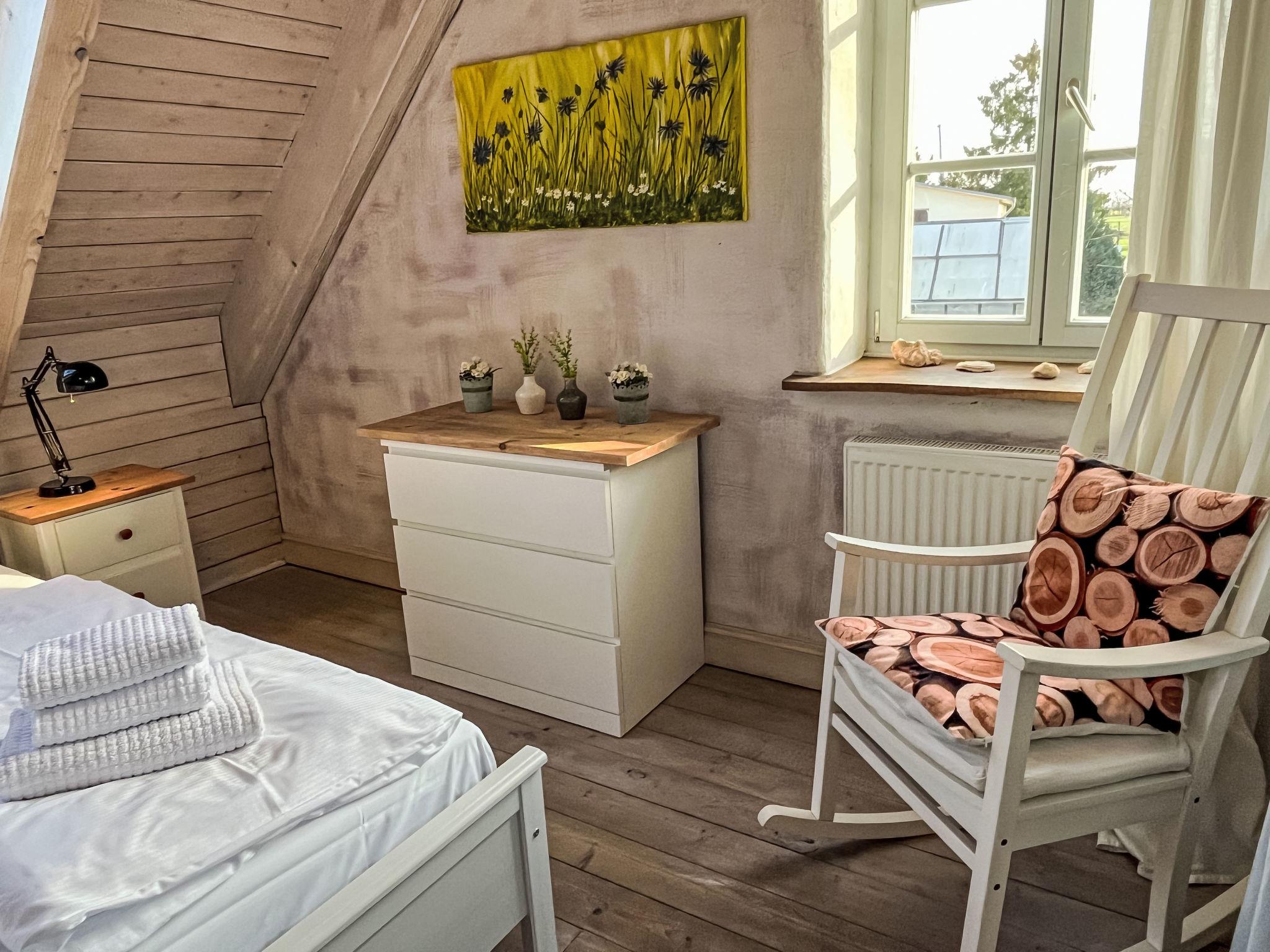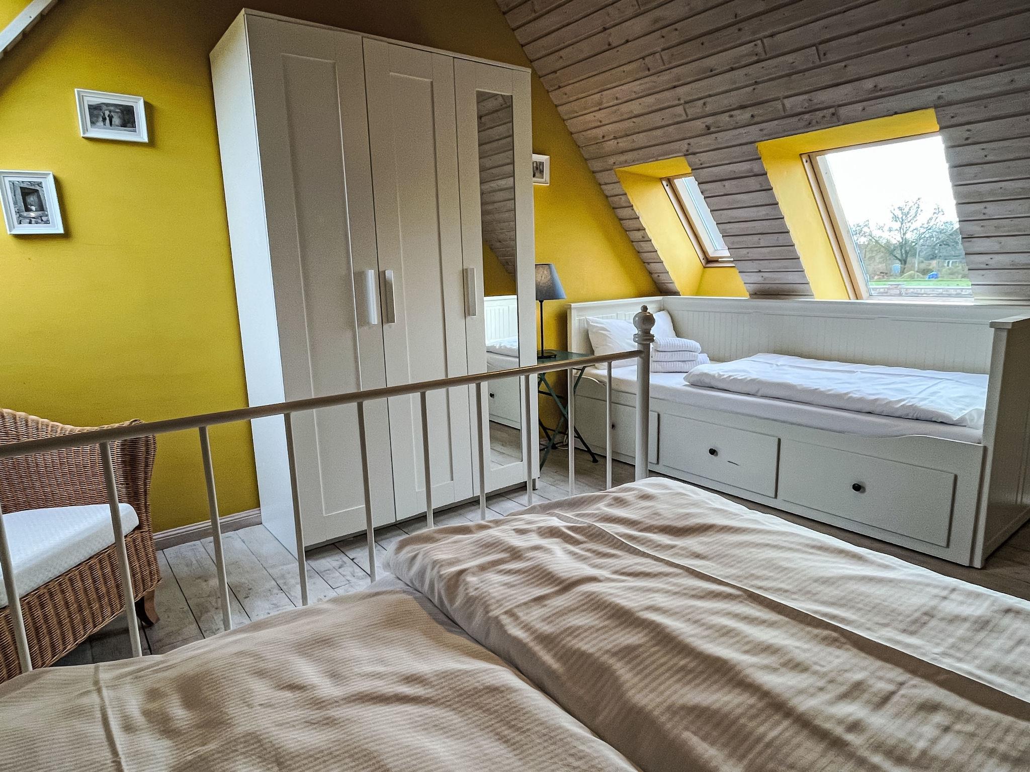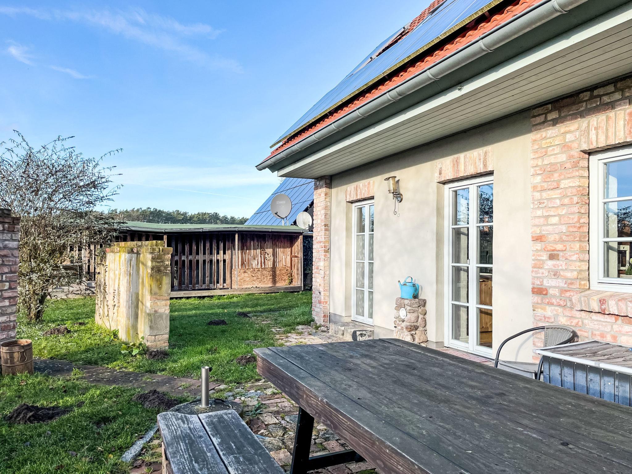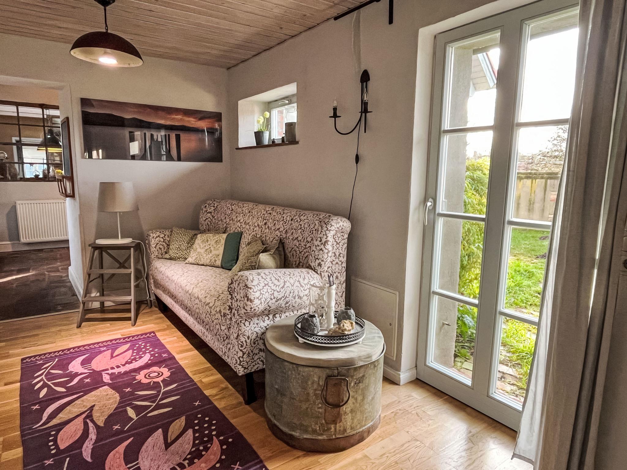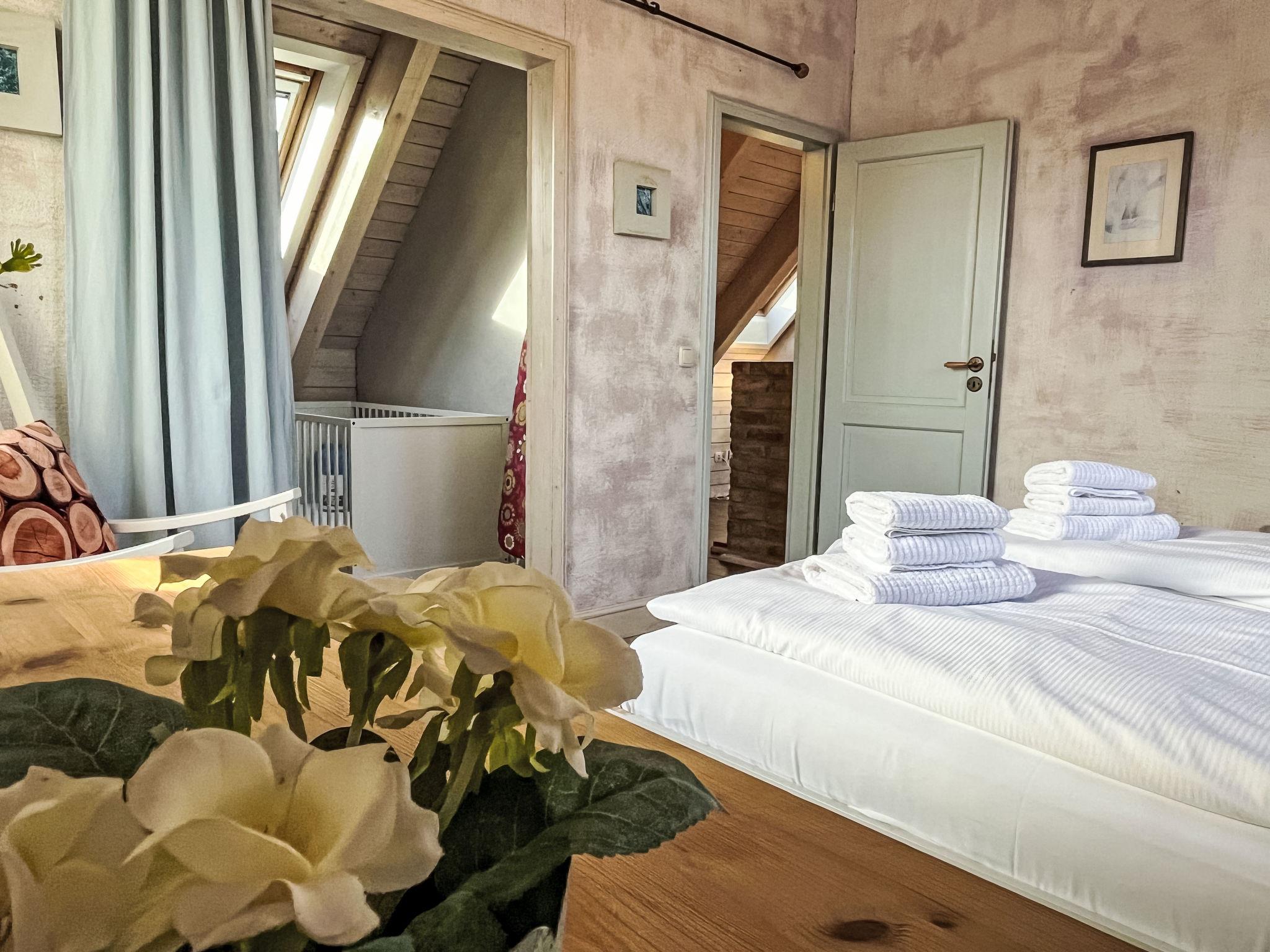 "Ferienscheune", 5-room cottage 160 m2 on 2 levels. Object suitable for 8 adults. Comfortable and cosy furnishings: living/dining room with Scandinavian wood stove, dining table and cable TV (flat screen), radio and CD-player. Exit to the garden, to the terrace. 1 room with 1 double bed (160 cm, length 200 cm). 1 room with 2 beds (90 cm, length 200 cm). Open kitchen (oven, dishwasher, 4 ceramic glass hob hotplates, toaster, kettle, electric coffee machine). Shower/WC. Upper floor: 1 room with 1 double sofabed (160 cm, length 200 cm). 1 room with 1 double bed (160 cm, length 200 cm). Bath/shower/WC. Comfortable furnishings in the country house style. Terrace. Terrace furniture. Beautiful view of the garden. Facilities: children's high chair, baby cot, hair dryer. Internet (WiFi, free). Parking (2 cars). Please note: suitable for families. Non-smokers only. Maximum 1 pet/ dog allowed.