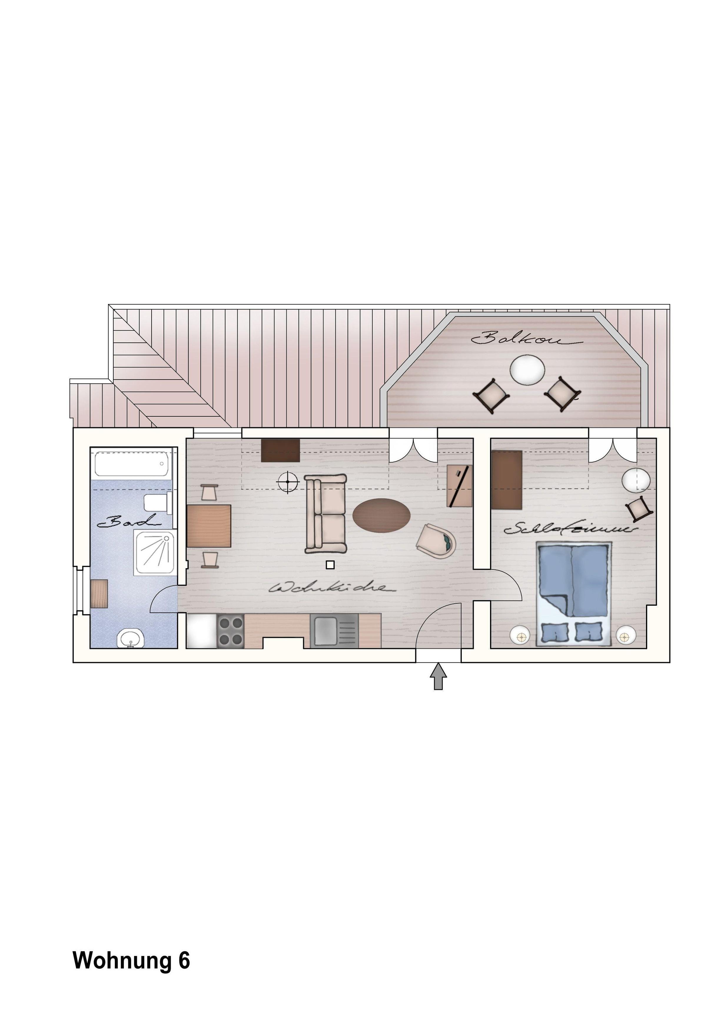 Traumhafte Ferienwohnung mit tollem Ausblick auf das Wasser im 2. OG mit Balkon für 1-2 Personen; 54 qm Wohnfläche, Wohnzimmer mit Küche, ein Schlafzimmer mit Doppelbett, ein Bad.