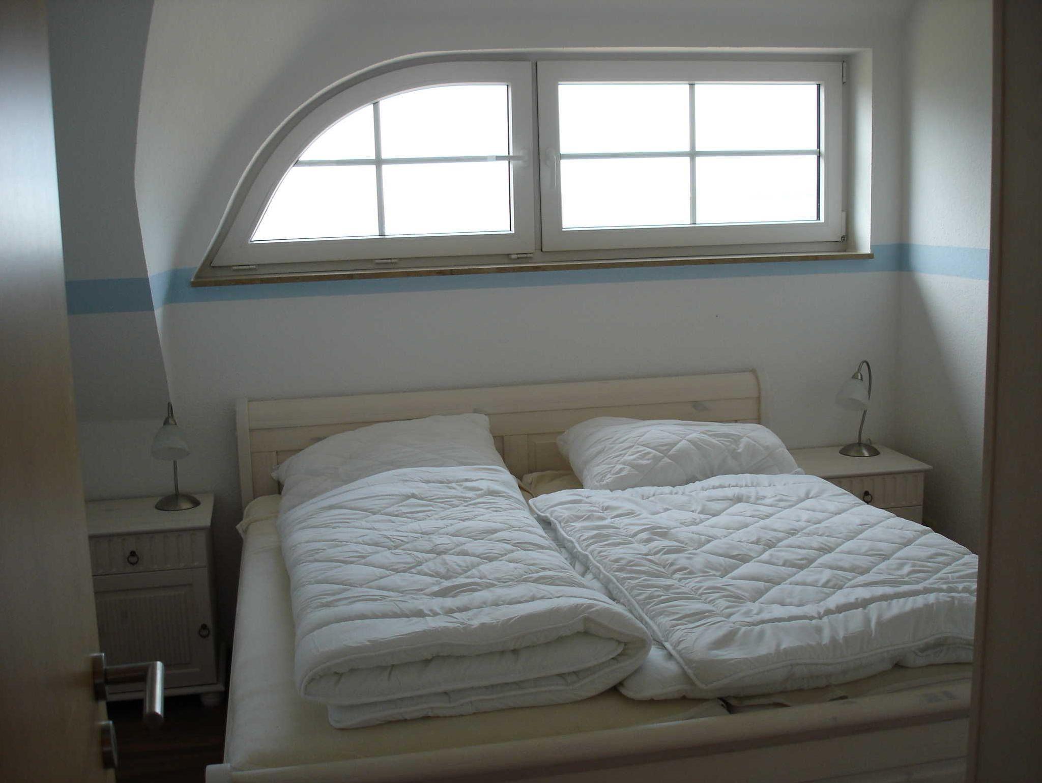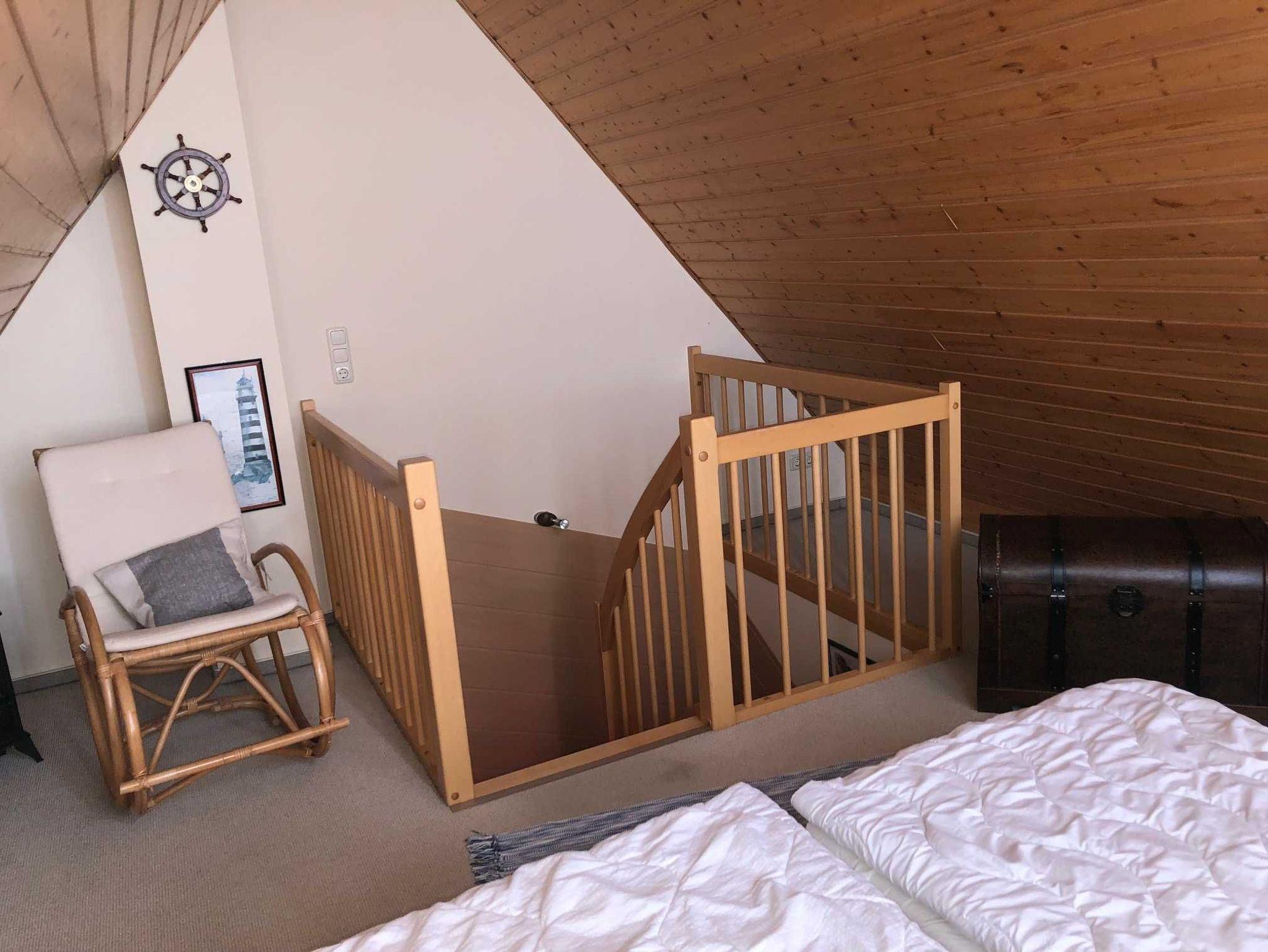 Das Haus Boddenblick - linke Seite - mit 3 Schlafzimmern für bis zu 6 Personen verfügt im Erdgeschoss über einen Wohnbereich mit Kamin, offene Küche, kleinen Flur und ein Gäste WC. Im Obergeschoss befinden sich 2 Schlafzimmer und ein Bad mit Dusche, WC, Waschplatz, kleiner Whirlpool und eine Sauna. Im offenen Spitzboden befindet sich das 3. Schlafzimmer.