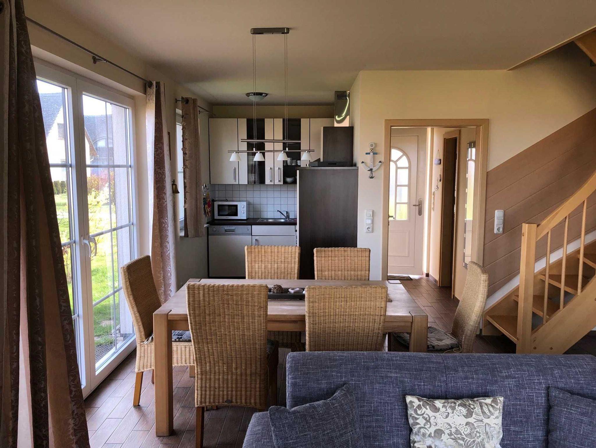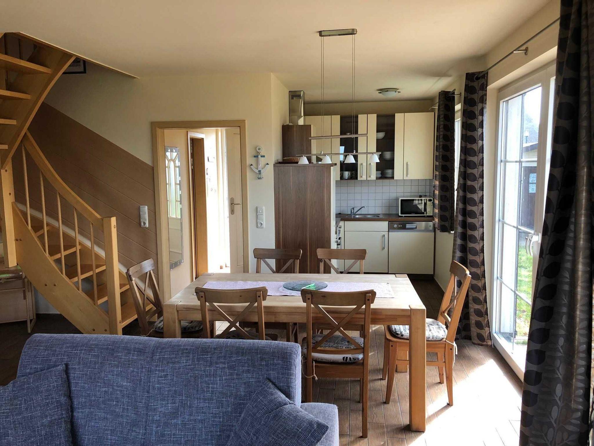 Das Haus Boddenblick - links - verfügt über einen kleinen Flur, einen Wohnbereich mit Kamin, offene Küche, Gäste WC im Erdgeschoss, 2 Schlafzimmer und Bad im Obergeschoss und ein 3. Schlafzimmer im offenem Spitzboden.