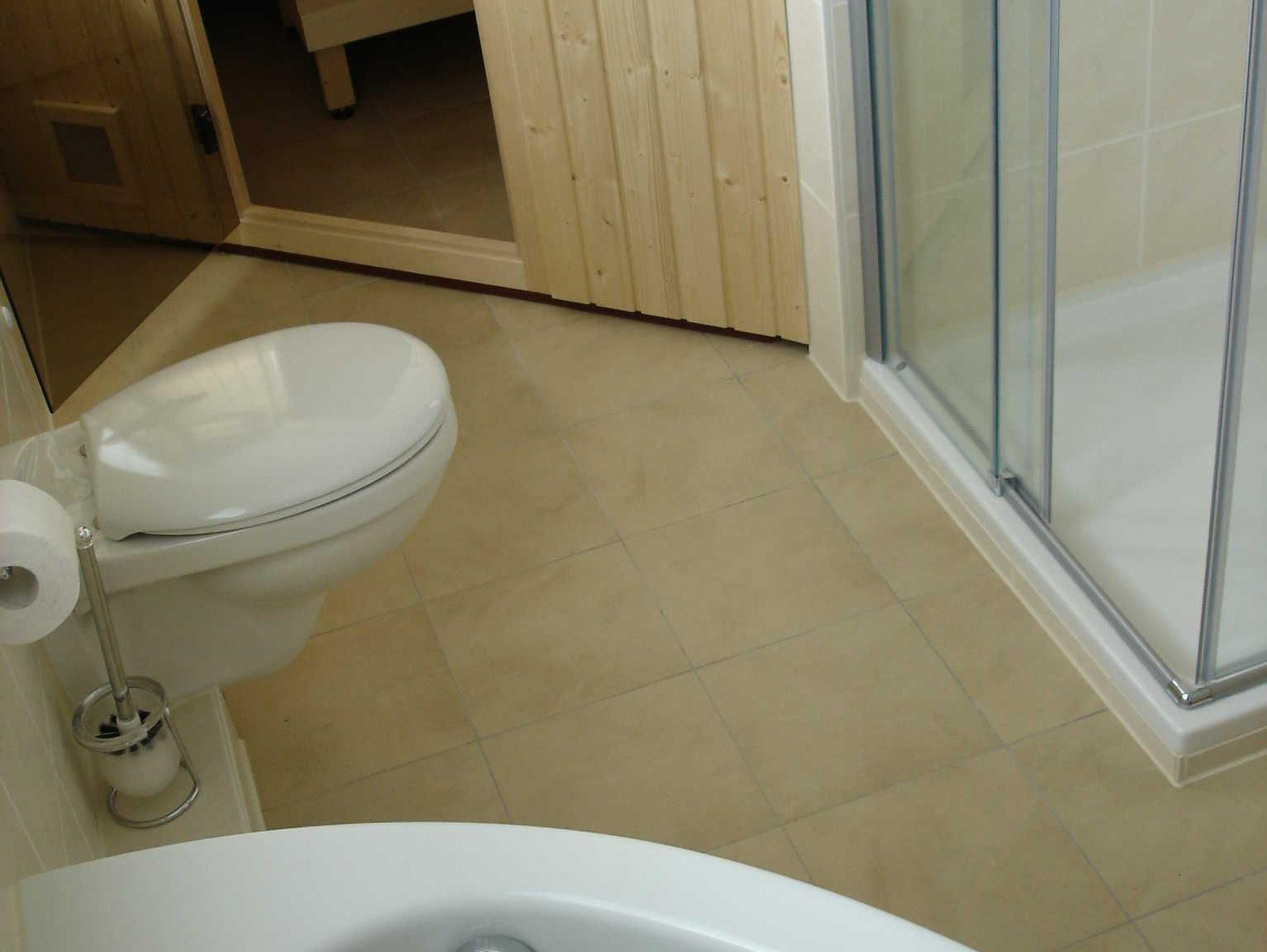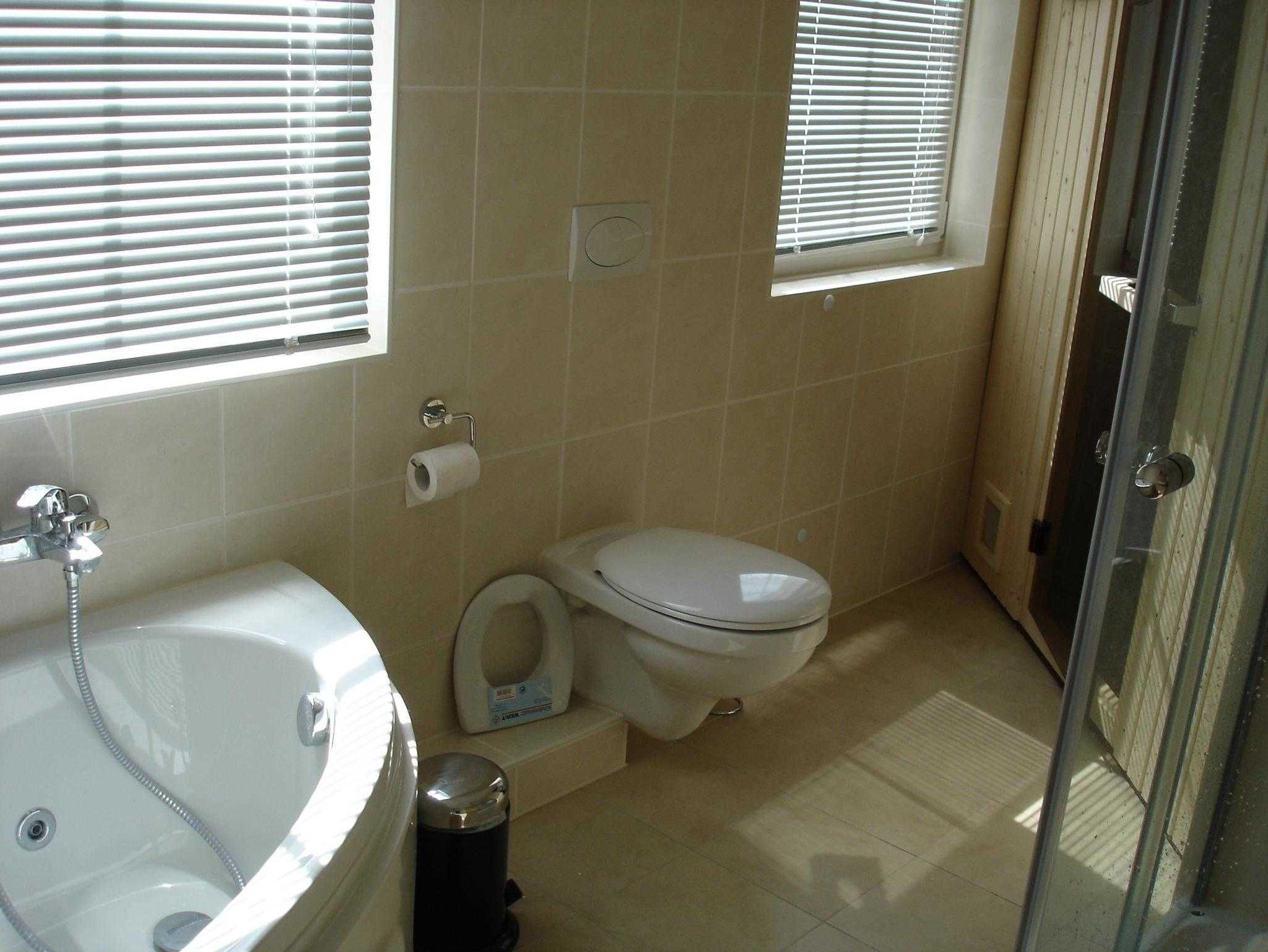 Bad mit Dusche, WC, Waschplatz, kleiner Whirlpool und Sauna.