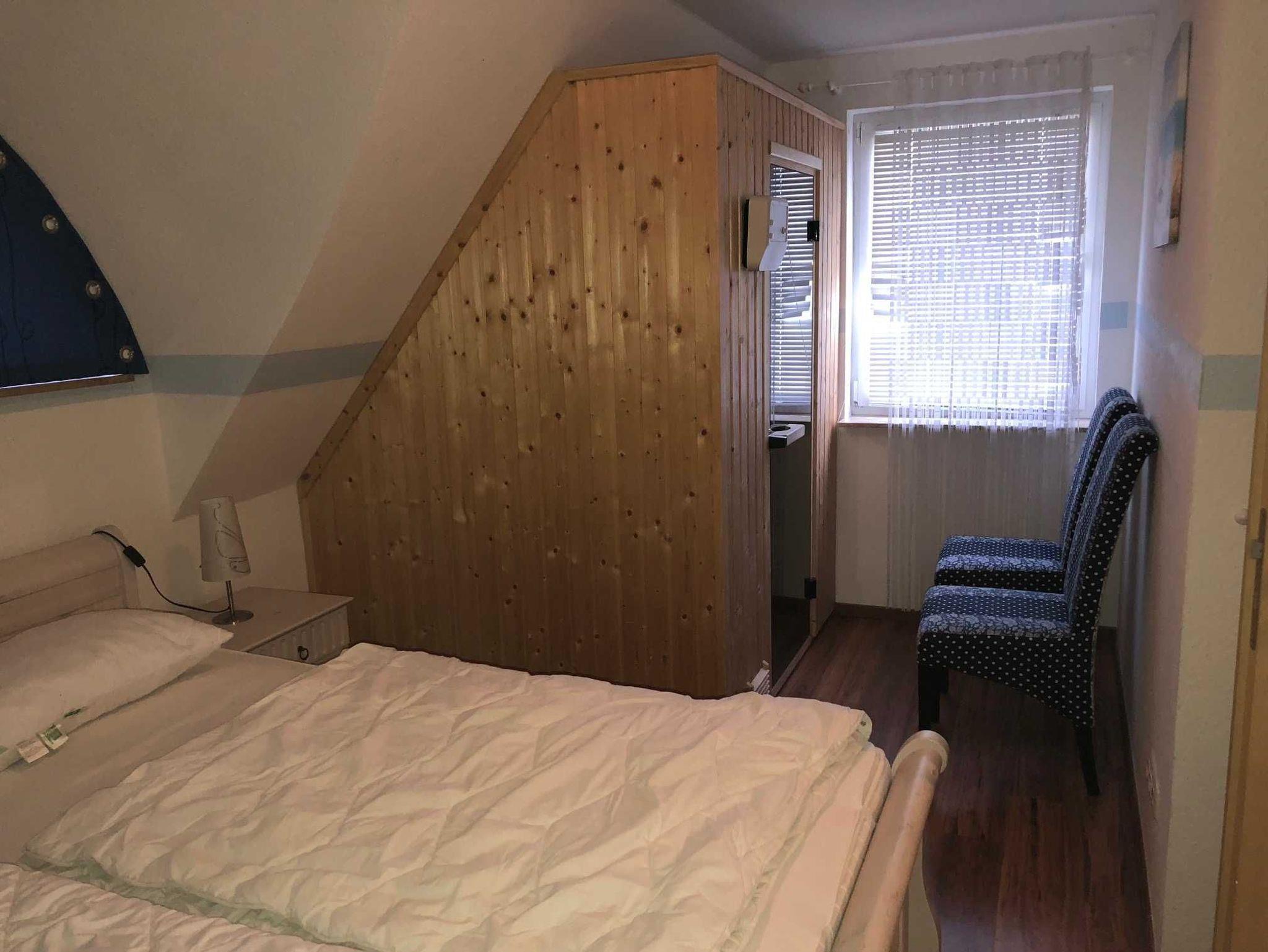 In der Haushälfte Boddenblick, links befindet sich im Bad mit Dusche, WC, Waschplatz, kleiner Whirlpool auch eine Sauna.